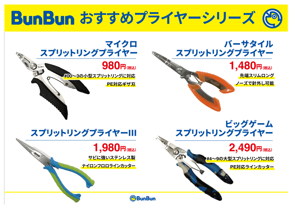 小物 用品 2025.05.29 プライヤーシリーズ BunBunおすすめのプライヤーシリーズ‼ 全4種類!✨ 皆さんの釣りをもっと便利に、もっと楽しくするブンブンオリジナルアイテム! 最新情報は公式Instagramをチェック!