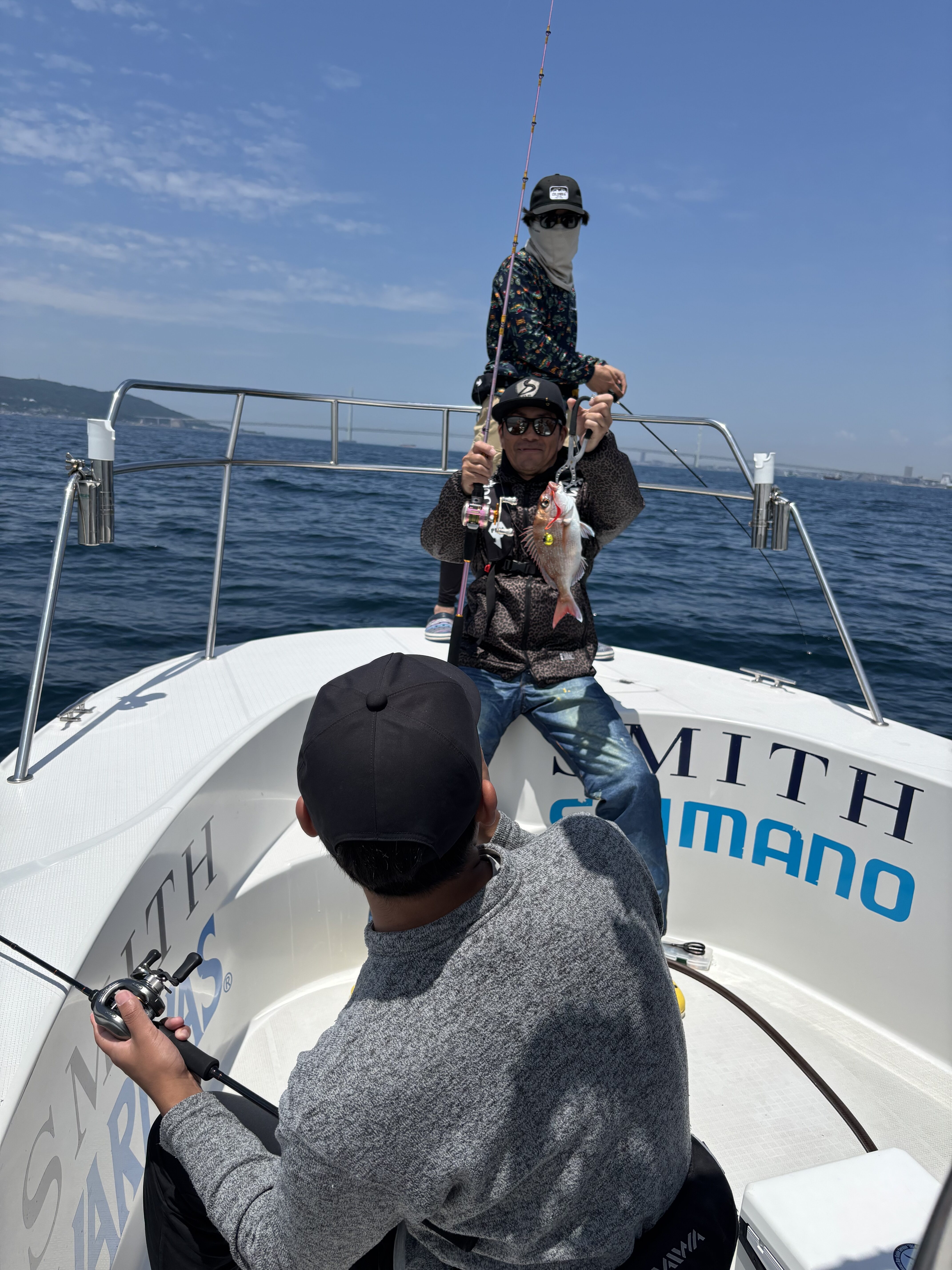 船長や同行者の梅田店佐々木主任に教えてもらい釣りスタート。どうやらタイの捕食レンジはベタ底のようで着底から10〜12巻き距離にして5〜6メートルのところであたりがあるようです。