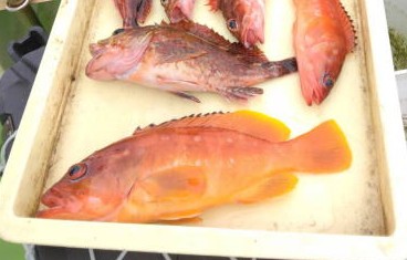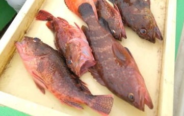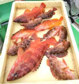 ハタ・カサゴ混じりで4〜12匹(船宿さんのホームページ)。カサゴが6〜7割程度、それにアカハタ主体にハタ族などが混じる感じ。