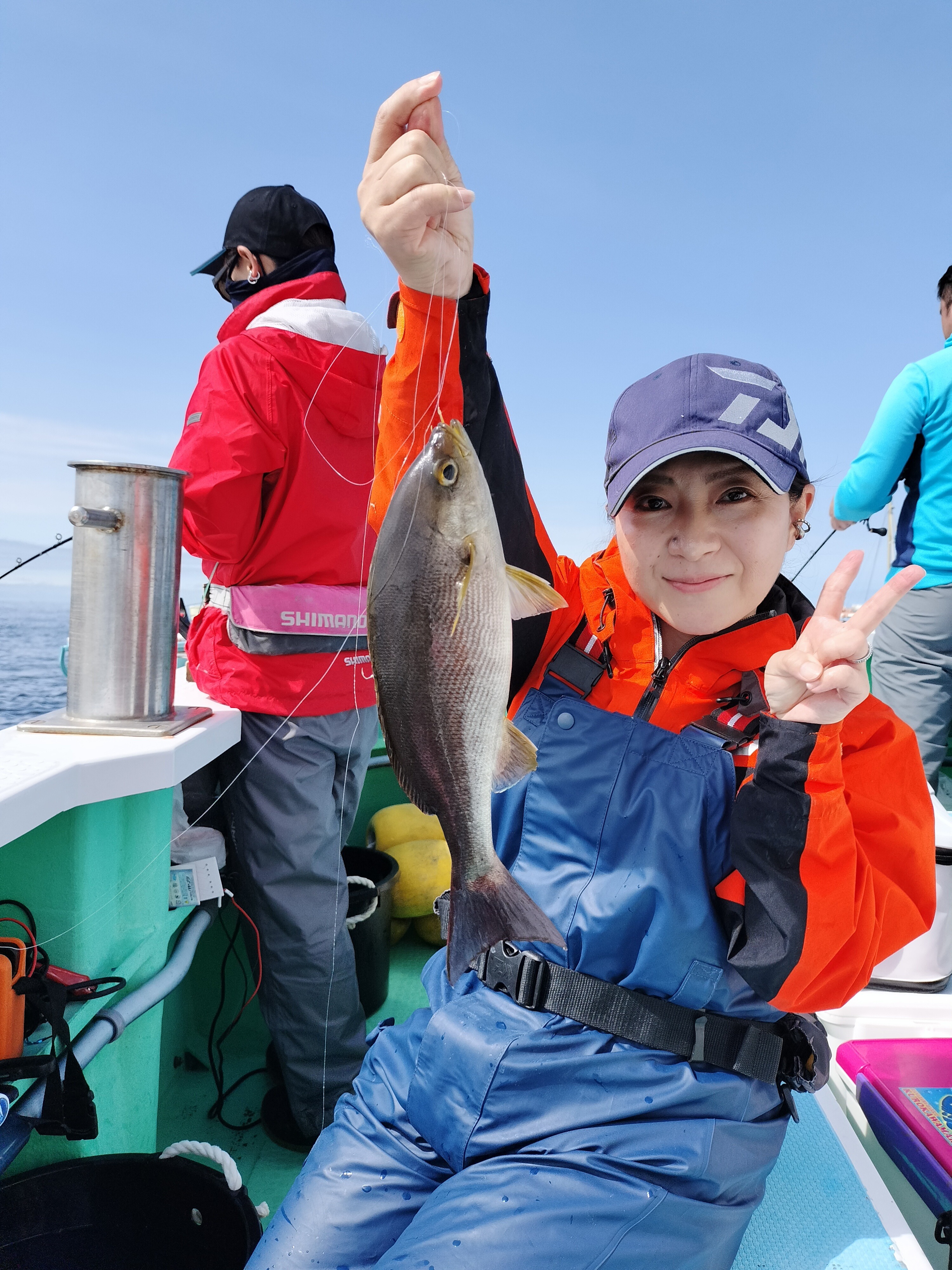 私のお隣のお兄さんが上手にぽつりぽつり釣っていくので真似してアクションかけて……カラー針の全てにオキアミ付けて何とかかんとか2匹プラス。