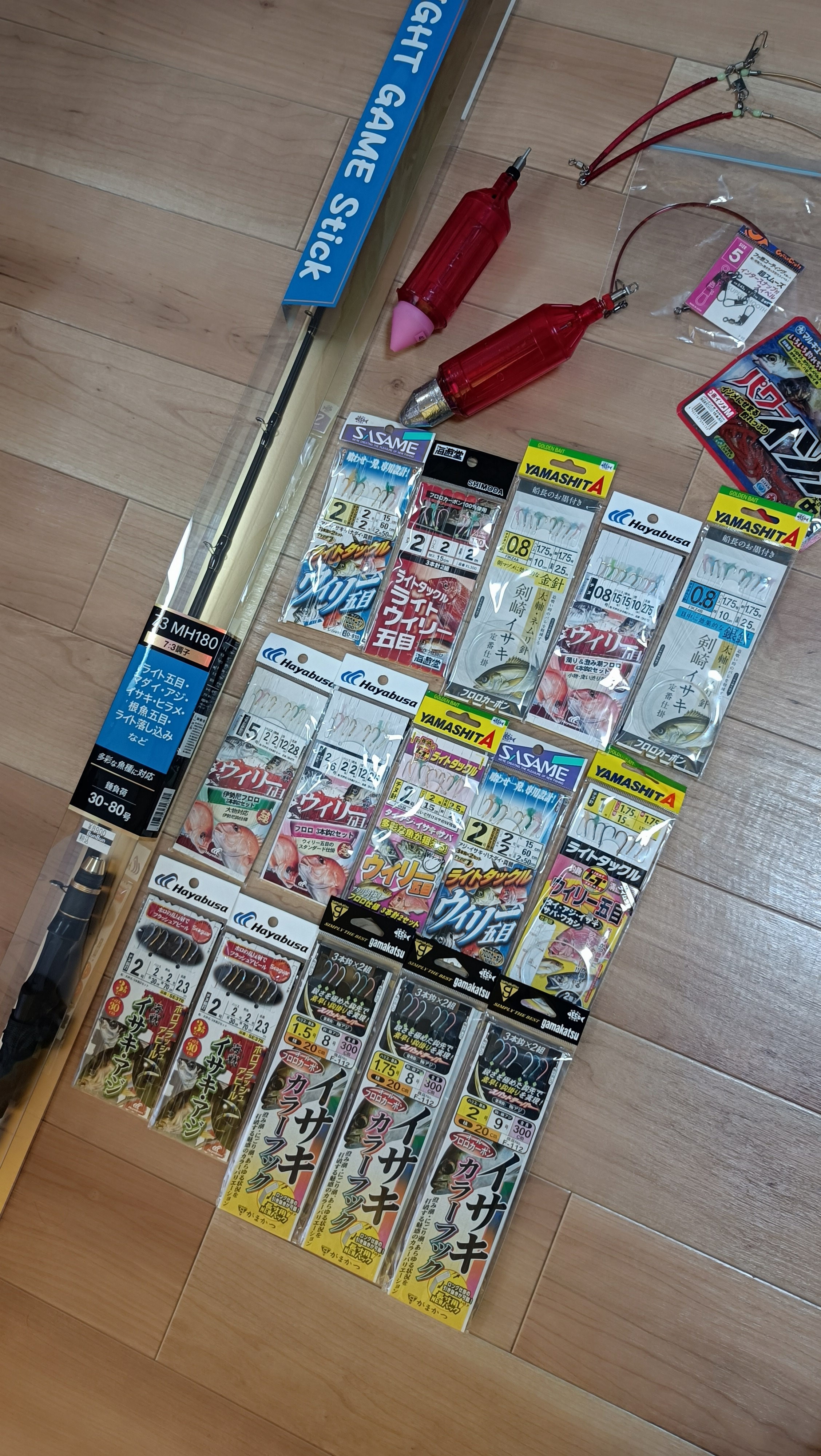 用意した竿・ビシ・仕掛け(遠投カゴ釣りに用意してるお気に入りのイサキホロフラッシュ針単体と同じ針仕様の仕掛けを特に使用しました)