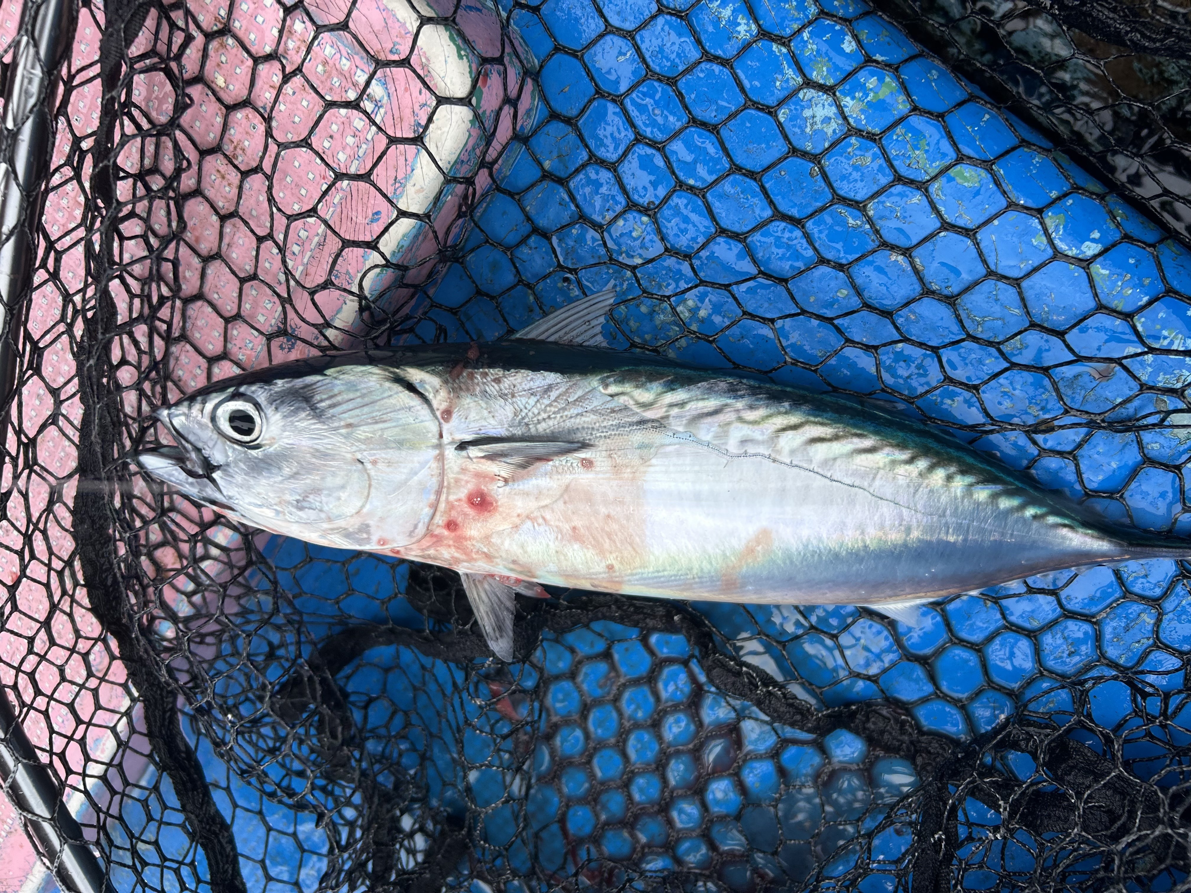 再びフカセ仕掛けのラインがバチバチッ!と弾け飛び、魚がヒット!まず顔を見せたのは45cmのサバでした