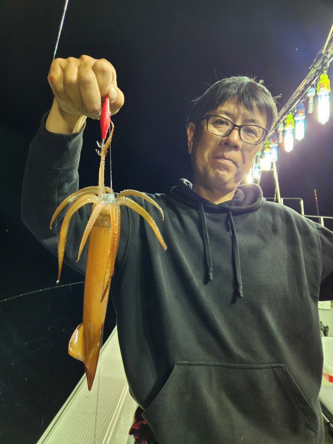 ポイントの水深は90メートル、まずはボトムを丹念に探りますが、アタリ無し💦そこからライトが効きだすと周りでポツポツ釣れだし自分にも待望のアタリが🤩上げてくると良型のスルメでした😊スルメはよく引き楽しいですね😊