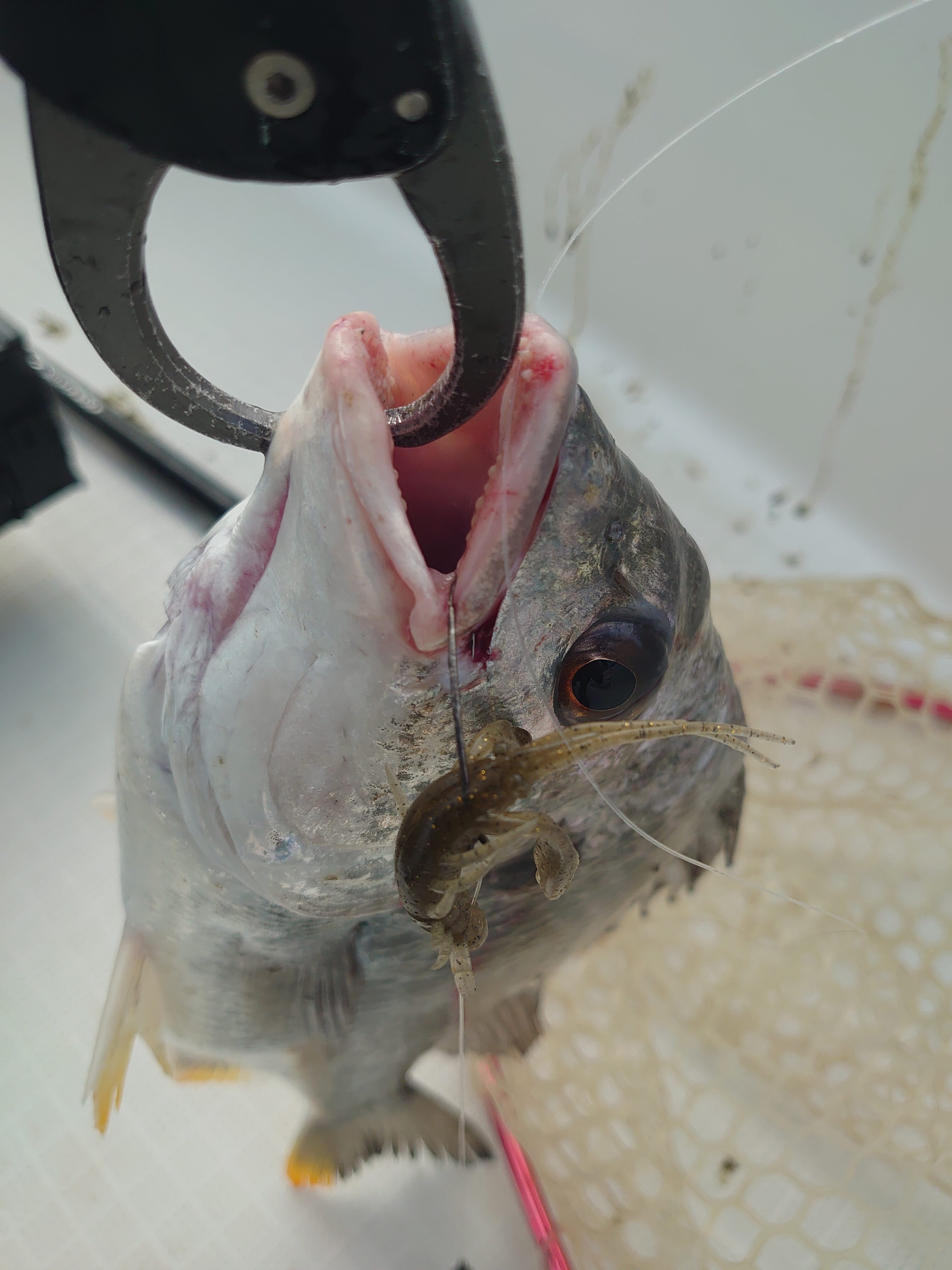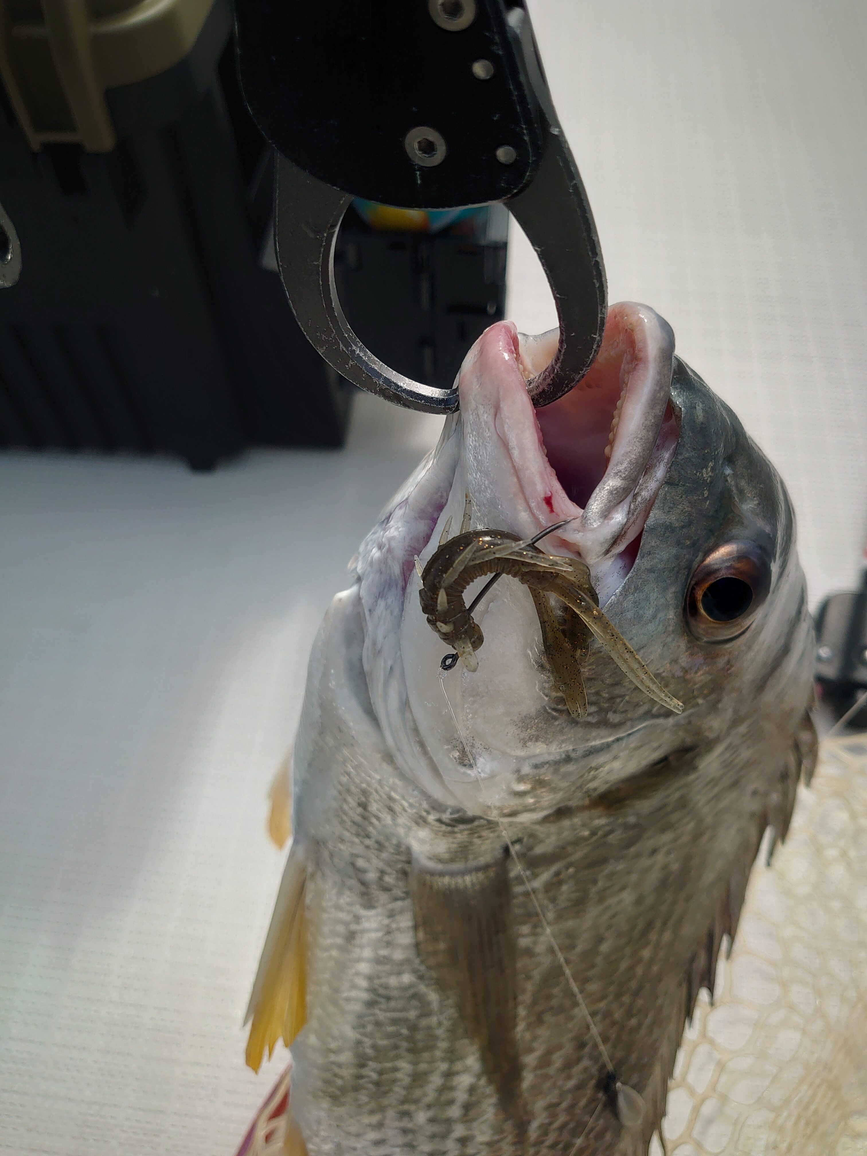2025.06.09 印刷する ボートチニング釣行! 魚種 クロダイ/チヌ 数 チヌ・キビレ15,6匹 釣り方 ☆チニング 場所 神奈川県 天候 晴れ スタッフ 一橋碧志 店舗 川崎大師店 釣行日 2025.06.04 コメント 皆さんこんにちは!川崎大師店のスタッフ一橋です! 今回もスタッフ吉村とオレンジフィッシングボートさんに乗船しボートチニングに行ってきました! 実は午前中に隣マリーナで船タコに挑戦してからの午後はチニング釣行となっております!ヘトヘトですが気合いを入れていざ出航!! 前回とは明らかに違う程の透明具合。少しでも濁りが入っている所を探していきます。第一ポイントへ。 壁際にキャストし落として行くと、ボトム着底と同時にバイトがありましたが全く育たずでフッキング出来ません。 タダ巻きでも反応が悪くどうした物かとやっていると、石﨑船長からスイミングパターンかもとの事でコツを教わり(簡単に言うとテンションフォール)見様見真似でやっていくとバイトの嵐!!さっきまでが嘘みたいにバイト連発です! ポイントも移動し、スイミングしますが反応悪ければタダ巻きでコンスタントに釣っていきます。濁りが入ってる場所はほとんど行き、濁り求めてロングラン! 最終的には前回と同じくらいの15,6匹程でした! まだまだチニングの奥深さを知った釣行でまた一つレベルアップ出来ました💪 チニンガーの方はぜひオレンジフィッシングボートさんに乗ってみて下さい!! 使用した釣具 リール シルバーウルフSV TW ロッド シルバーウルフEX76MLB-S ライン バリバス4 0.8号 リーダー フロロ20lb 2ヒロ