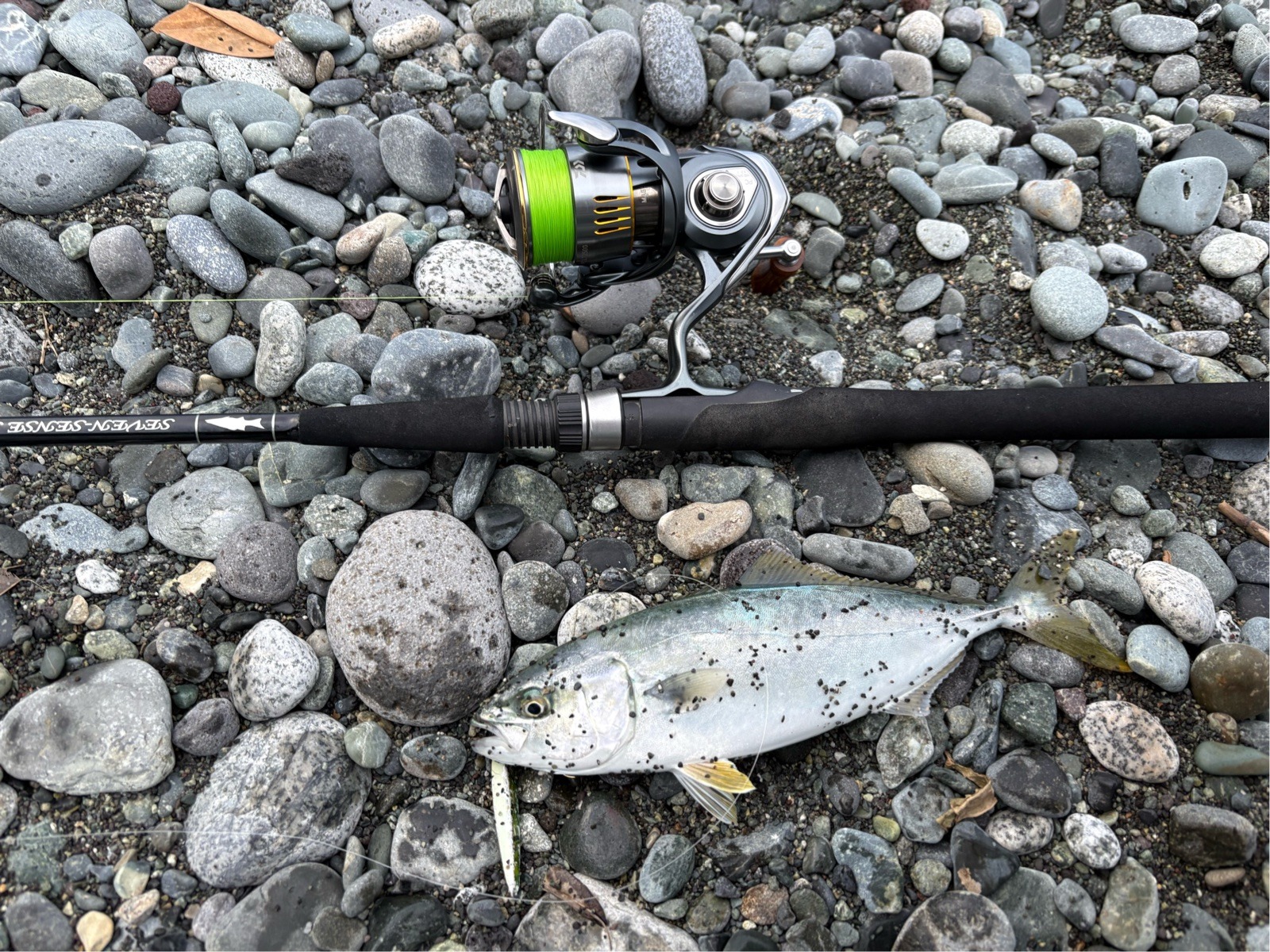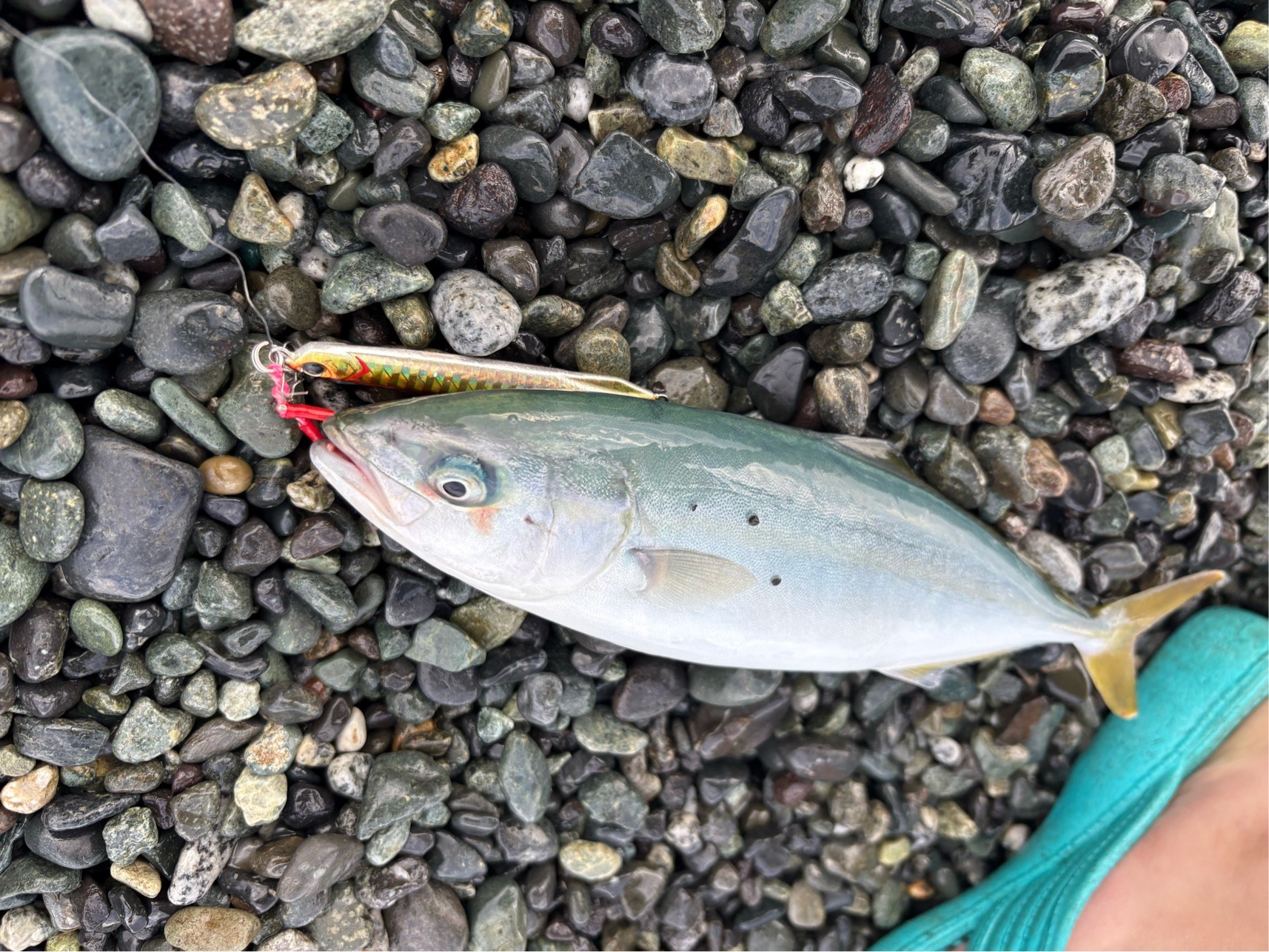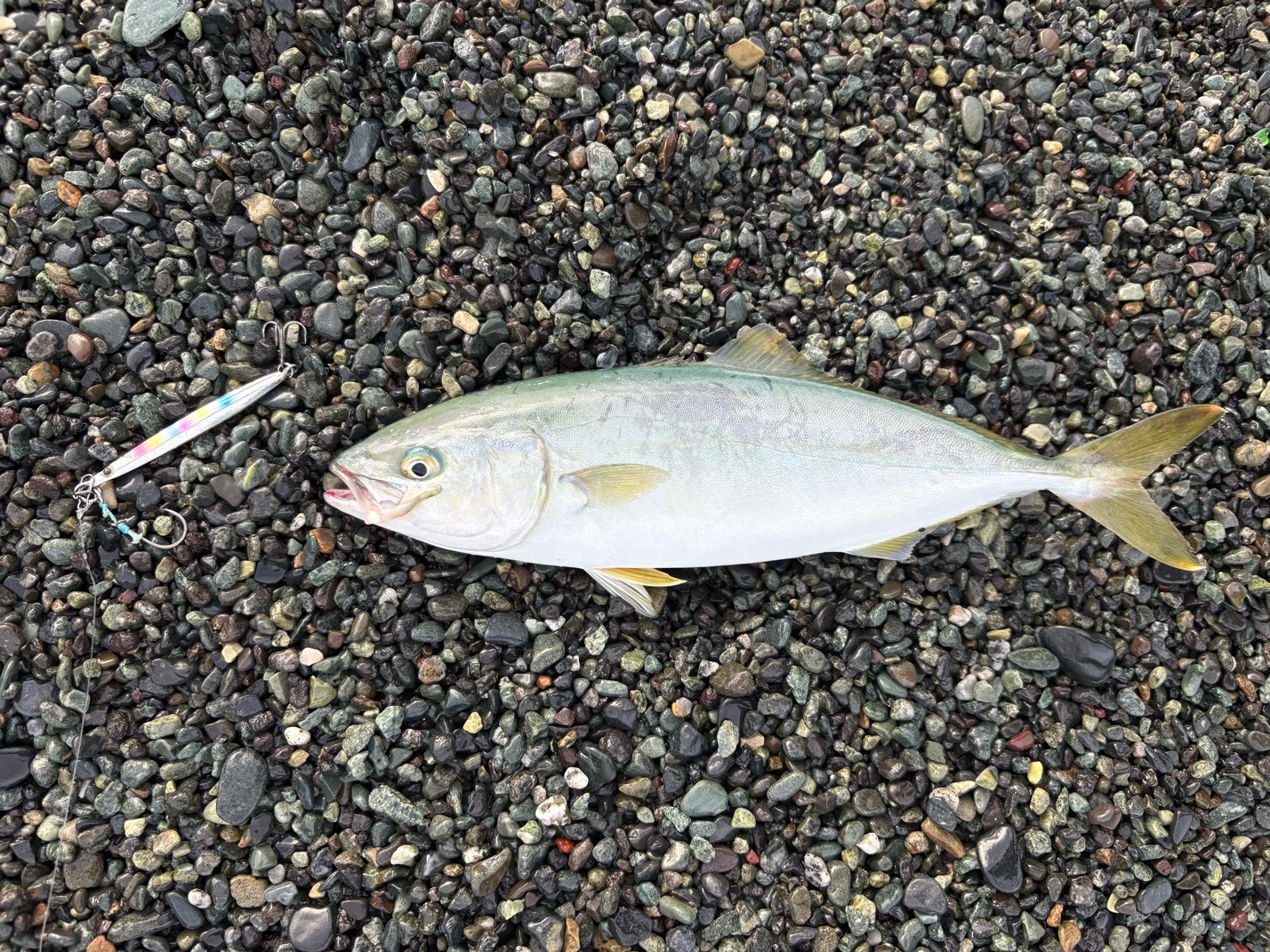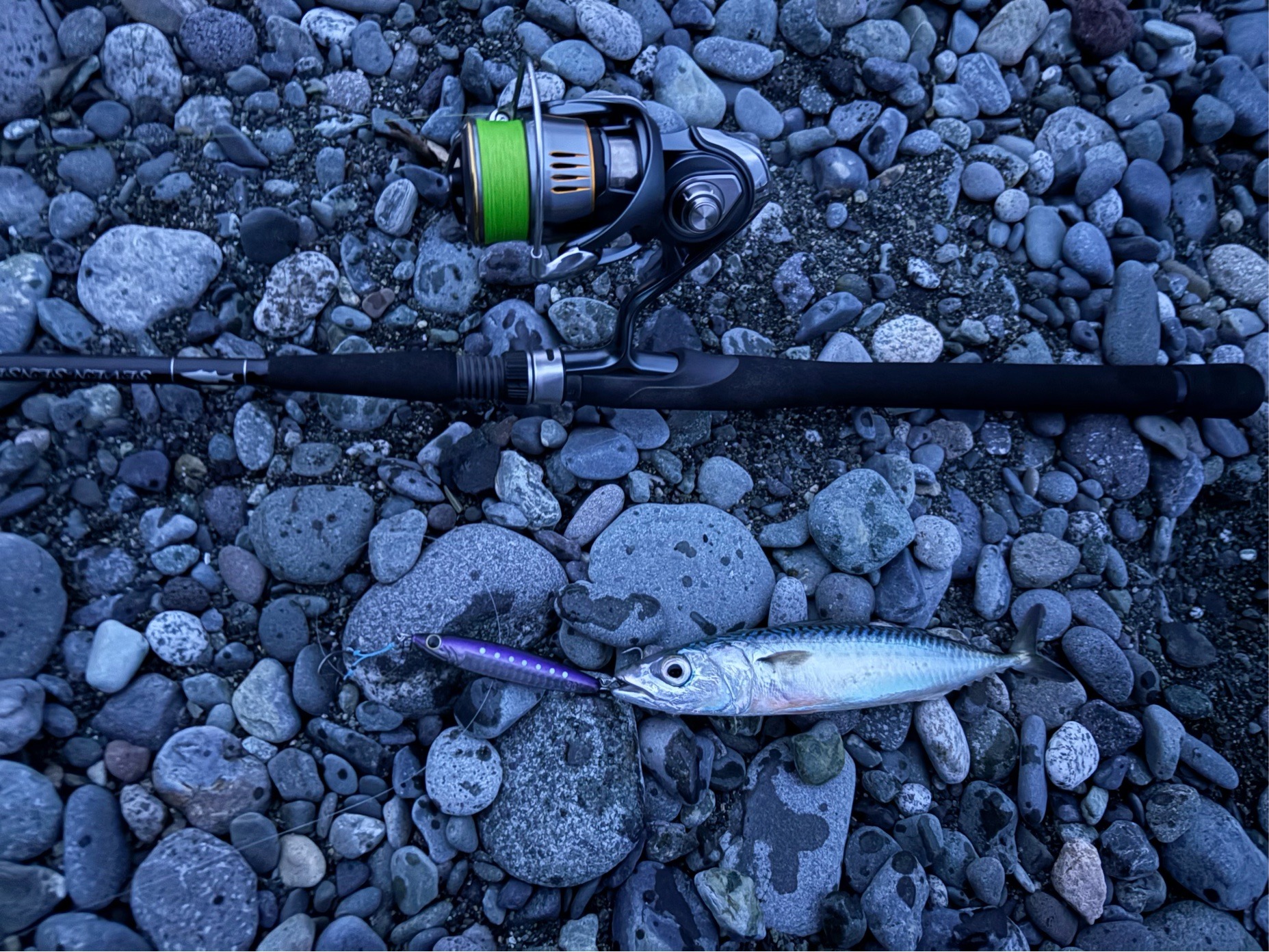 その後小鯖を1匹追加。 明るくなってきたところでワカシ狙いに切り替え、20gでコンパクトシルエットのジグにルアーチェンジ。