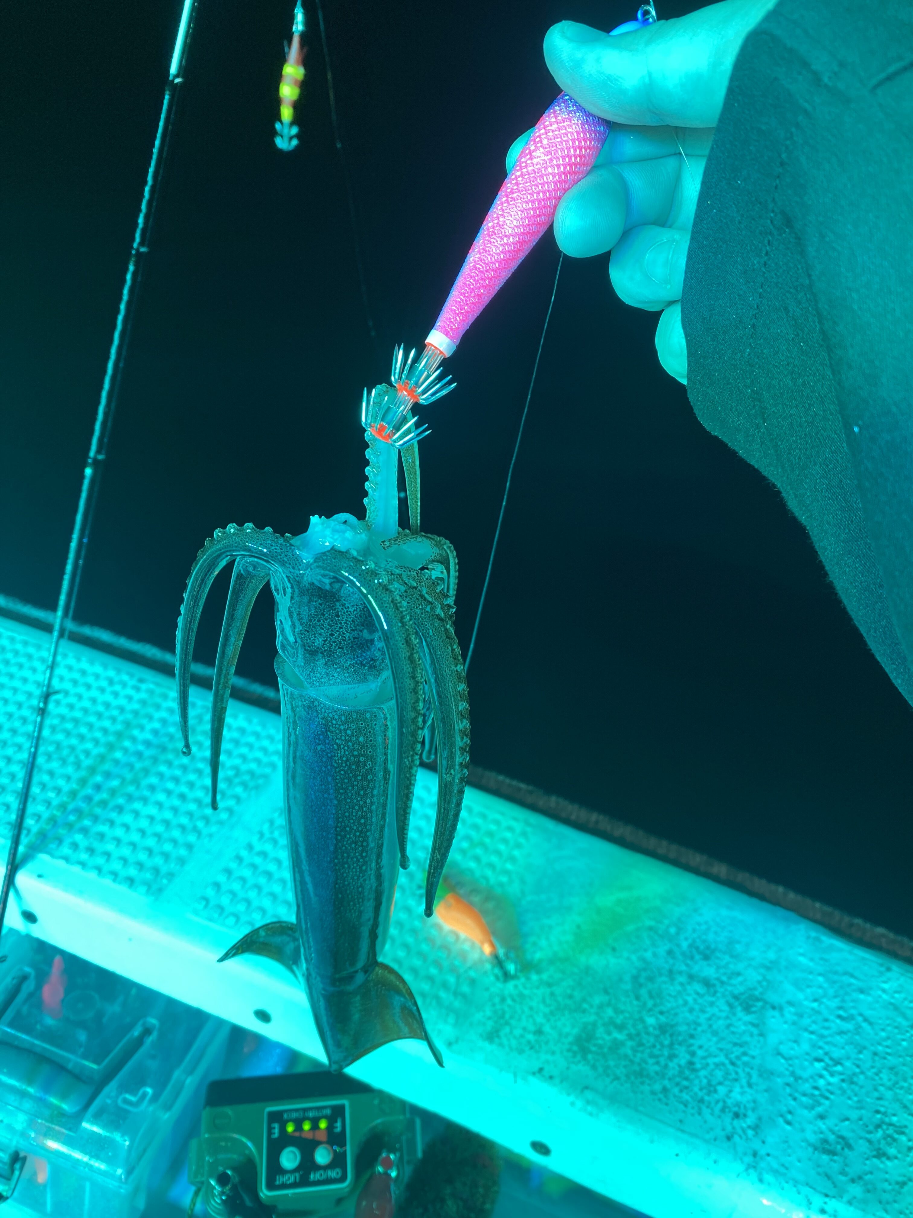 水深80m付近で大きくしゃくった後のステイ→誘い下げにあたり‼️デュエル四つ目スッテ25号(日中ピンク)ほんとよく釣れるカラー🩷