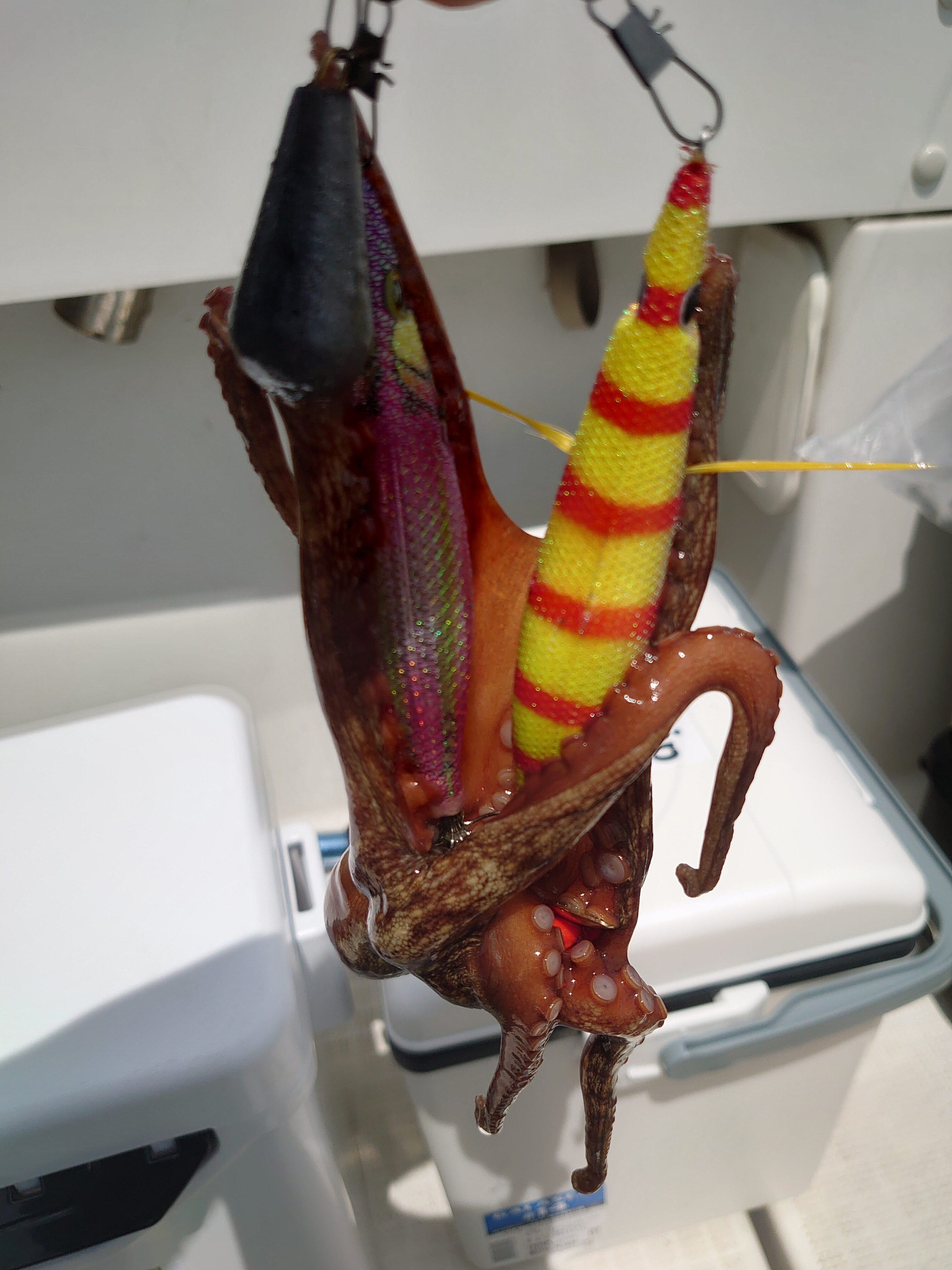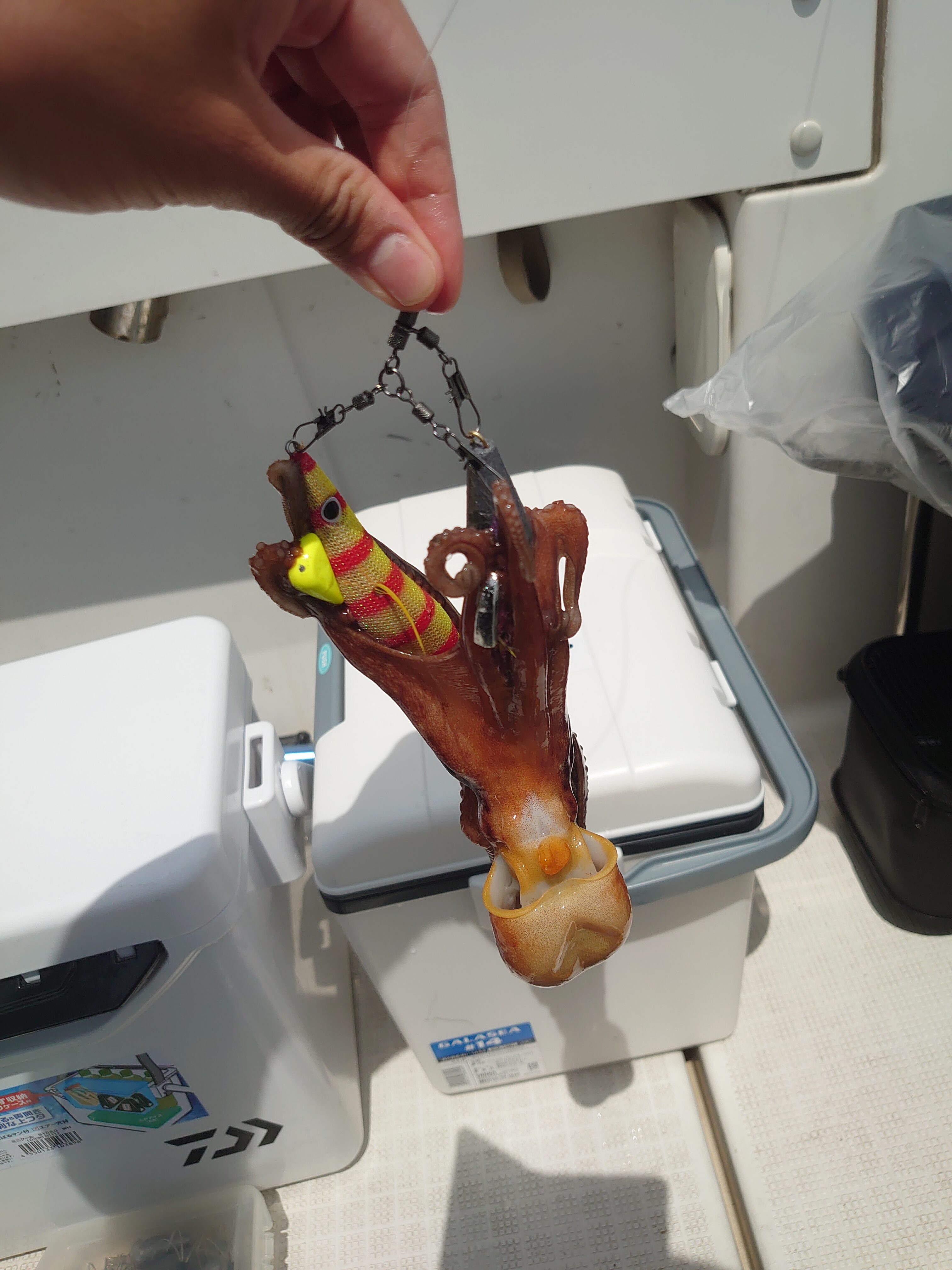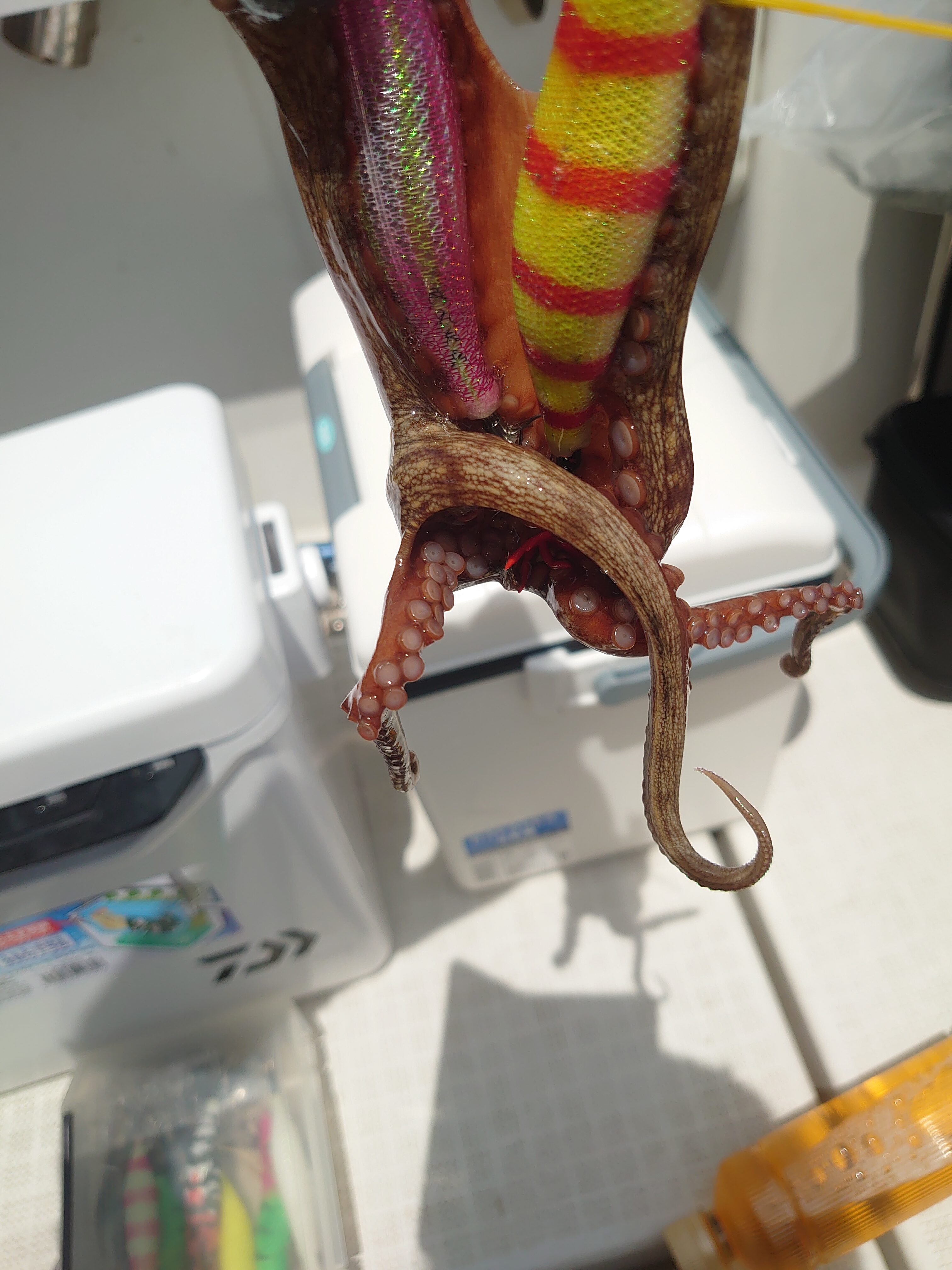ポイントに着いて1投目、船長にアドバイス頂きシンカーをトントントントンしていきます…すると…ヌッと急に重くなり布に引っ掛かったような感覚が……。これはもしやとフッキングして巻いてくると立派なタコが釣れました!しかもフラッシュブーストのエギを抱いています!!効果絶大!?でした笑