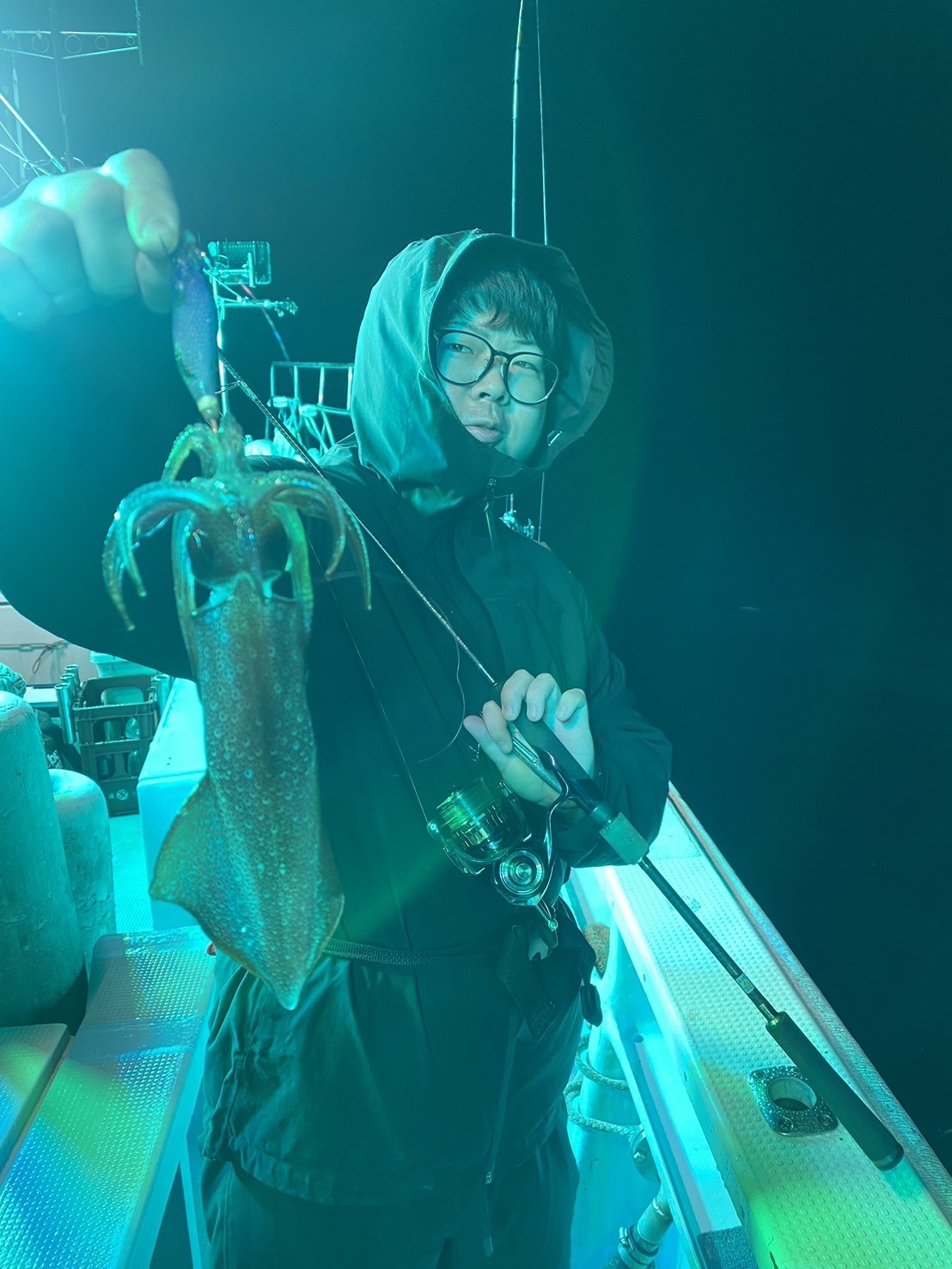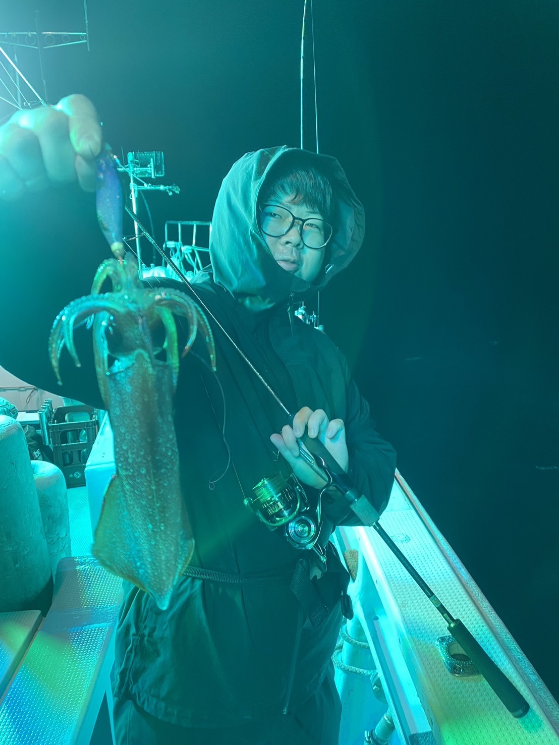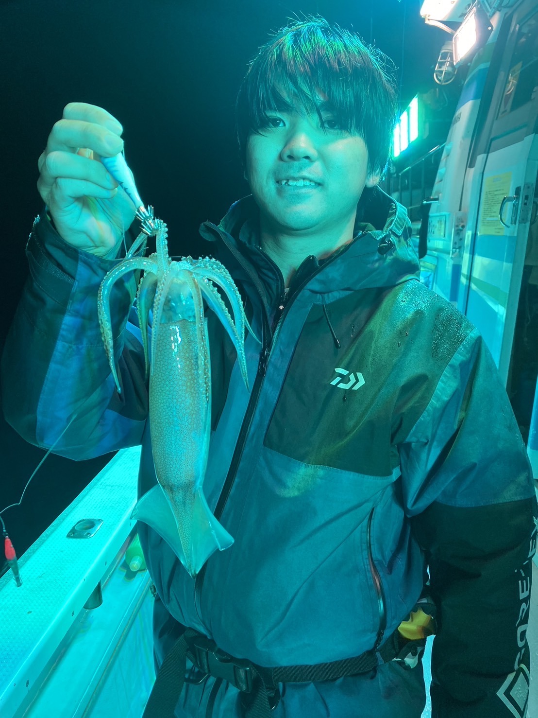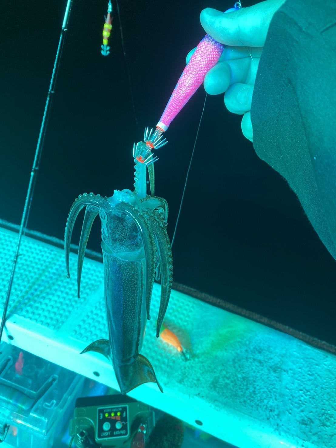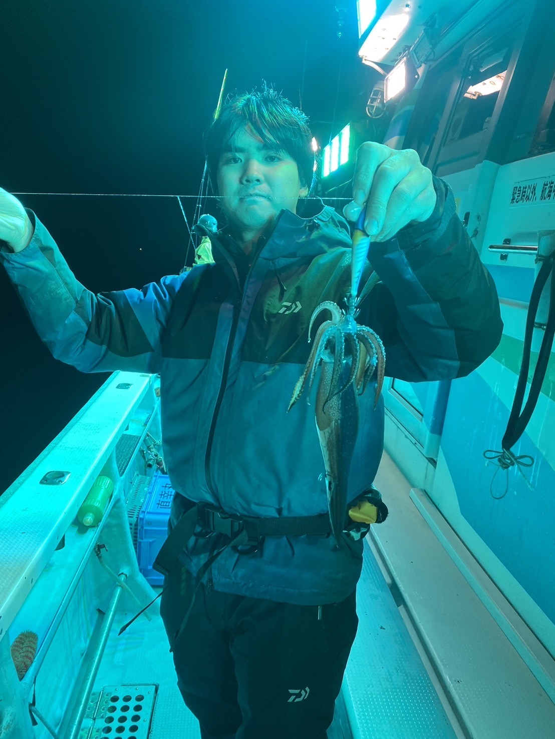 今井さんに誘い下げを丁寧にと教えていただきやってみるとフッと竿先のテンションが抜け、しっかり合わせて無事ヒット!いやーイカは嬉しいですねぇ!!
