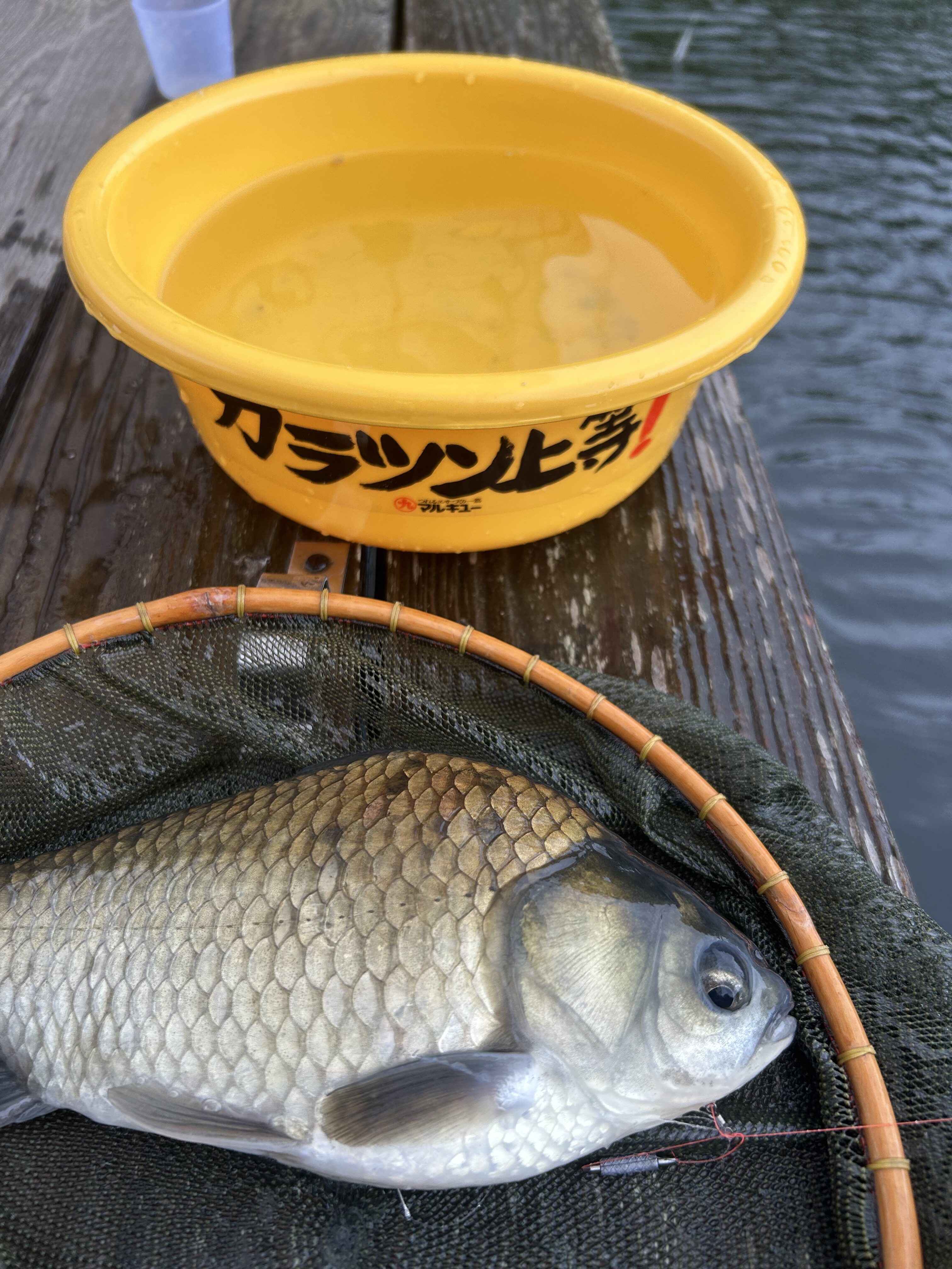 2025.06.11 印刷する 雨にも負けず風にも負けず豪雨のヘラブナ釣り 魚種 ヘラブナ サイズ 34cm 数 ヘラブナ/15匹 釣り方 ☆へら 場所 兵庫県 天候 雨 スタッフ 森下章広 店舗 関西 堺店 釣行日 2025.06.10 コメント 今日は朝から強い雨が降っていましたが、こんな時は決まってヘラブナ釣りです。 釣り人にとって雨予報は、「あー、明日は釣りは無理だな…」と落胆させるものですが、天神池のヘラブナ釣りは一部屋根付きの桟橋があり、雨が降っても楽しく釣りができます! 今回もいつもの場所を陣取りタナ1mで釣りスタートです。相変わらずヘラブナの活性は高く、数投エサ打ちをすればすぐさま反応がでます。 今日もまるまる太ったヘラブナが竿を存分にしならせてくれます。 雨の日は桟橋でお湯を沸かし、カップラーメンを食べながら同行者とも釣りや仕事の話をしながら、ゆっくりと時間を過ごします。 途中強いアタリがありましたが、あわせた瞬間道糸が切れてしまいました。やはりこまめに仕掛けはチェックすることが大切だと改めて痛感しました。 この時期は魚が集まりすぎることもあり、エサはバラけを抑えて少し粘りを出すことがポイントです。マルキューのカクシンはドンピシャのエサで最近のお気に入りです。 今日も存分に楽しませてくれたヘラブナに感謝し、帰路につきました。 使用した釣具 竿 シマノ 朱紋峰 凌 10尺
