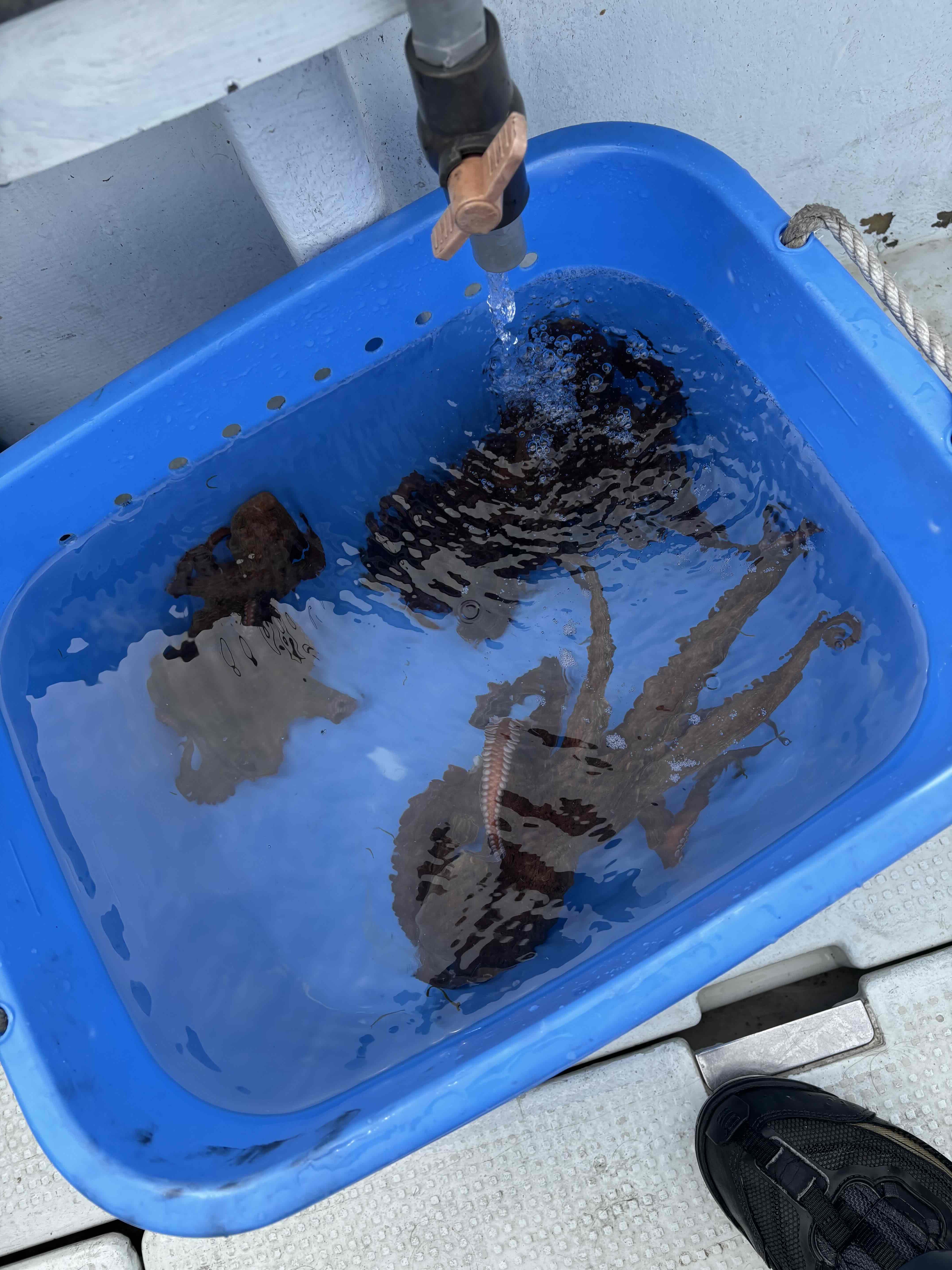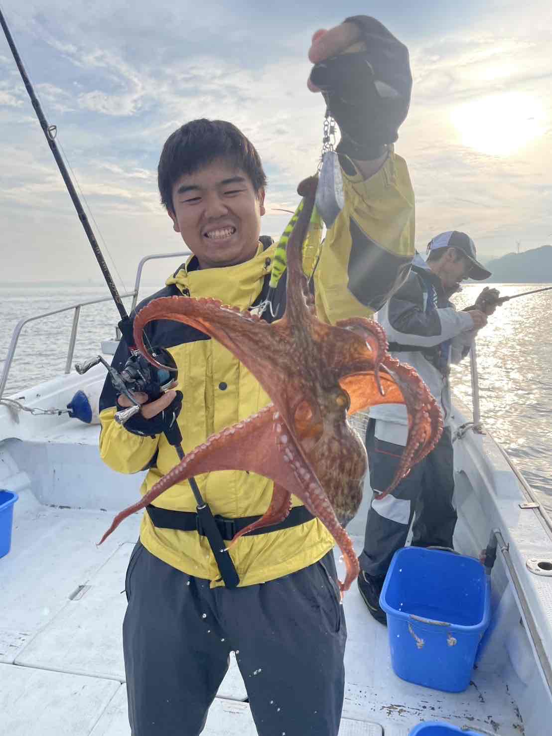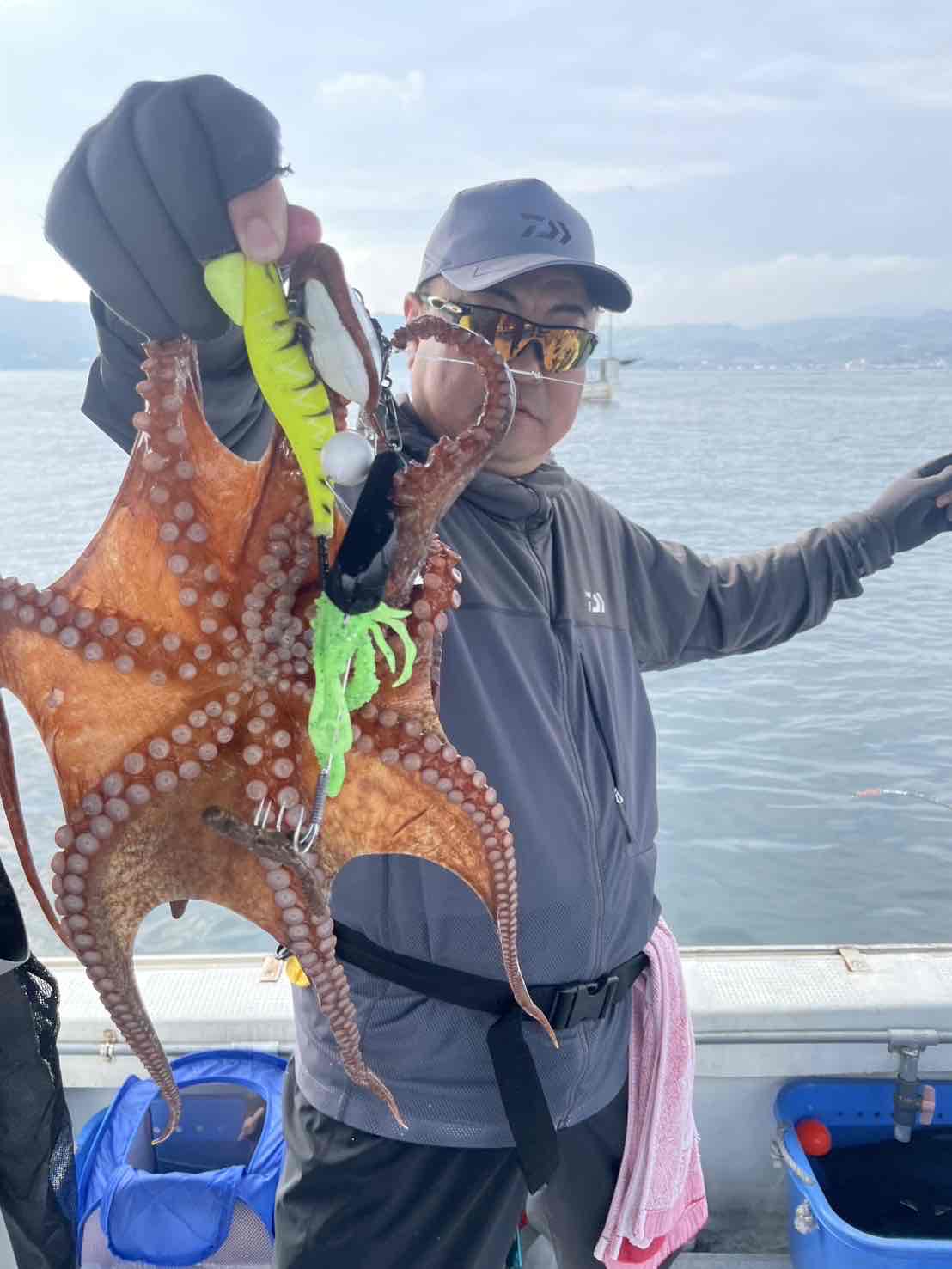 明石の船タコ釣り 今季二回目となる釣行 堺港出島からのジャックポットさんに行ってきました。スタッフお客様との釣行 ポイントまでは約1時間半 淡路沖では各船がタコを狙って集まっています。最初のポイントは水深30mライン タコ仕掛けをセットして投入 小刻みに動かしながらタコを狙っていきます。船中早速タコを釣り感じの良いスタート 潮もお昼前には早くなり釣果が悪くなるので早めに釣果を上げたい感じです。竿先に重さを感じるアタリ?さらに待って合わせで重さが乗ります、上がってきたのは中型サイズ、400~800gサイズが多く釣れています。よくバラシが多いと聞いていたので遅いアワセでしっかりフッキングを心がけていましたが、巻き上げ中に軽くなる、フッキングしても重さが乗らないなど多数。ポイントも浅い7mラインにも行きましたが潮も速く釣りにくい、なかなかヒットもせず またポイントも深い40mまで戻ってするも小型が多くなってしまいました。大型1キロオーバーも上がってはいるので期待して釣りするもこの日は中型サイズのみとおなりました。 エギでの良いポイント スッテタイプが良いポイントとはっきりした一日だったように思います。 デビルクラッカーでもよく乗っていました。仕掛けの交換タイミングが釣果を上げるコツだった釣行となりました。