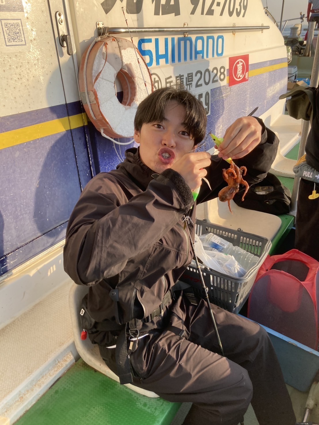 朝イチから出船して、最初のポイントでは潮の流れも緩く、タコの反応も良好でした!丁寧にボトムを探っていると穂先が「ググッ」と重たくなるような押さえ込まれる感触、「これか‼︎」とフッキング。無事に人生初のタコをゲットしました!