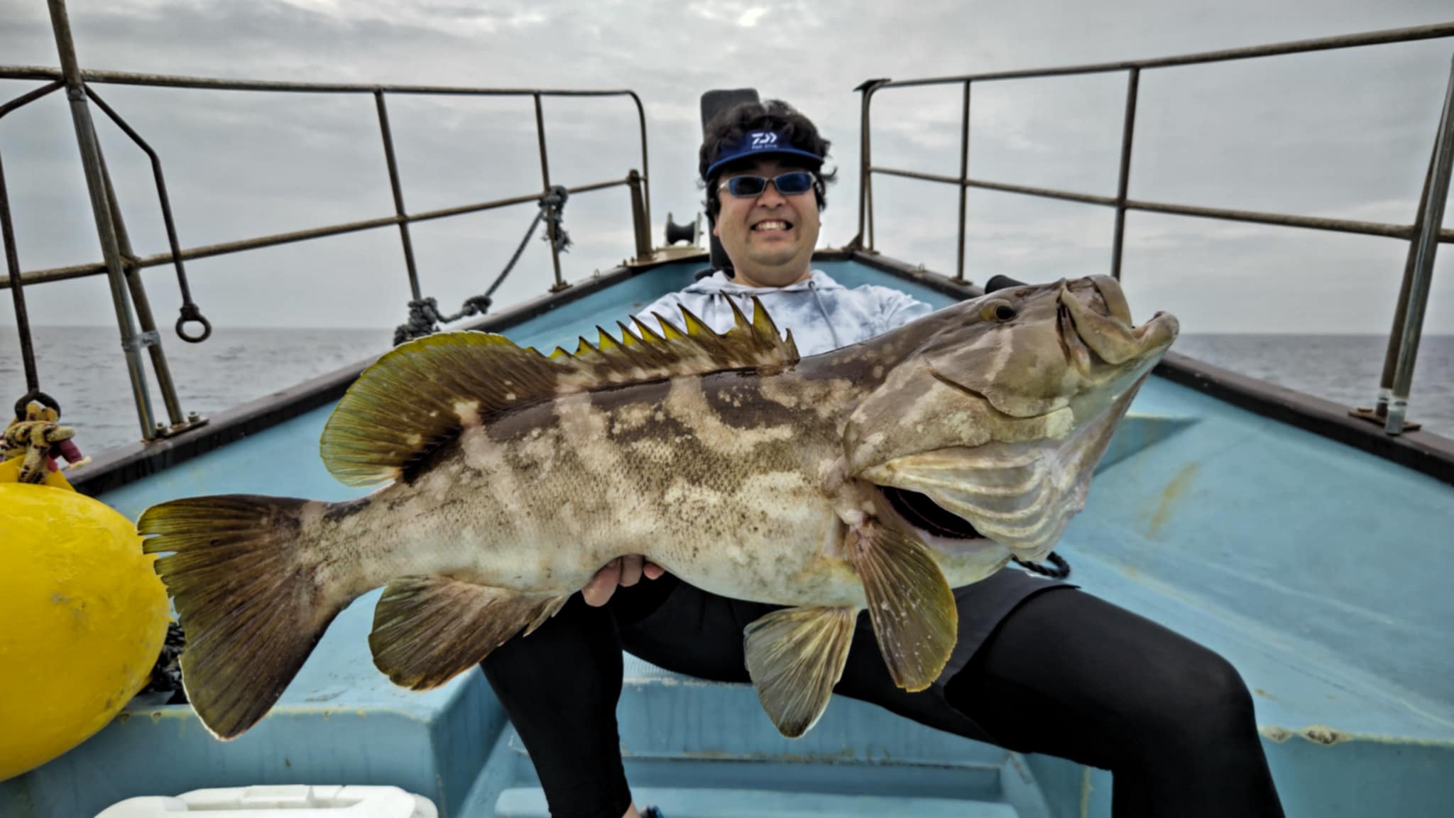 2025.06.16 印刷する 室戸大物遠征へ 魚種 カンパチ クエ/モロコ 釣り方 泳がせ釣り 場所 高知県 スタッフ 平山 武 店舗 リンクスウメダ店 釣行日 2025.06.12 コメント 毎年恒例の室戸遠征へ!二日間の予定でしたが、初日は荒天により中止に🌊翌日は風も波も収まり無事に出船お世話になったのは満兵衛丸さん 本命はクエ、カンパチですが、ここ最近室戸で釣れているデカいウメイロもターゲット🎯数日前には入れ食い状態だったということで期待も高まります! ですが、蓋を開けてみるとウメイロはおろか、餌となるムロアジやサバも釣れない厳しい状況💦どうしようかと思っていたら、船長が生簀に以前釣っていたグルクンを入れていたそうなのでそれを使わせていただき泳がせ釣りスタート! 投入して早々に底付近で暴れるグルクン集中して穂先を見つめ続けるとバタバタと激しく動く穂先サメやろ!の船長の言葉通りファーストヒットはサメ🦈 まだグルクンはいたので、気を取り直して泳がせ再開すると底を取って仕掛けを巻き上げてる最中に竿先ズドン!残念ながら針掛かりしなかったですが、餌を丸ごと持っていかれていますサメであればエサを真っ二つにされて戻ることがあるのでコレは怪しい…グルクンも少なくなってきた頃、再びバタバタと暴れるグルクン仕掛けを落とし直し、底から3m巻いた直後に竿先ズドン!今度は上手くフッキングし巻き上げ!上がってきた魚は待望のクエ!サイズは大きくありませんでしたが、数年ぶりのクエメチャクチャ嬉しい!✨ その後、もう一つのターゲット、ウメイロもポツポツと掛かり目的は達成! 他にオナガグレやメイチダイなども掛かり満足の釣行となりました! 上野船長1日ありがとうございました! 使用した釣具 ロッド 剛樹 スタンディングアーバスMR17 リール シマノ ビーストマスターMD6000