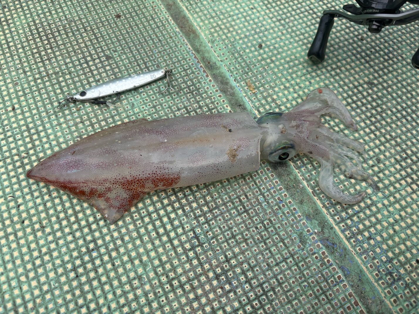 流す場所を変えても、やはりワームは1発でやられてしまうのでジグの巻きで追加していきます。 ジグはしゃくっても反応悪く、釣れるのはフグかエソ、本命は圧倒的にただ巻きかストップ&ゴーに反応がいいです。