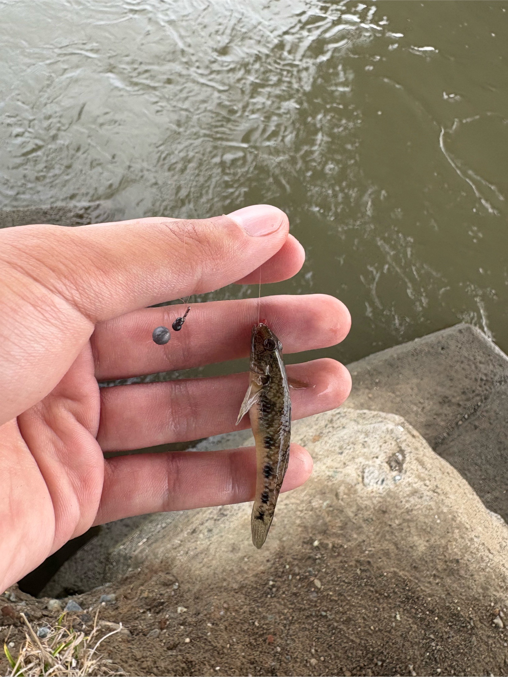 流れで餌が動きすぎないようガン玉を追加し、とりあえずあちこちのテトラの隙間に仕掛けをうちこんでいくと、ききあげた際にずっしりとした重みが!