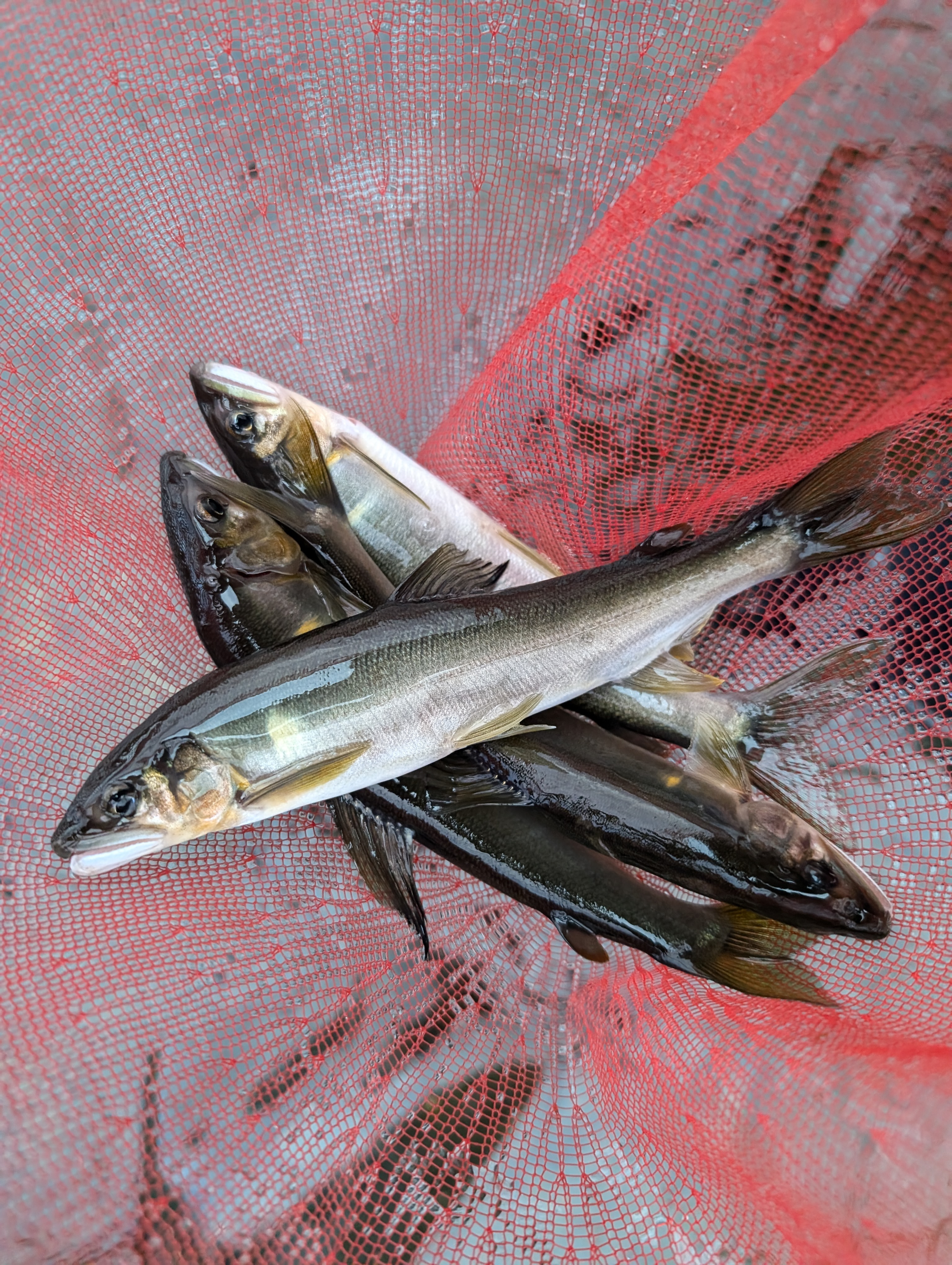 2025.06.16 印刷する 2025年鮎釣り2回目IN相模川リニア下 魚種 アユ/鮎 数 鮎 17cm 2匹 釣り方 友釣り 場所 関東 神奈川県 天候 曇り スタッフ 丸田泰助 店舗 関東 イオン相模原店 釣行日 2025.06.13 コメント 今年初めての相模川へ釣行。天然遡上中心の河川なので例年ならお盆ぐらいから通うようになるのですが、解禁後の状況を知りたかったので、いつもの「高田橋友鮎販売所」へ昼頃に向かいました。年券とオトリを購入して状況を聞くと、今年はちょっと鮎が少なそうですが、その分サイズが例年よりいいとのこと。なかでも上大島の「リニア下」で20cm前後のグッドサイズ混じりに釣れているとのこと。早速現地に向かうと教えてもらった場所だけ人がいっぱい。釣れそうな場所に入れそうなスペースがないので、微妙な場所に入ってしばらく泳がせで狙いますが反応なし。天気も曇りで昨日より気温も低いので活性が低い様で、釣れそうな場所に入っている人たちも殆ど竿が曲がっていません。トロ場で1時間以上粘って反応がなかったので、オトリに余裕はないですが荒瀬が空いていたので突入。30分ぐらいしてやっと17cm位の鮎をキャッチできました。がそこからまた1時間後ぐらいに同サイズを1匹追加しましが、コケて上半身まで濡れてしまって寒くなったので16時で納竿しました。鮎ルアーもするので、様子見にちょこちょこ釣行しようと思います。 使用した釣具 竿 ダイワ ギンエイエアショートリミテッドMT 87M + 専用SMT穂先 仕掛け がまかつ アーマードF+プロ0.06号 針 オーナー こだま7.0号3本錨