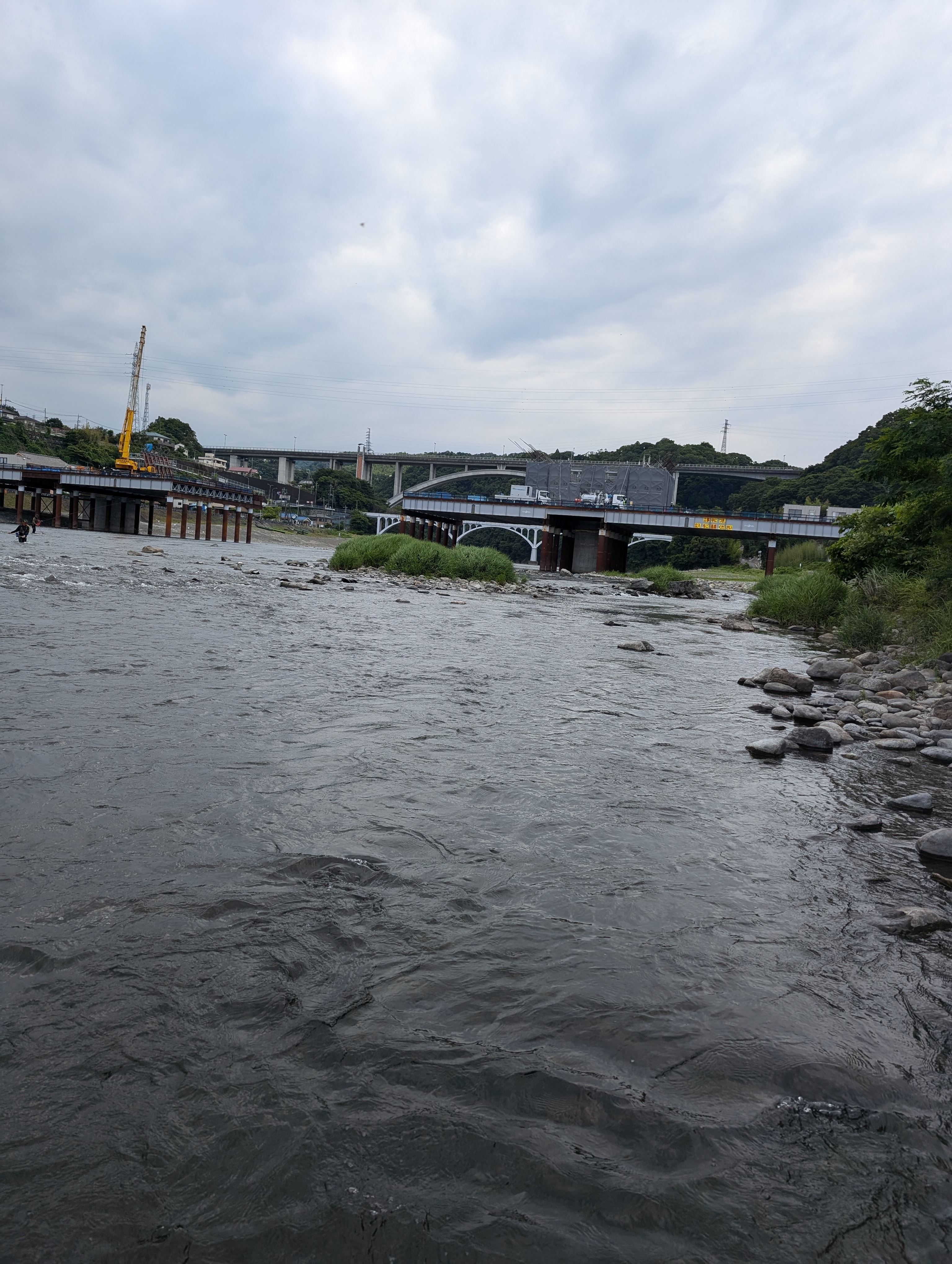 今年初めての相模川へ釣行。天然遡上中心の河川なので例年ならお盆ぐらいから通うようになるのですが、解禁後の状況を知りたかったので、いつもの「高田橋友鮎販売所」へ昼頃に向かいました。年券とオトリを購入して状況を聞くと、今年はちょっと鮎が少なそうですが、その分サイズが例年よりいいとのこと。なかでも上大島の「リニア下」で20cm前後のグッドサイズ混じりに釣れているとのこと。早速現地に向かうと教えてもらった場所だけ人がいっぱい。釣れそうな場所に入れそうなスペースがないので、微妙な場所に入ってしばらく泳がせで狙いますが反応なし。天気も曇りで昨日より気温も低いので活性が低い様で、釣れそうな場所に入っている人たちも殆ど竿が曲がっていません。トロ場で1時間以上粘って反応がなかったので、オトリに余裕はないですが荒瀬が空いていたので突入。30分ぐらいしてやっと17cm位の鮎をキャッチできました。がそこからまた1時間後ぐらいに同サイズを1匹追加しましが、コケて上半身まで濡れてしまって寒くなったので16時で納竿しました。鮎ルアーもするので、様子見にちょこちょこ釣行しようと思います。