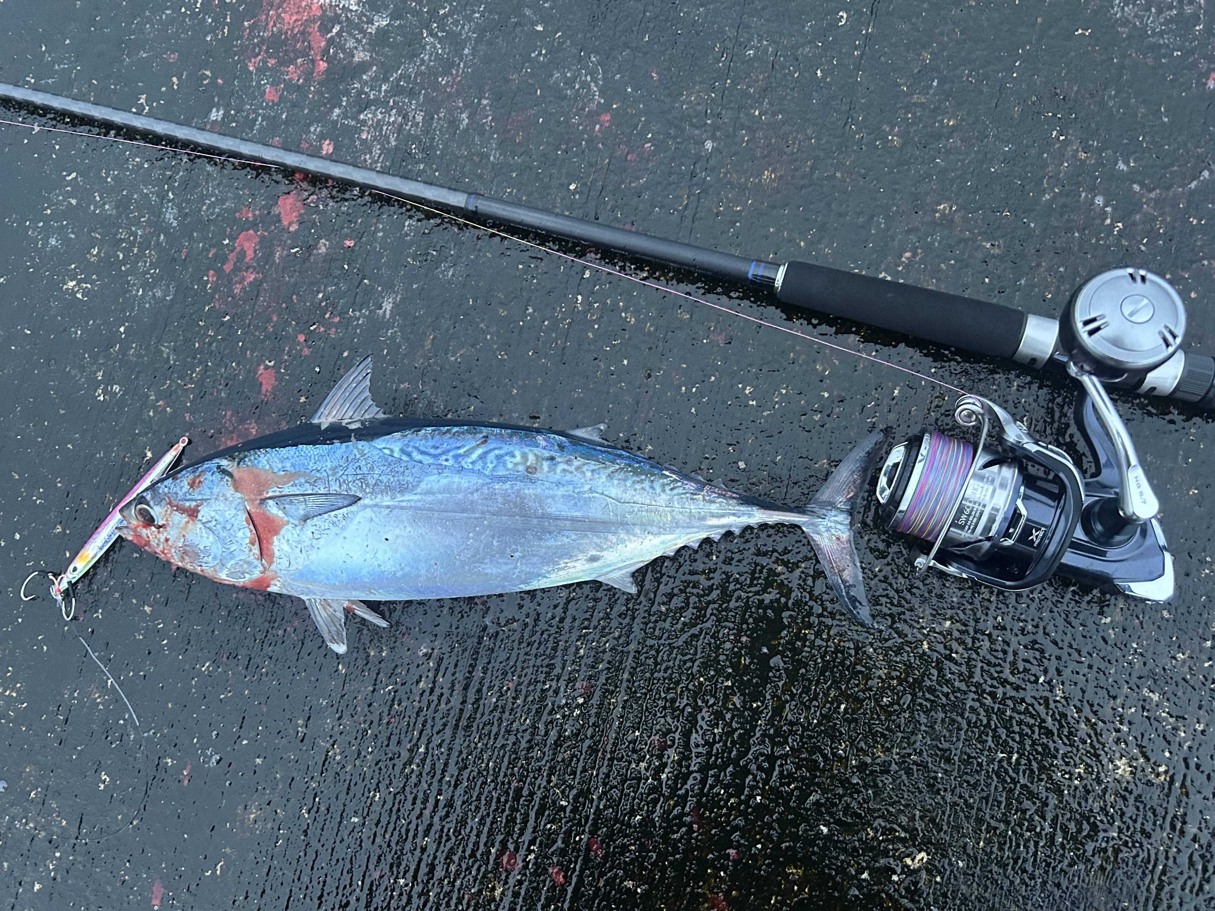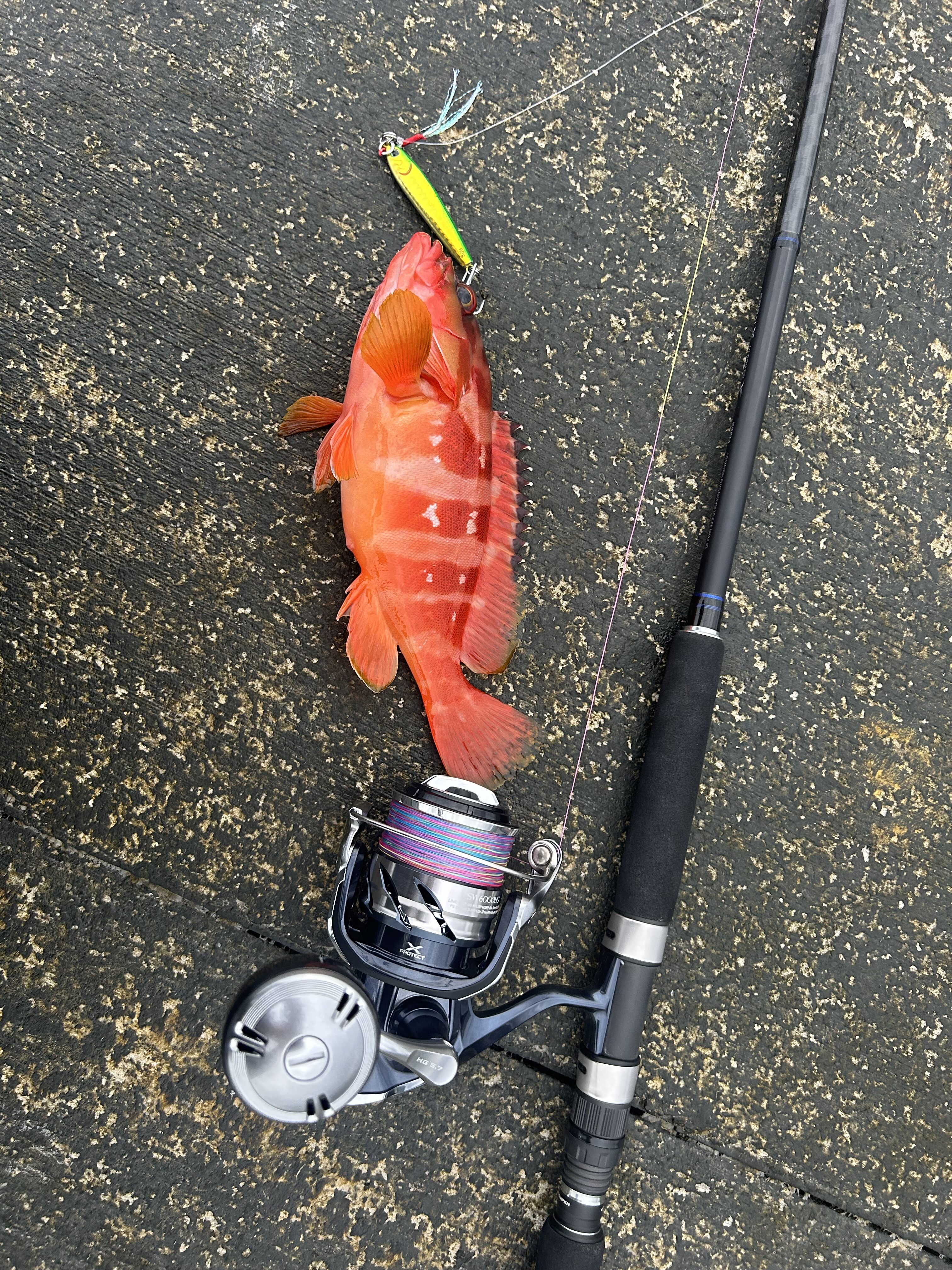 2日目は、4時からルアーで狙います。同行者にスマガツオとカンパチがヒット。私はアカハタが釣れました。