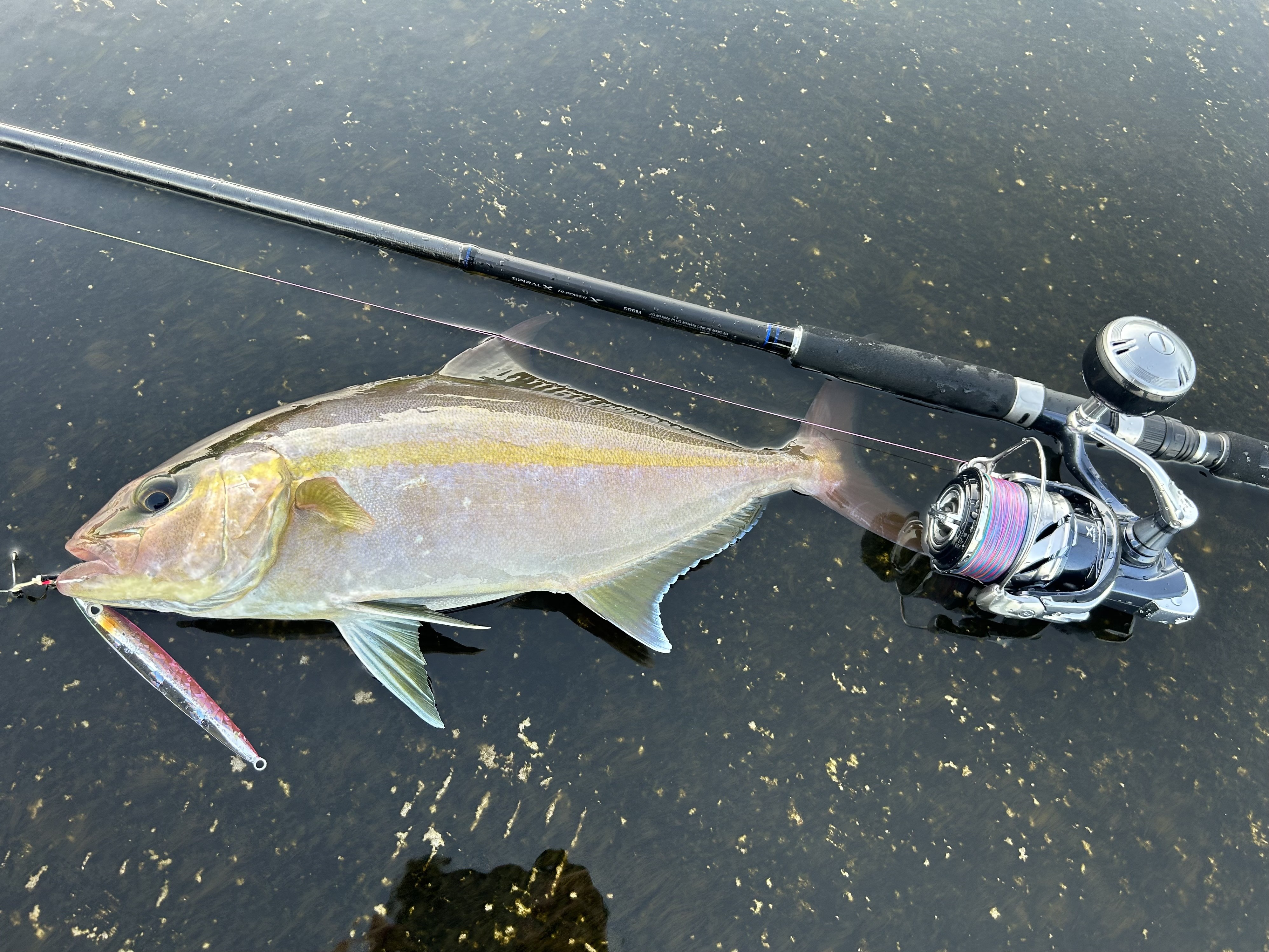 神津島はかなり流れが強いので、強めのタックルに重めのジグがいいですね。潮が動くタイミングは、80gのジグでちょうど良かったです。