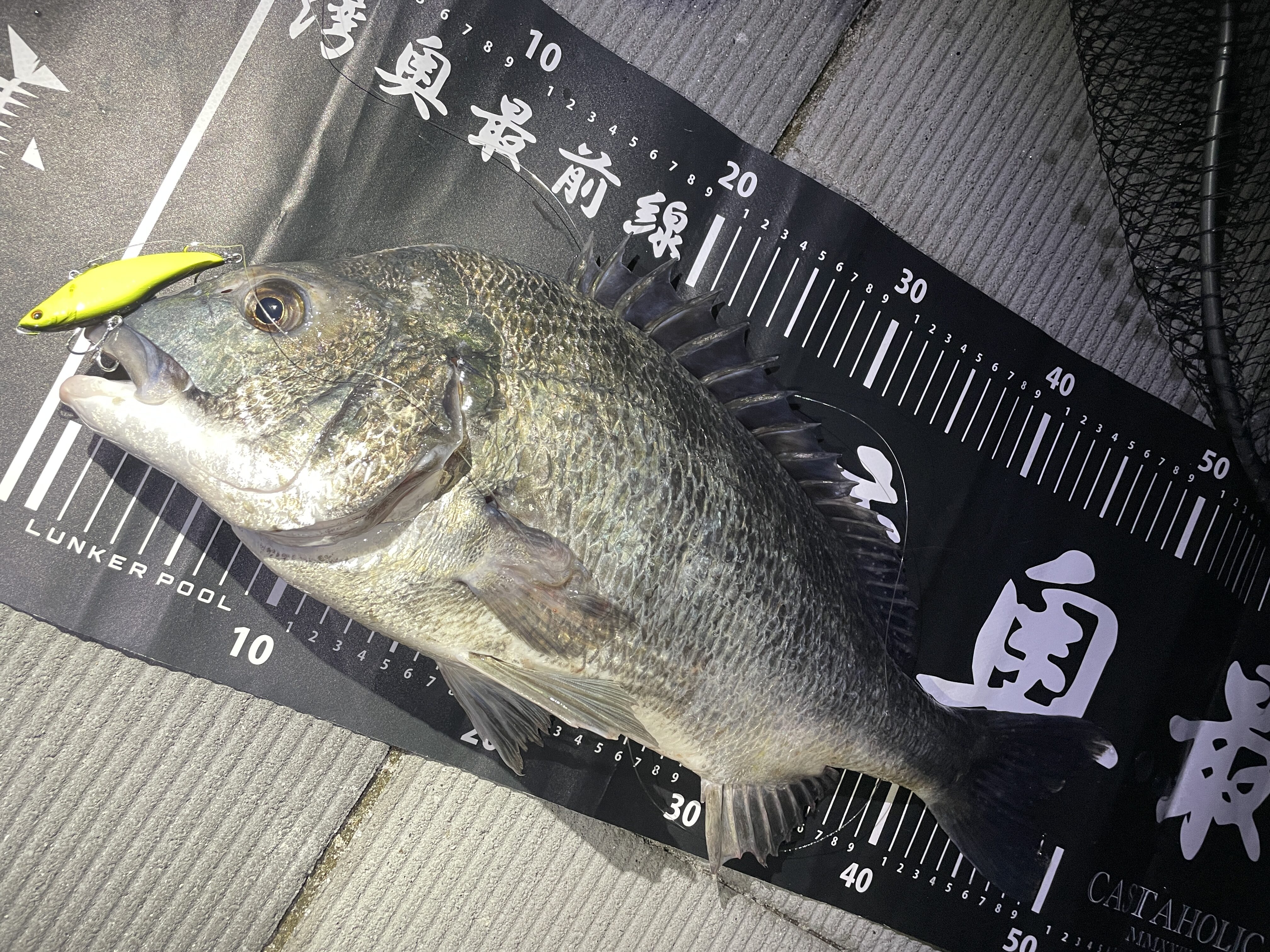中々の引きで、ジャンプもしたのでシーバスかと思いましたが、引き方でチヌと分かりましたが、無事にキャッチ!