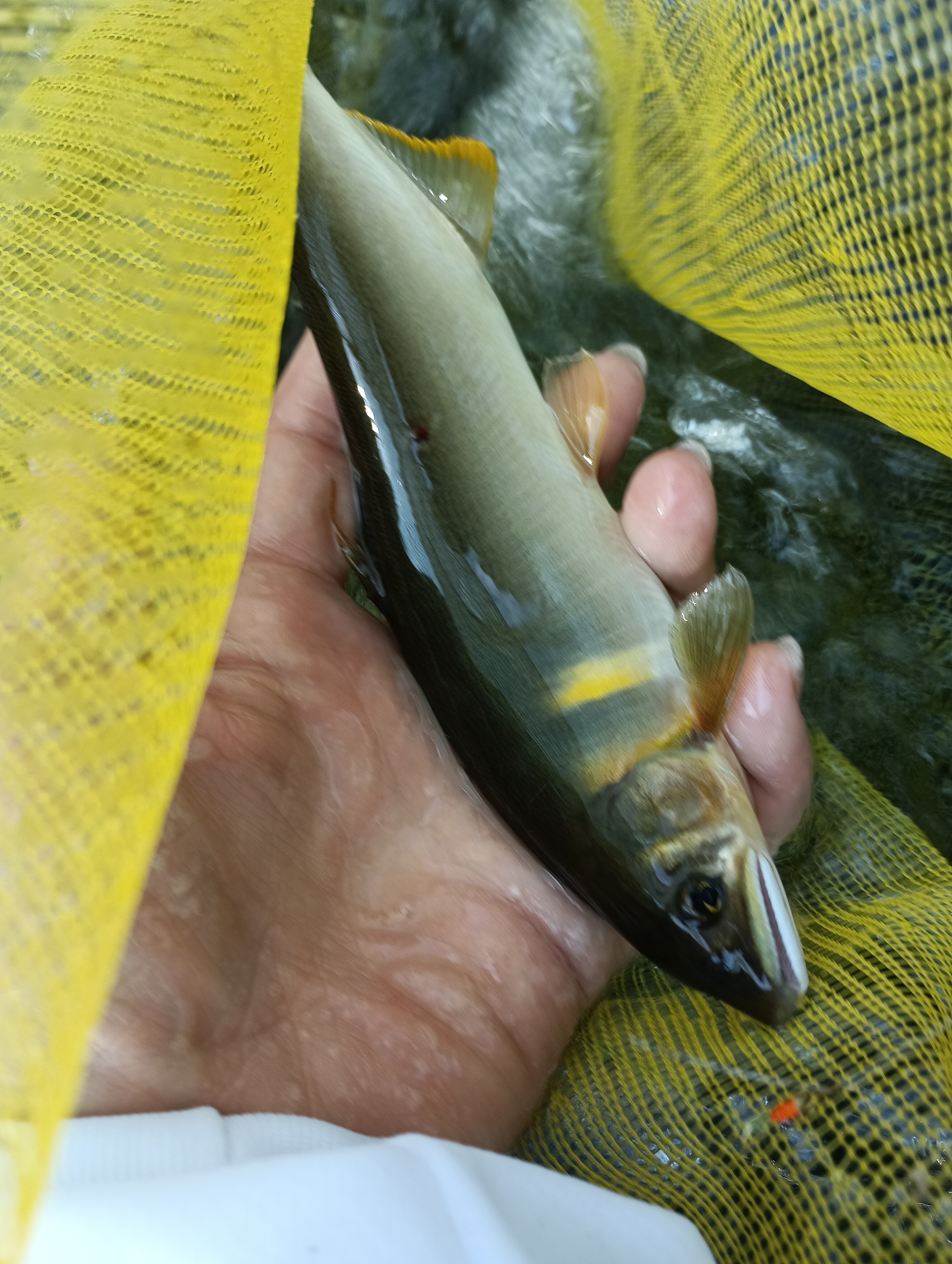 さらに下って瀬の開きの左岸のヘチで掛かりました。サイズは18センチほど。