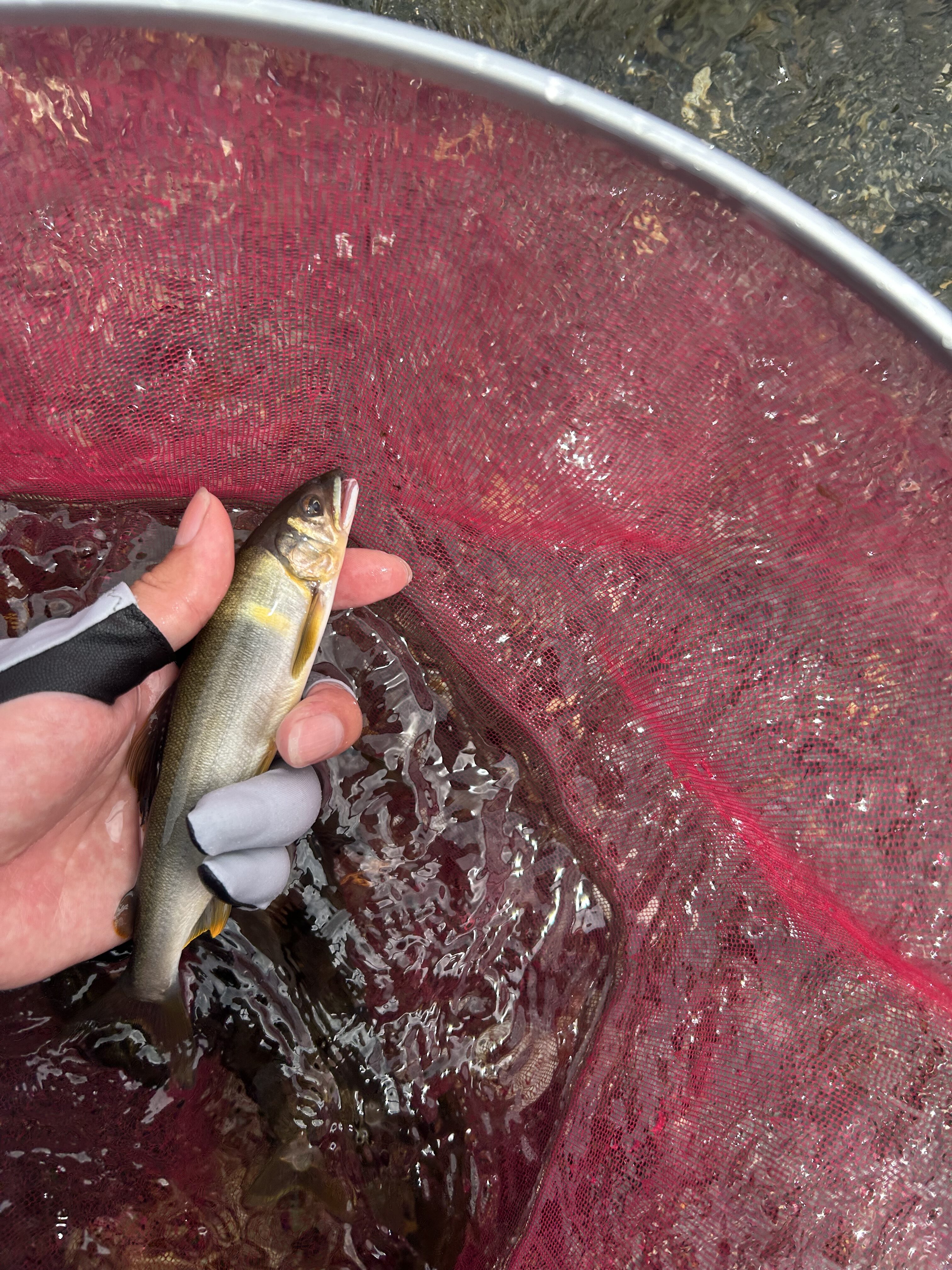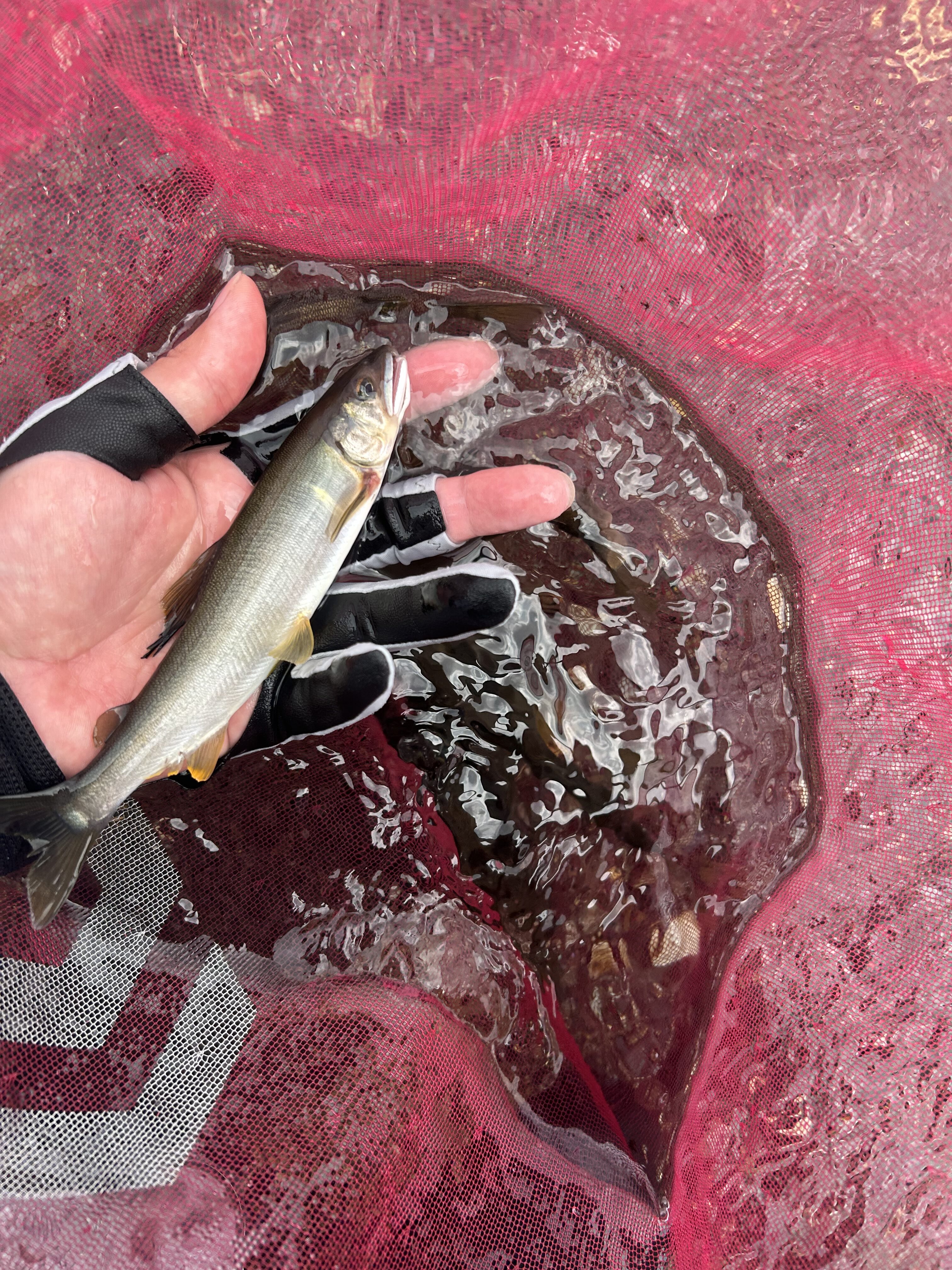 対岸に渡り、また瀬肩を探っていきます。ちょっと緩やかな頭位の大きさの石が詰まってる場所で、ドンッとアタリが。引き抜いてみると17センチ位の良型鮎。