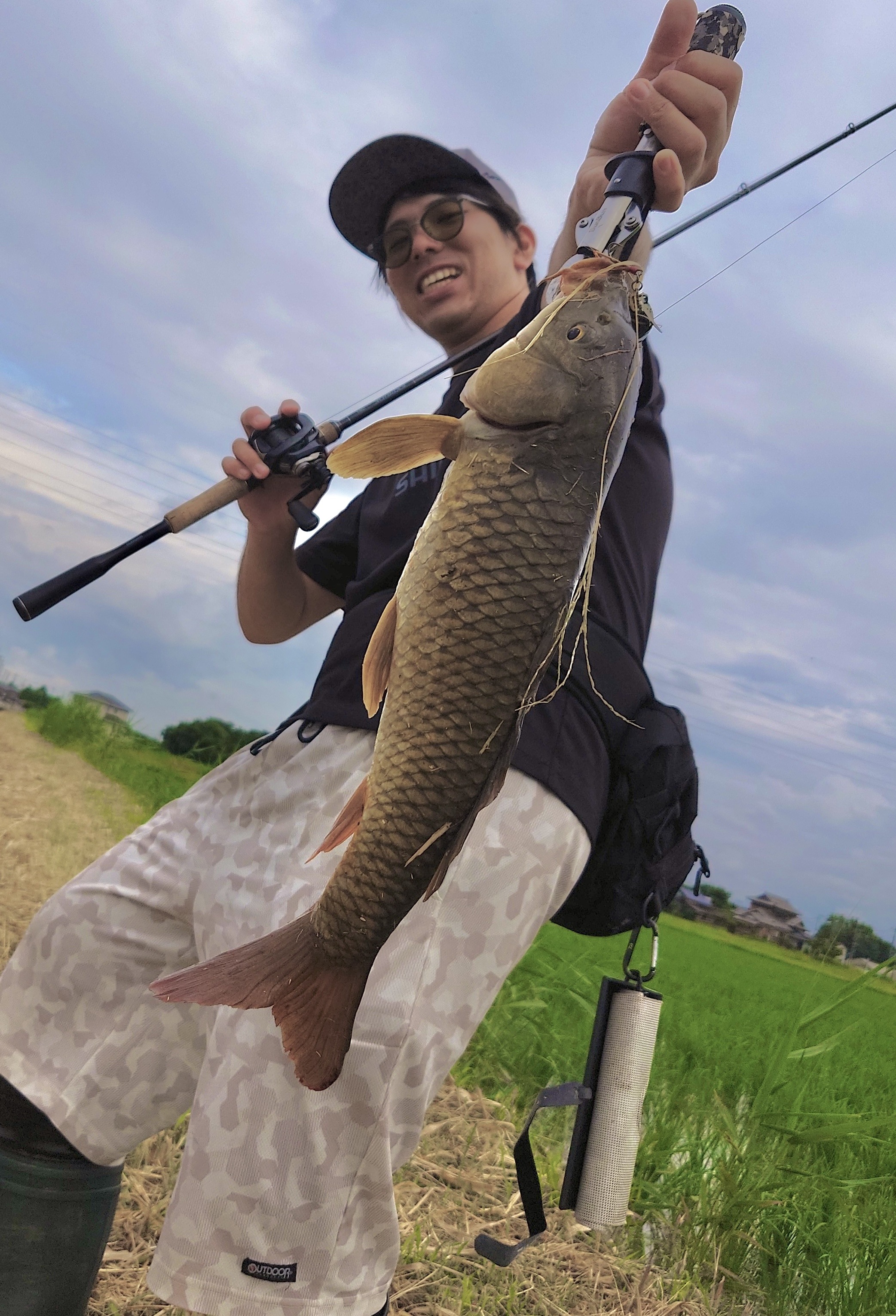 2025.06.30 印刷する コイ釣るデイナマゲーム! 魚種 ナマズ 数 鯉:2本 場所 埼玉県 天候 曇り スタッフ 中村祐 店舗 柏店 釣行日 2025.06.24 コメント 柏店中村です! 今回は柏店三井君とへら釣り後の2回戦でナマズゲームに行ってきました! 向かったポイントは先日柏店剱持さんと回って調子の良かったポイント。到着して様子を見ると、前回来た時より減水しており、サイトもできそうな感じ。とりあえず、上流は三井君、下流は自分と二手に別れてランガン開始! 下流にどんどん下っていくとカフェオレ(色)が流れ込むインレットを発見。早速落としてみるとバイト!ミスバイトでしたがもう一度狙ってみると今度は食ってきました! どん! …あれ?違うなこれは…笑 残念ながら鯉太郎さんでした!笑 その後ナマズのバイト1発ありますが、なぜか亀の追い食いに入れ替わり…笑 ポイント移動。 さらに下流へと移動し、また二手に別れて探ります。 500m程細かく刻みながら撃っていきましたが反応なし。しかし、戻り際、対岸で着水バイト!草に巻かれないよう一気にゴリ巻き! どん! …いや、だから魚種が違うんよ…!笑本日2本目の鯉キャッチでした! 上流担当の三井君は1本バラしたようです。 その後2か所ほどポイントを回りましたが反応なく納竿でした! 今回は不意の鯉2キャッチでした!ナマズゲームをやっているとたまに釣れてくれる時がありますが、そういう時のためにもある程度タックルは強目がおすすめです!自分が愛用しているエクスプライド170M-Gは大物がかかっても問題なしです!ぜひ皆さんも使ってみてください♪ 使用した釣具 ロッド シマノ エクスプライド170M-G リール シマノ メタニウム DC70XG