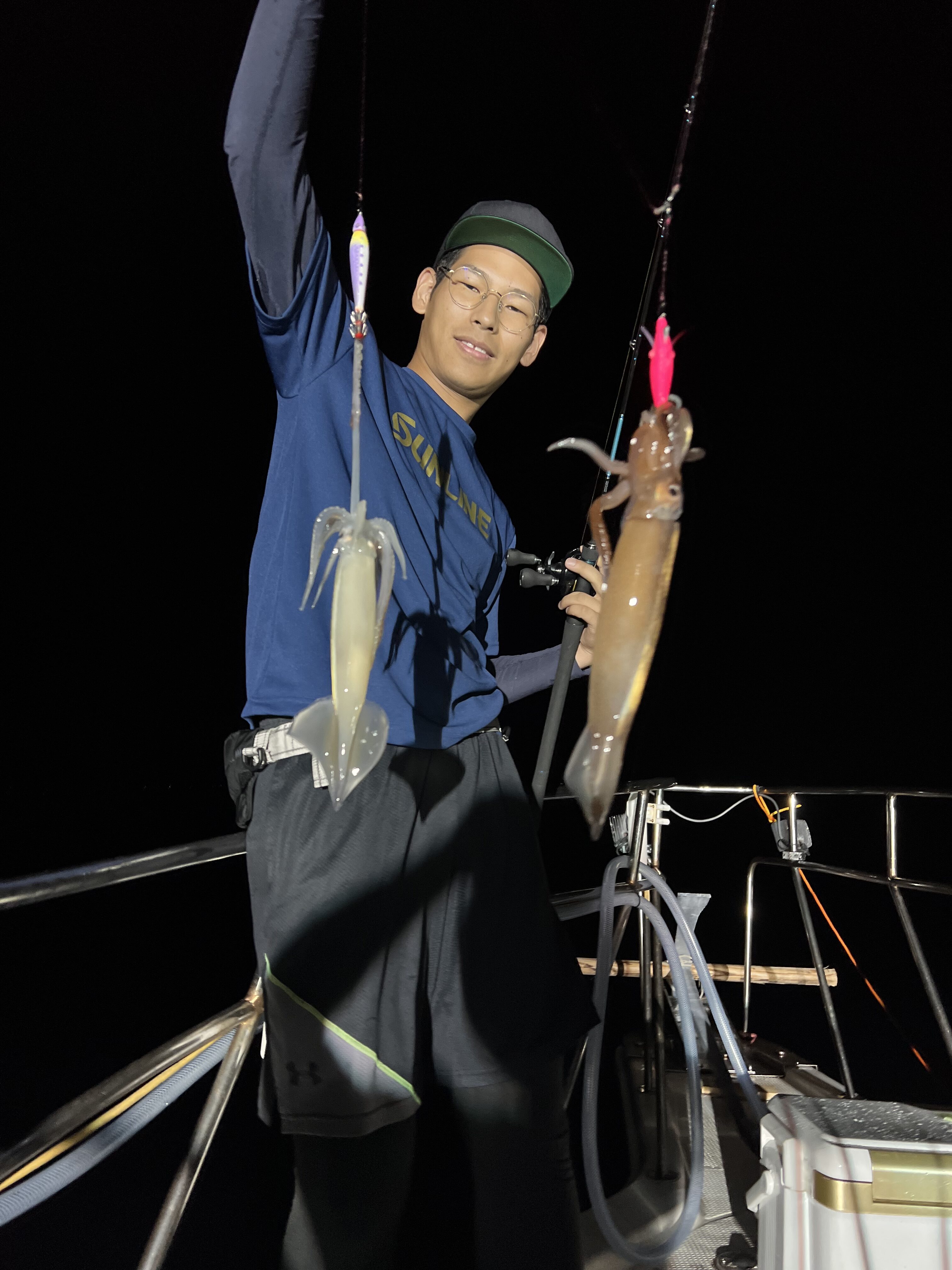 釣れたイカのほとんどはがまかつ エギドロッパー1.8のフルピンクUV、それとEZスリムの70mmニンジンカラーでローテしてて毎投当たりがありました!