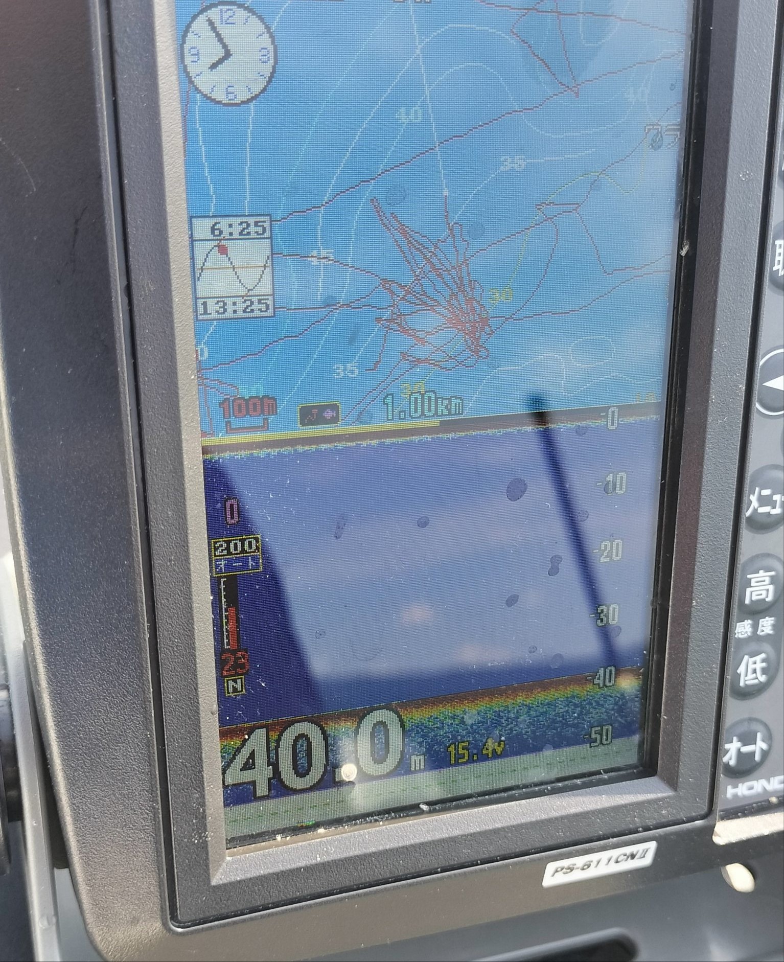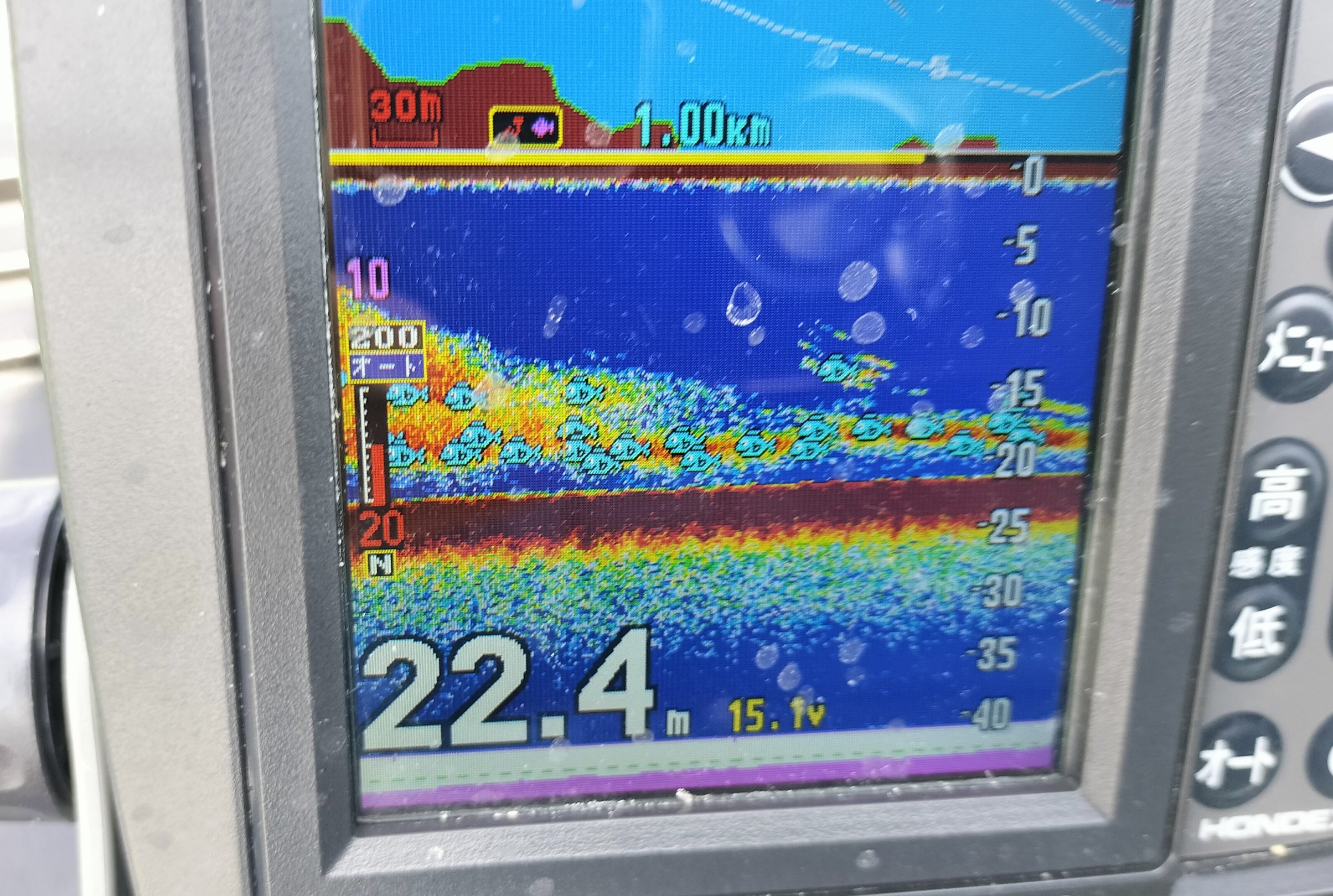 風が強くスカンパの無いボートはドテラ流しで沖に流されるため、イケス近くの28mダチから始めて水深35mくらいまでを筋を変えながら探って行く作戦。