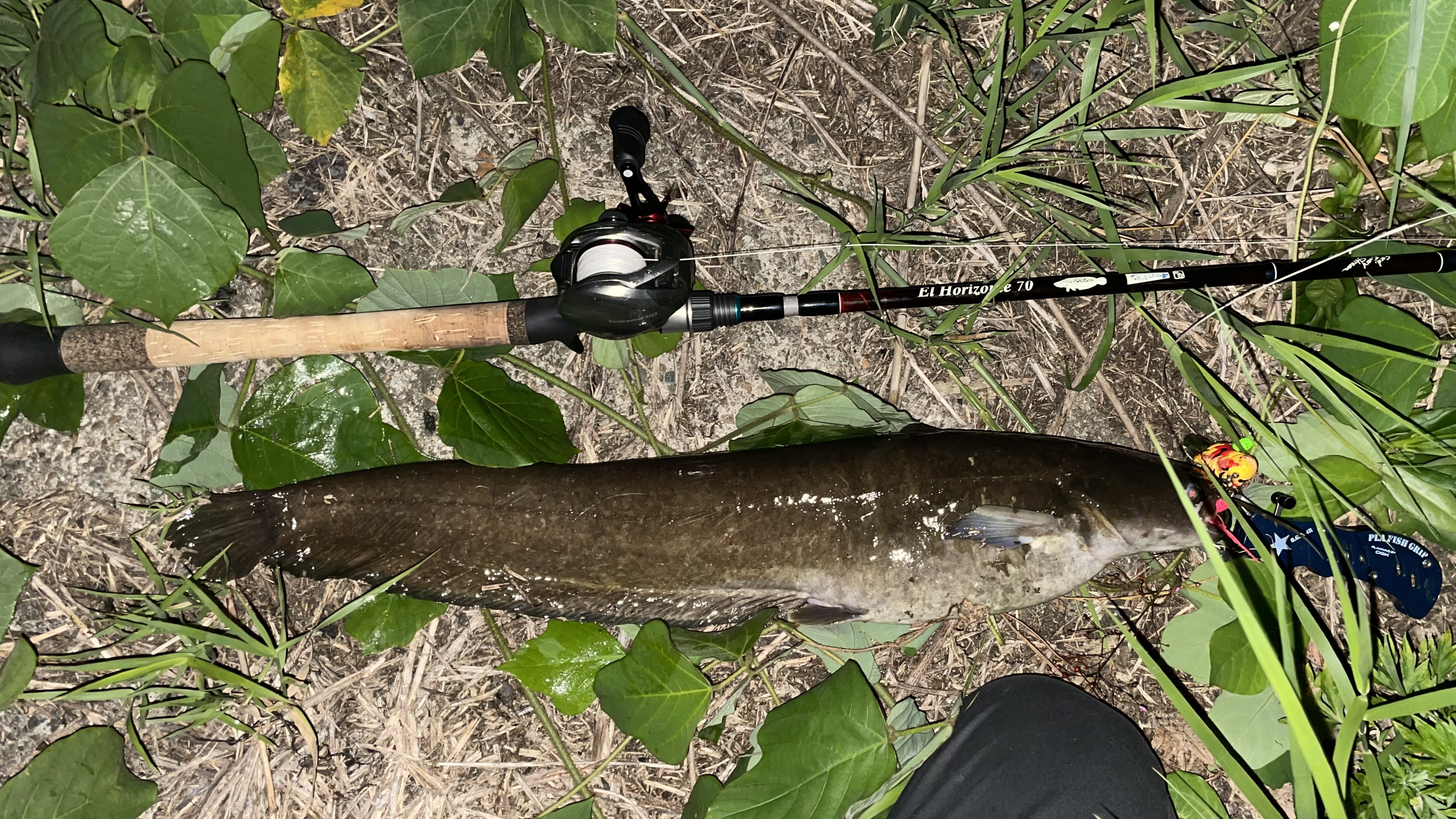 2025.06.30 印刷する 66cm降臨‼️ 魚種 ナマズ サイズ 66cm 数 ナマズ2本 釣り方 ☆ナマズ 場所 京都府 天候 晴れ スタッフ 上角 響己 店舗 京都 伏見店 釣行日 2025.06.28 コメント どうも!スタッフ上です! 梅雨明けのナマちゃんに会いに仕事終わりに釣行! デカナマズが群雄割拠するいつもの場所へ。そしていつもの対岸草際攻め。斜めに引いて出なければ流れに対して垂直に引いてくる。すると3投目。 バシャッ!パァン! お腹ポヨポヨの62.5cm! このポイントでは平均そこそこ以上といったサイズですが、ロクマル。今期2本目のロクマルでした! その後、少し上流の方もやりましたが反応なし。1本目を釣った場所の近くでまた反応あり。さっき釣った子かな…?と思いましたが、また垂直に引くとまたヒット!上げてくると1本目より気持ちデカい…? 測ると、なんと66cm! 自己記録にあと1cmにまで迫る頭でっかちのデカナマズてした! ロクマル2本に満足し納竿。明後日は初めてのナマズ遠征❗️頑張ります。 使用した釣具 ロッド ツララ エルホリゾンテ70 19モデル リール シマノ 21スコーピオンMD 301XG ライン ヨツアミ オルトロスPE WXP1 6号 ルアー スミス キャタピークリッカーⅡ オレンジカモ(ブレード+汁漬けタコベイトチューンド)