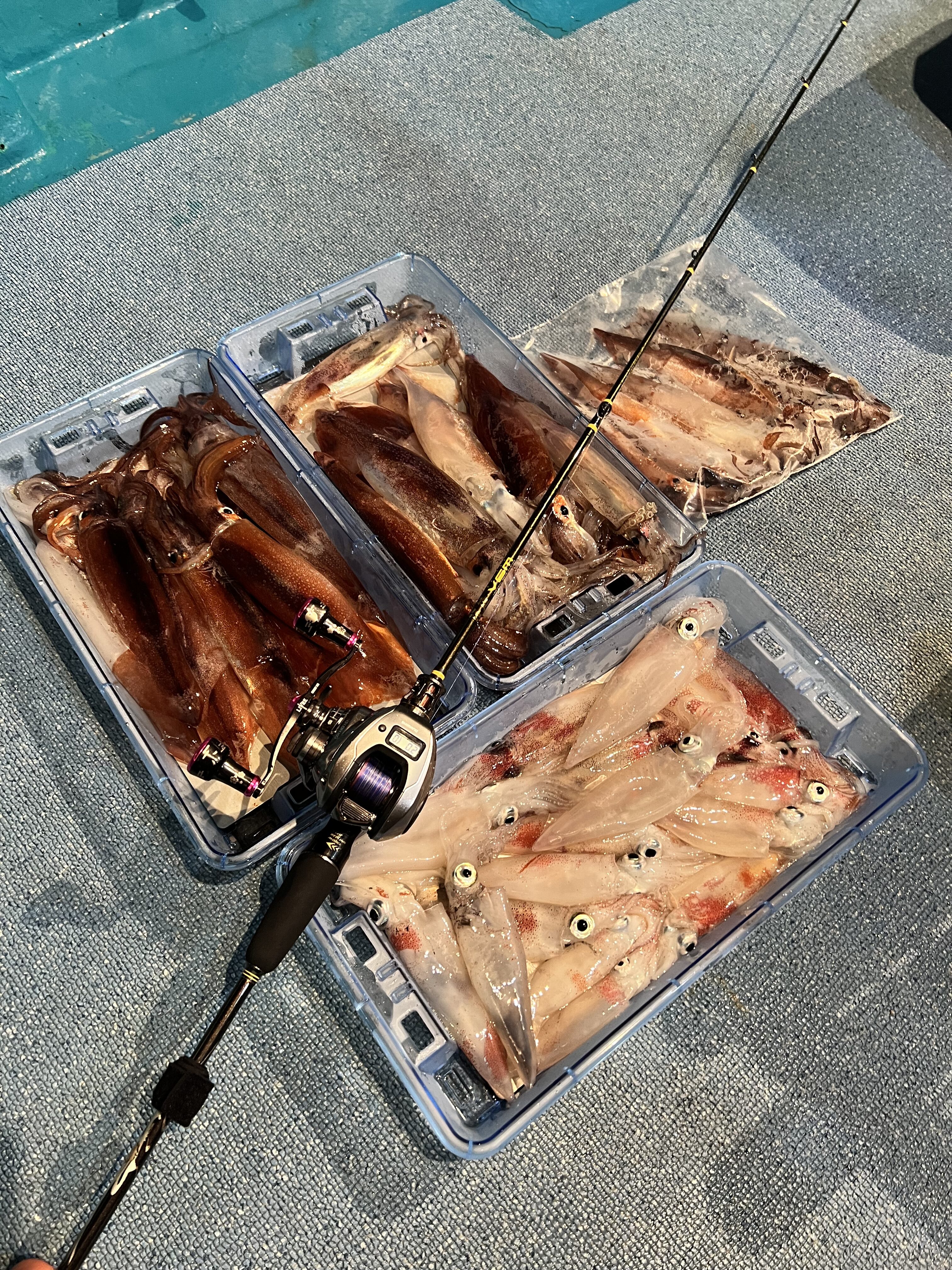 その後も、カラーや誘い方を変えながらポツポツと拾い釣り。特に効果的だったのは、ケイムラ系とグロー系のコンビネーション。後半はポイント移動してから、スルメイカのパラダイスでした。当たりが多くて、凄く楽しかった。