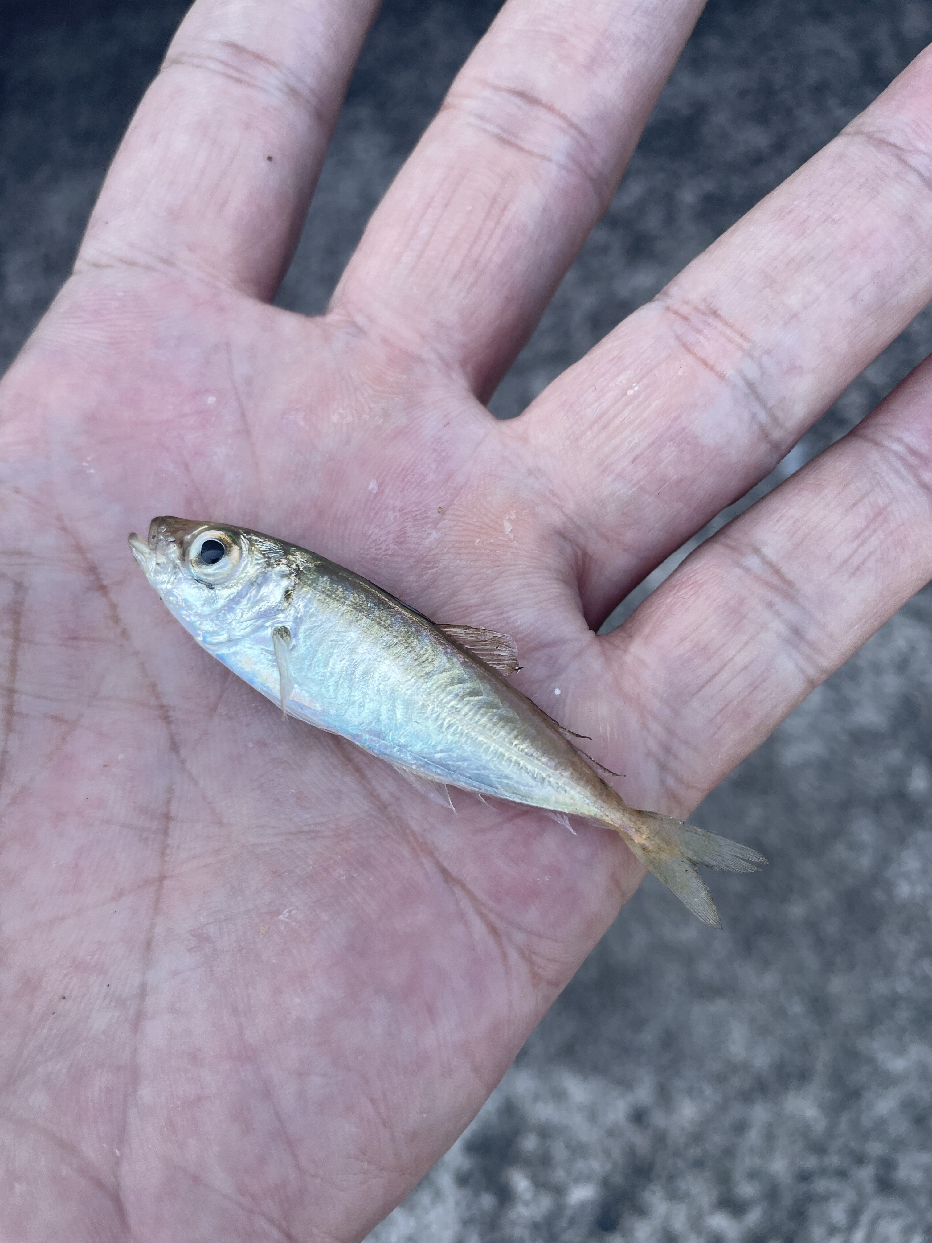今回も朝はゆっくりで昼からの釣行です😊まずは1箇所目のポイントに到着😊足元を見ると小魚の姿が見えます😊早速仕掛けを投入するとすぐに釣れました😁でも魚をよく見るとシーバスの稚魚でした💦再び仕掛けを投入すると今度こそ豆アジが釣れました😊魚影はかなり濃くていくらでも釣れるという感じでした😊