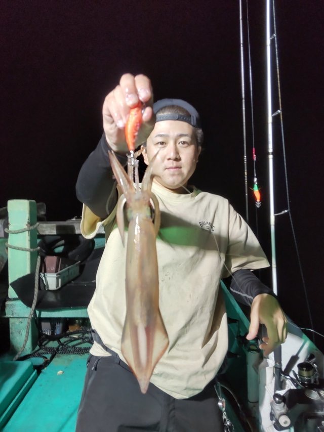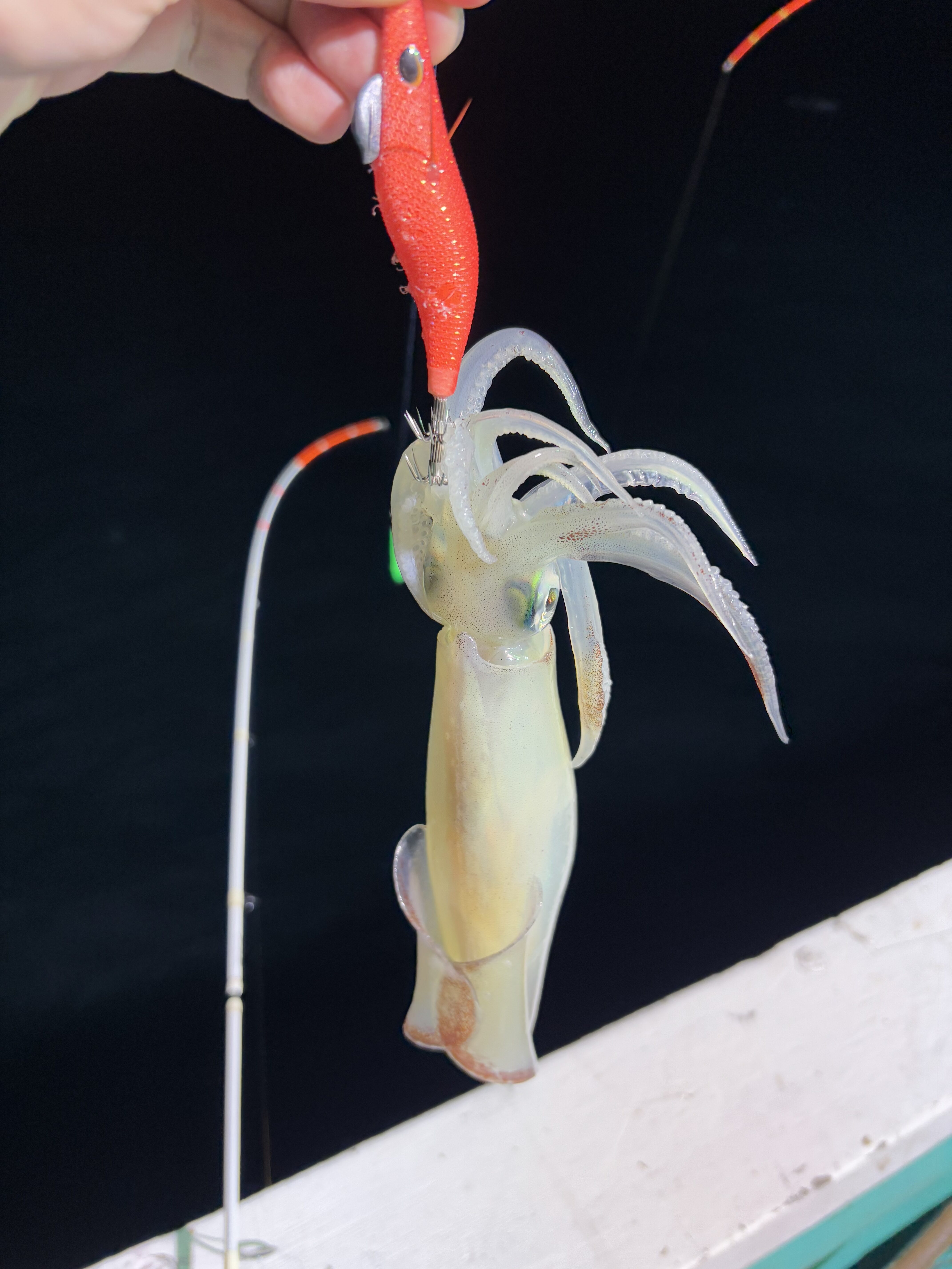 暗くなってからイカメタルをしましたが、渋い渋いようやく1人目が釣れて水深が30mと分かりそこから30m付近を探ってると僕にもヒット‼️