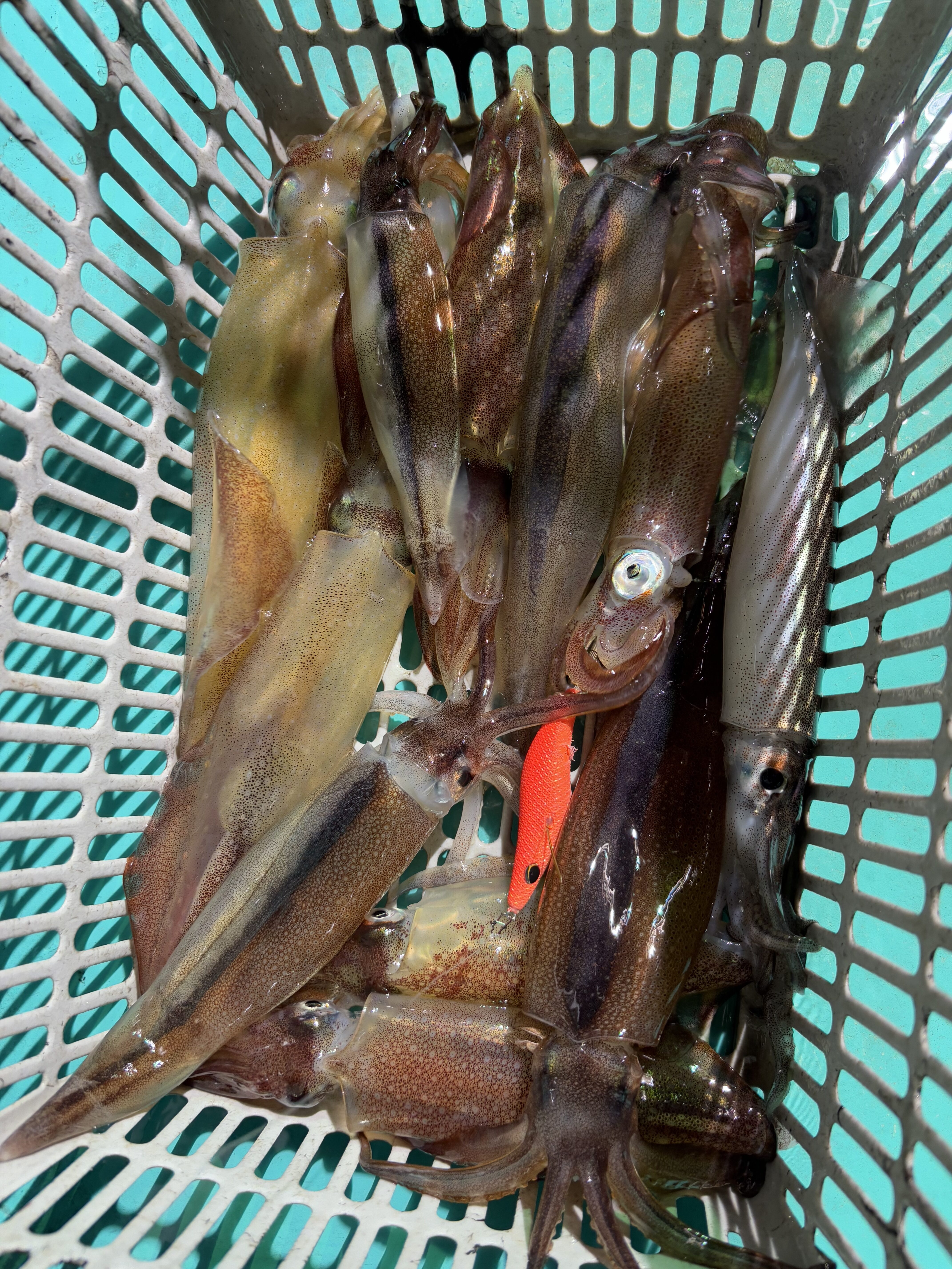 そこからヒット率が上がり結果はスルメとケンサキ半々くらいの計14杯と渋い結果に終わりましたが、後半のオモリグで9人をごぼう抜きできたので満足でした。