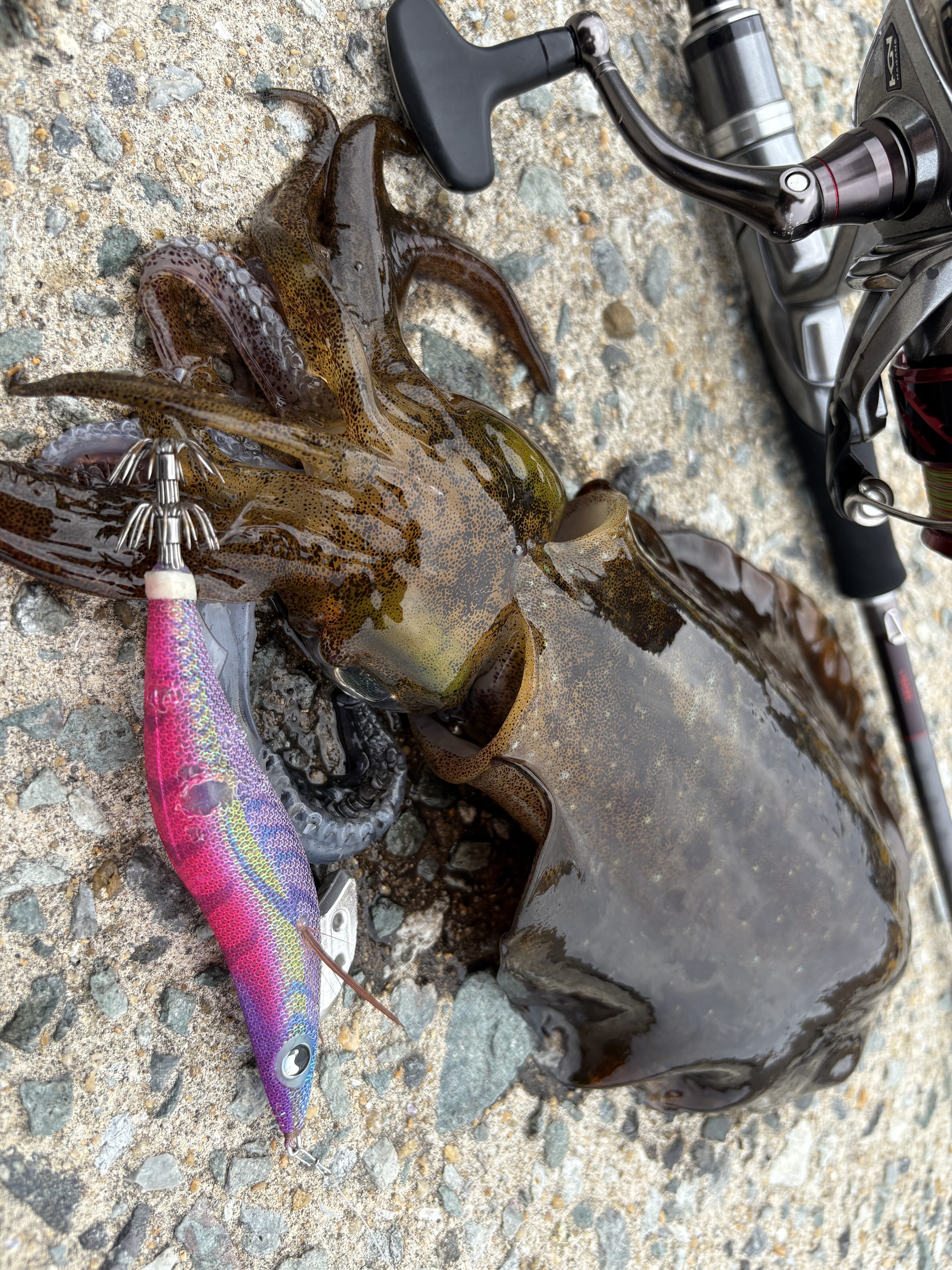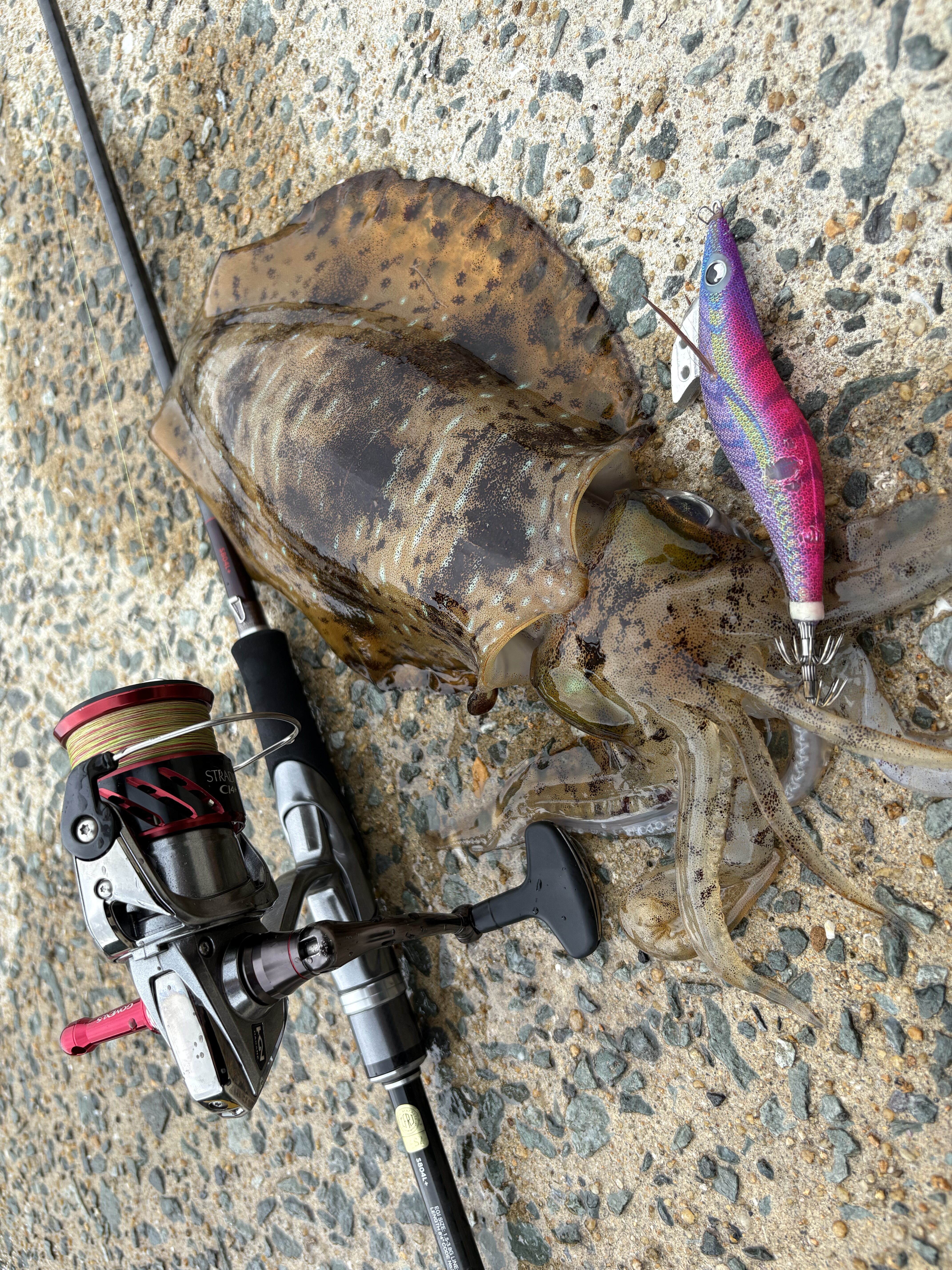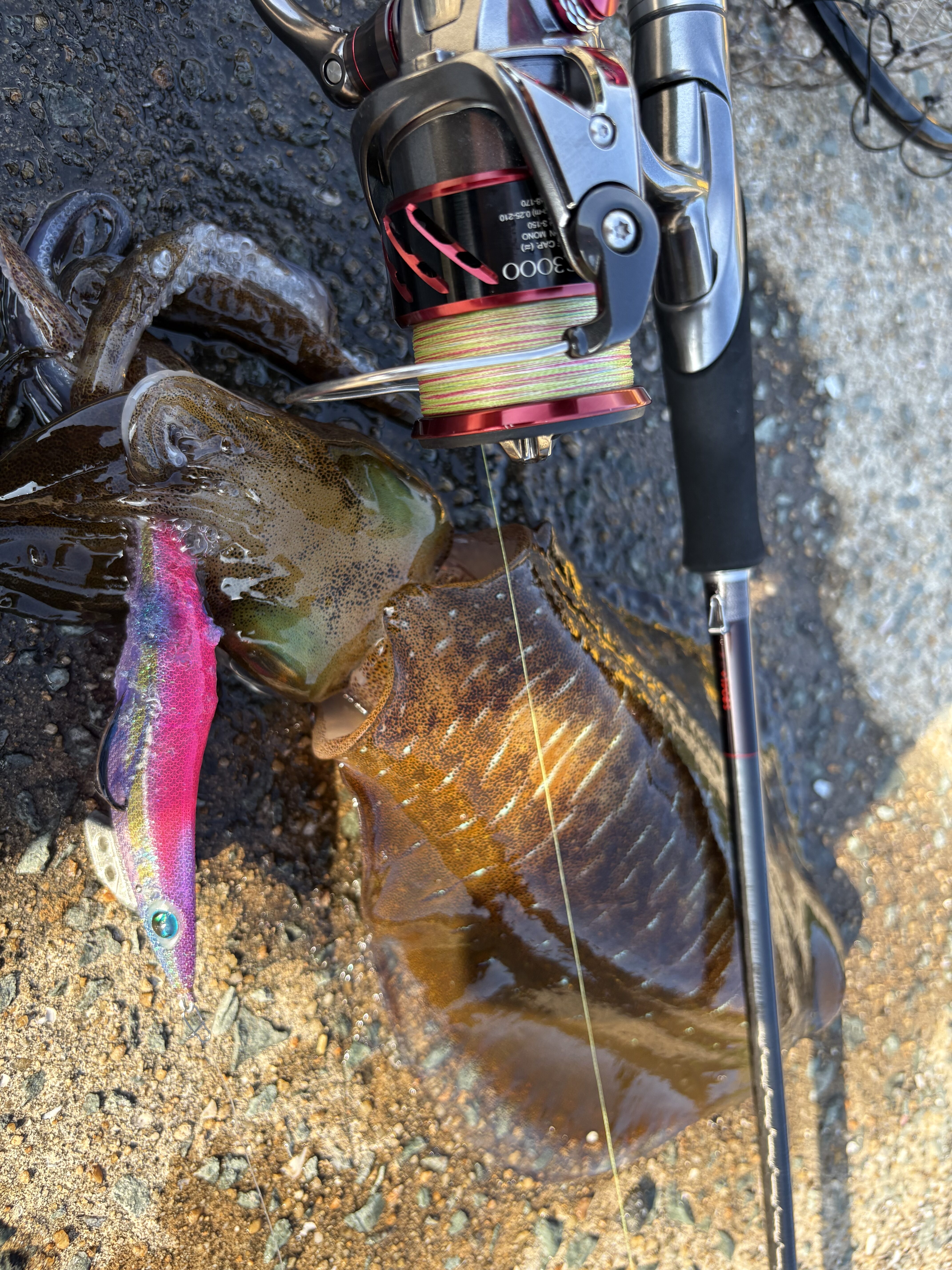 2025.07.02 印刷する おかっぱりアオリイカエギング衝撃の31杯! 魚種 アオリイカ サイズ 〜900g 数 アオリイカ31杯 釣り方 ☆エギング 場所 長崎県 スタッフ 大矢涼太郎 店舗 高槻店 釣行日 2025.06.27 コメント 高槻店大矢です! 前回に引き続き、五島列島編です! 前日にエギングが好調だったこともあり、この日も朝からエギングに! この日も、潮と本命ポイントを絞ってそのタイミング以外は、そのポイントでエギを見せない為、ほかの場所をランガン! 朝マズメは500gくらいのイカを2杯🦑 その後、朝の潮のタイミングで、本命ポイントに入り、ここで爆発!サイズはあまり出ませんでしたが500〜920gのアオリイカが、なんと10杯!しっかり攻略できました🎣 その後、長崎のエギプロ、ハヤケンさんと合流し、2時間ほどご一緒させていただき、500〜700gを3杯GET!雄イカの入れ替えなど、プロの技を見せていただきました👏 その後はまた1人でランがんし、下げの狙ってたタイミングでまた別の本命ポイントへ!ここでもやはり爆発〜850gまで、16杯笑🦑 結局この日は、キロオーバーは出ませんでしたが500〜900gの良型アオリイカを、ショアからなんと1日で31杯釣るという、島民も聞いたことがないという、もはや意味がわからない釣果となりました😇 続く! 使用した釣具 ロッド セフィアエクスチューン804L + リール ストラディックci4C3000hg