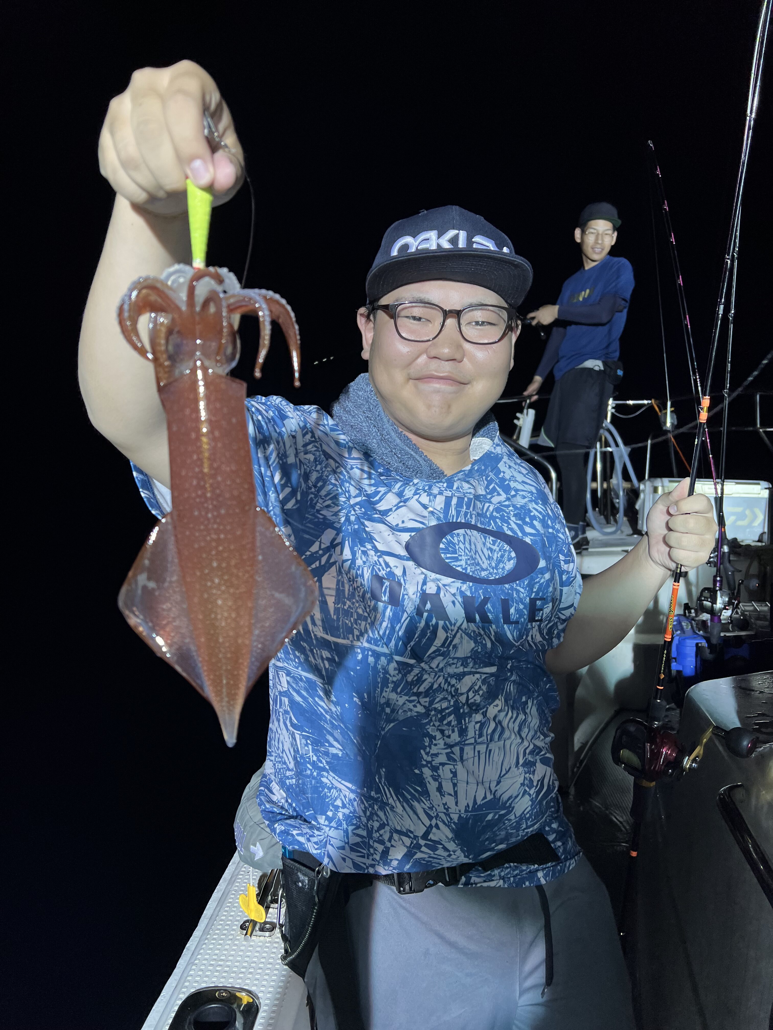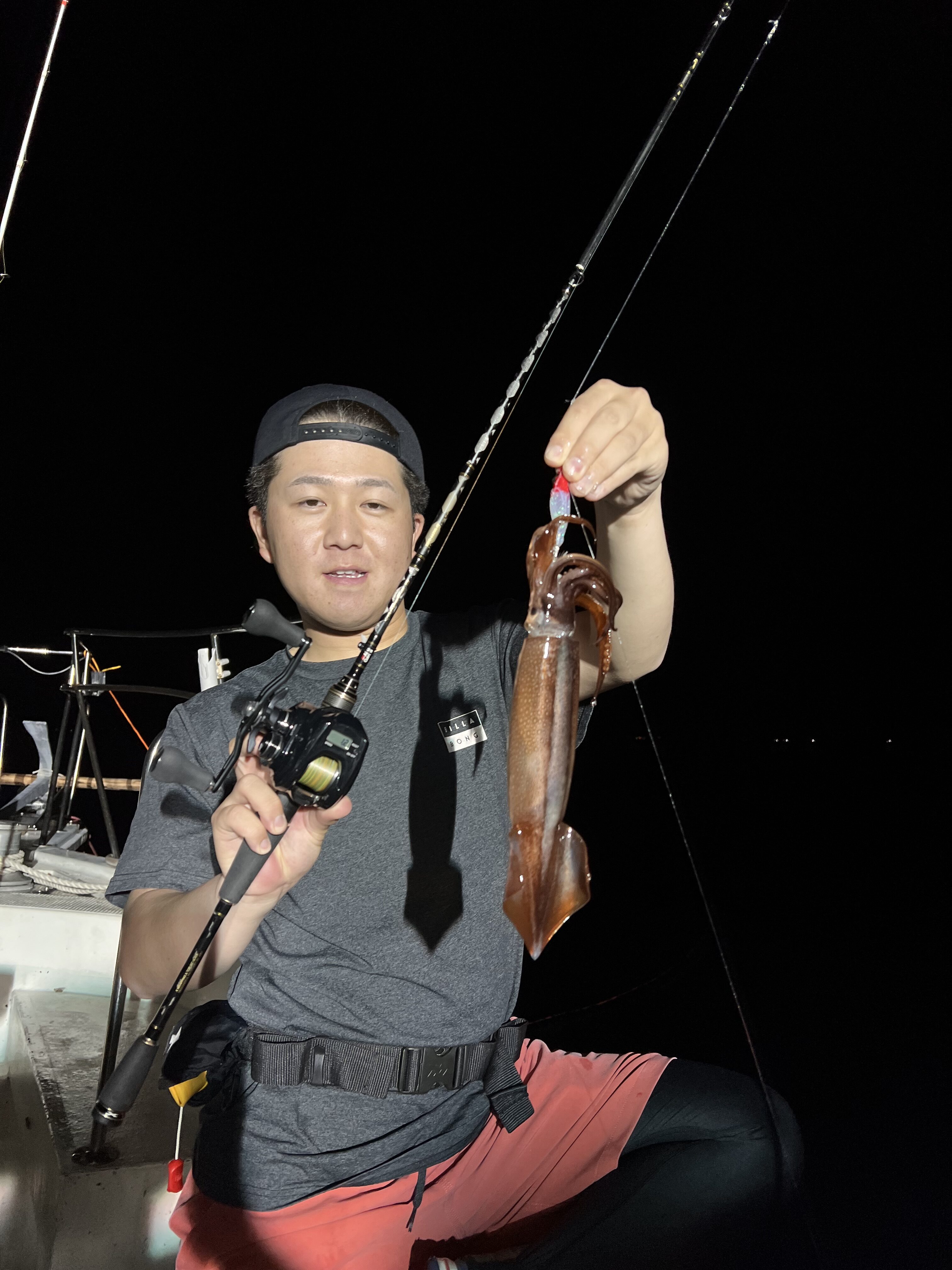 ポイント到着後、女性スタッフへのレクチャーのために一度底を取って説明していると、いきなり僕の竿にアタリが!早速スルメが釣れてくれて、初のスタッフは大興奮!これを口火にみんなスタート。