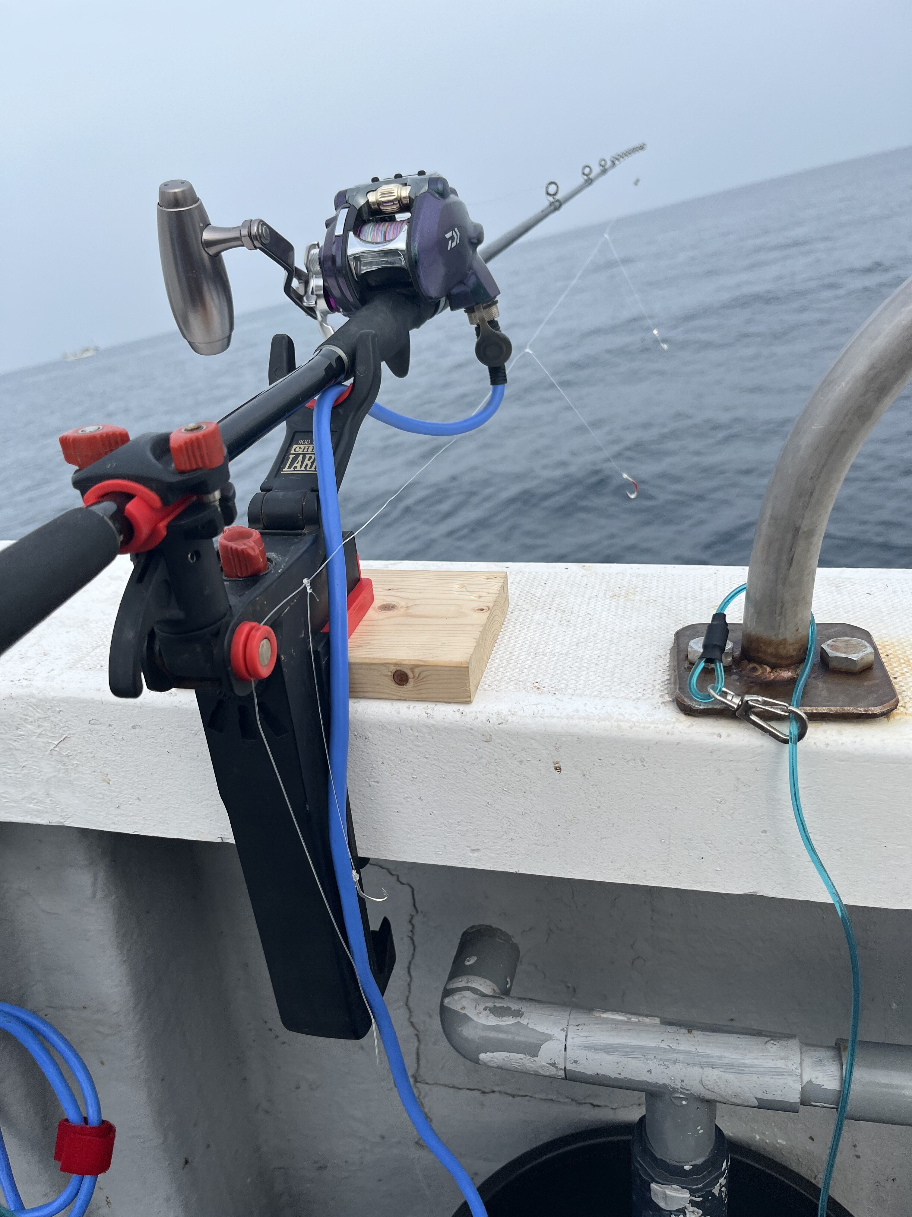 竿掛けを持っていくと便利です。ベイトが小さいという事で、空針の落とし込み仕掛けを使います。錘は50号を使いました。