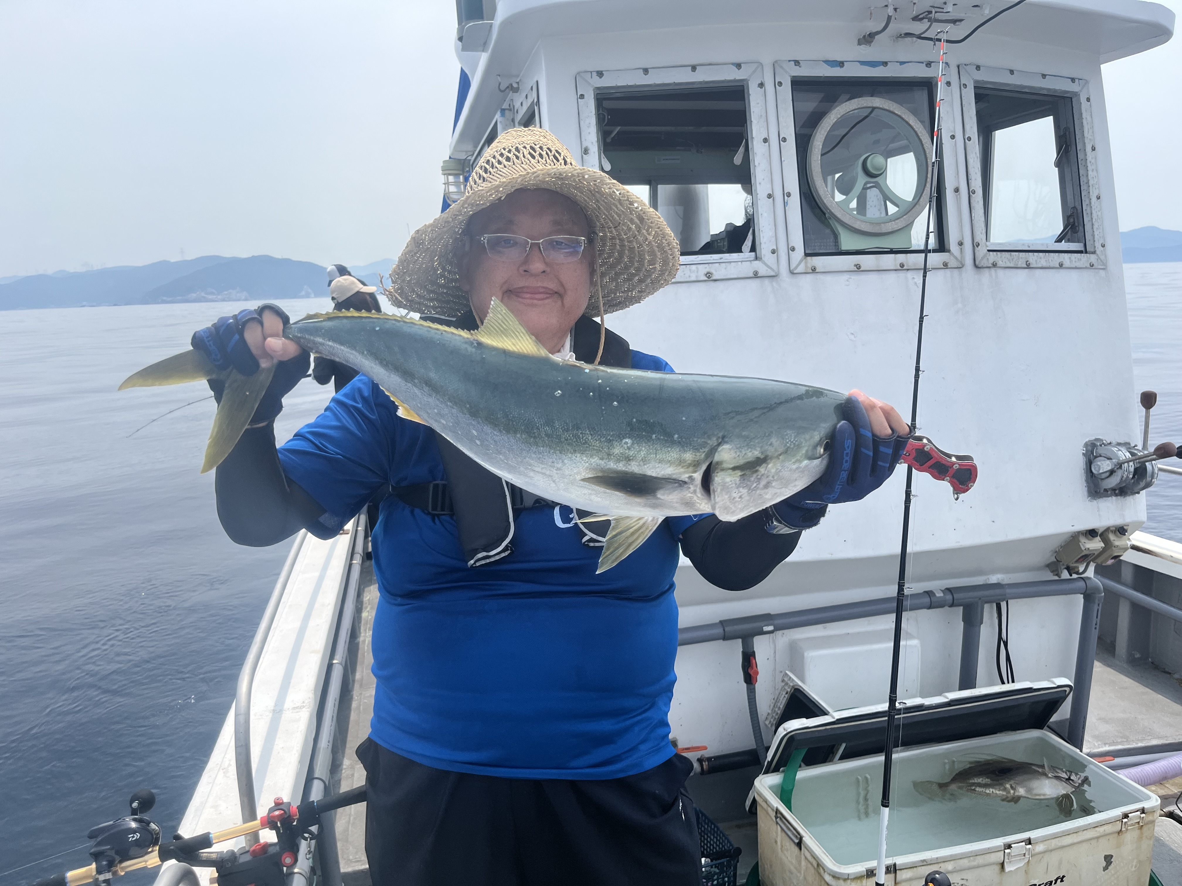そうしているうちに隣のK様に当たりがあり、竿が大きく曲がっています。慎重にやり取りして上がってきたのは90㎝クラスの立派なブリです。
