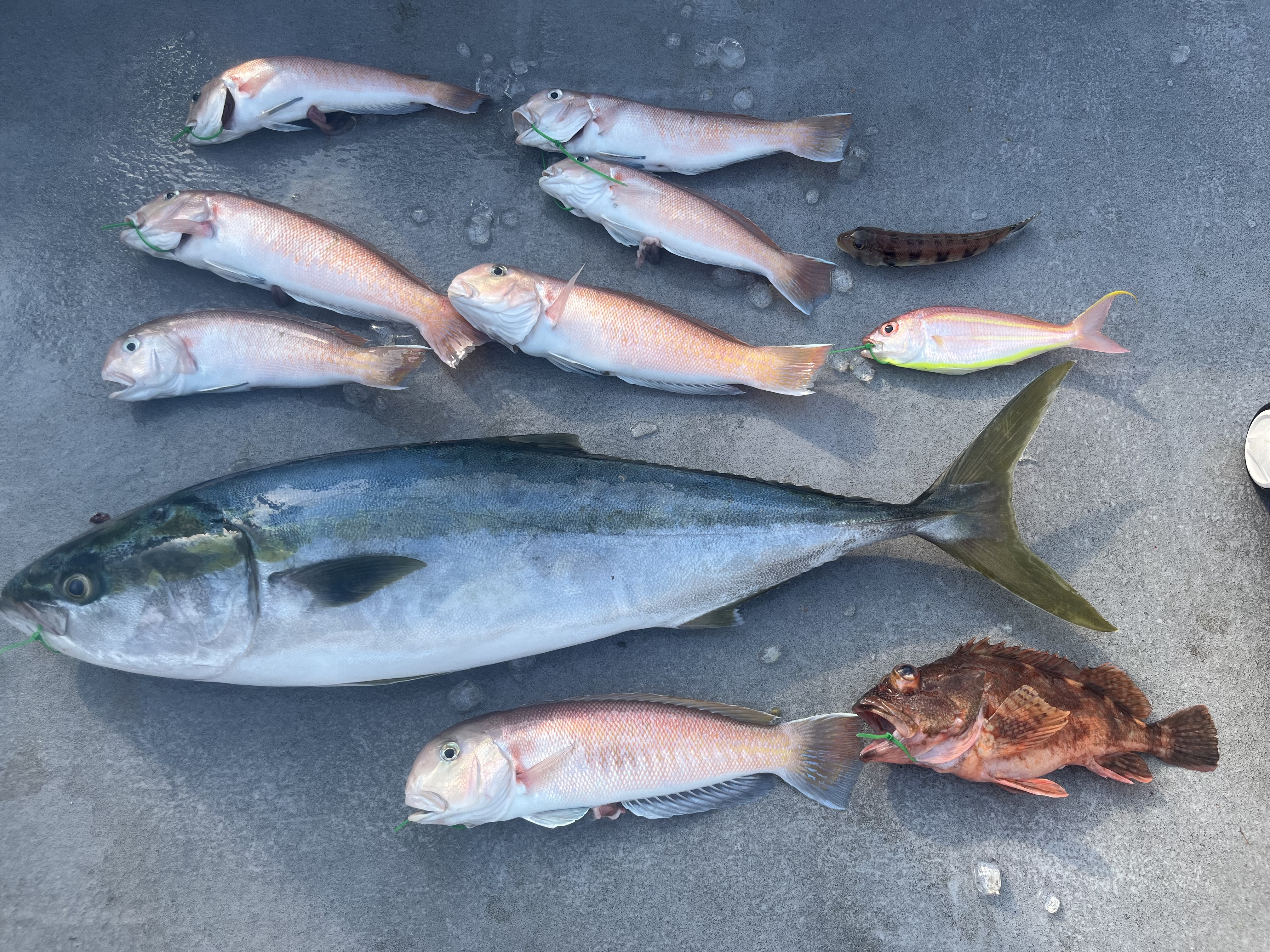 2025.07.04 印刷する 和歌山 落とし込み→シロアマダイ贅沢リレー@MCLさん 魚種 アマダイ/シロアマダイ ブリ/メジロ/ワラサ/ハマチ/イナダ/ツバス/ワカシ サイズ シロアマダイ35cm 数 シロアマダイ 4匹 釣り方 ☆アンダーベイト/落し込み 天秤フカセ 場所 和歌山県 天候 晴 スタッフ 角田 彰久 店舗 リンクスウメダ店 釣行日 2025.07.02 コメント みなさんこんにちはリンクスウメダ店の角田です。 今、和歌山でシロアマダイの釣果が上がっているという事で、お客様のK様と共にMCLさんにお世話になって、落とし込み→アマダイ釣りの豪華リレー便に行ってきました。 当日は6時出船で風も少なく船は快調に走り湯浅の沖まで来ました。 まずは落とし込み釣りです。 竿掛けを持っていくと便利です。ベイトが小さいという事で、空針の落とし込み仕掛けを使います。錘は50号を使いました。 当日はイワシベイトでベイトは多いのですが最初は中々口を使ってくれません。 潮が変わり少しベイトの活性も上がってきました。サバがベイトになり上層で掛け、一気に底まで落とします。 ガツンガツンと当たりが出たので合わせましたが魚が離したようです。上げてみるとサバが歯型でボロボロになっていました。ヒラメが当たっていたようですが、あわせが早すぎました。 そうしているうちに隣のK様に当たりがあり、竿が大きく曲がっています。慎重にやり取りして上がってきたのは90㎝クラスの立派なブリです。 ベイトの活性が落ちてきたので、アマダイ釣りに移動します。 天秤フカセの2本針にホタルイカと青イソメを付けて狙います。 底をトントンと叩き、竿をそっと持ち上げ、砂煙の中から餌が飛び出した様子を演出します。 私の竿に当たりがでました。少し飲ませるつもりでゆっくり目にあわすとブルブルと心地よい引きが! すっと上がってきて途中と船際でもう一度抵抗します。アマダイ独特の引きで上がってきたのは、35㎝ほどの美味しそうなアマダイです。 その後同じようなサイズのアマダイを3匹追加して、ストップフィッシング。 1日釣りを堪能しました。MCLさんありがとうございました。 和歌山沖ではアマダイが良く釣れております。 つり具のブンブンリンクスウメダ店でも、落とし込み仕掛け、アマダイ仕掛けを多数ご用意して皆様のご来店をお待ちしております。 使用した釣具 竿 ライトゲームスティック リール シーボーグ200JL