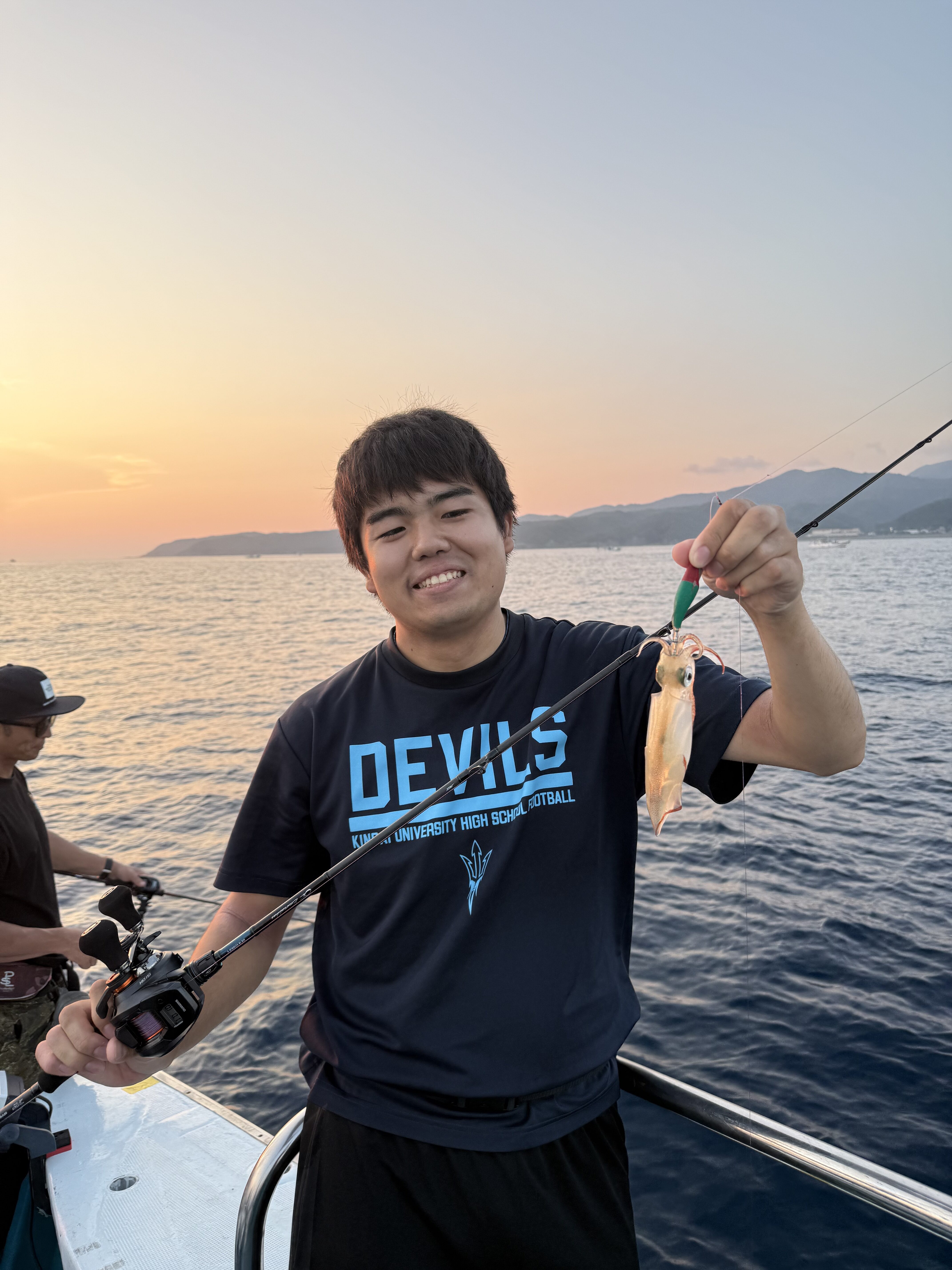まだ夕日で周りが明るいとき、アタリはあまりありませんでしたが、コンッと小さいあたりが出てくれたところにフッキング…とりあえず小さいけどケンサキイカを釣ることができました。
