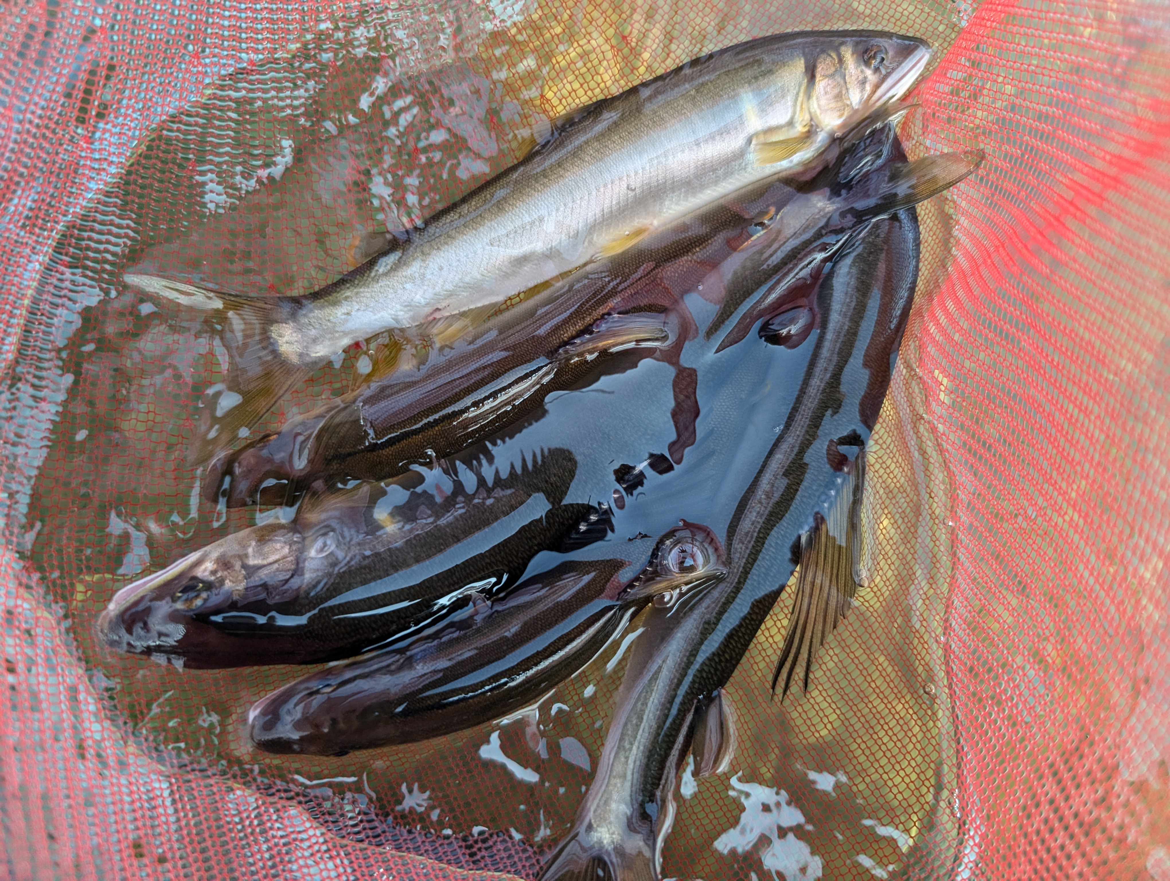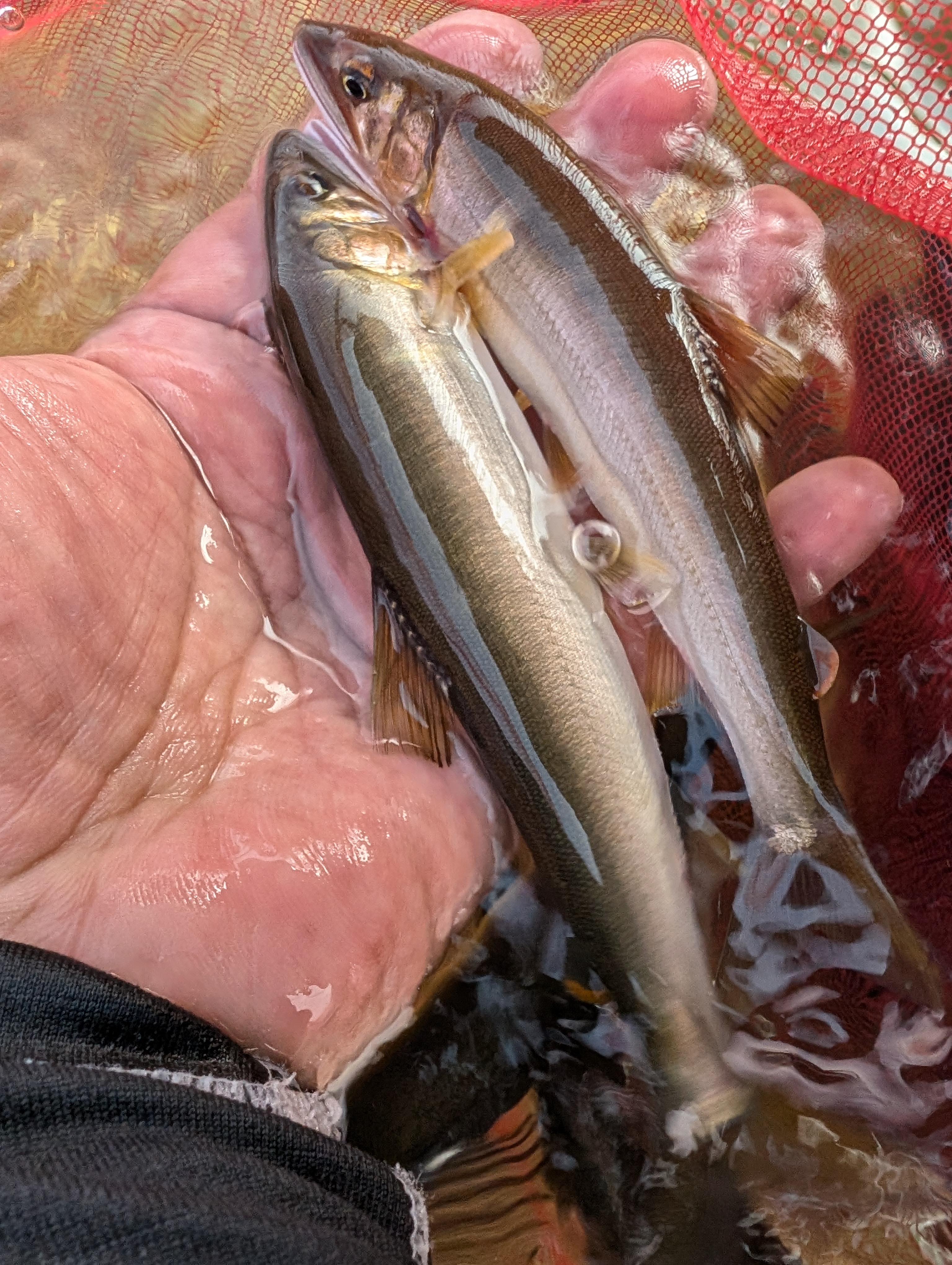 掛かりそうな場所はいっぱいあるのにどこも反応なしで、風もどんどん強くなるので16時で早めに納竿しました。サイズは16cm前後と例年より型は揃っていますが、昨年は良くかかったビリアユサイズが全く見えなかったので、今年はやっぱり鮎が少ないように感じました。