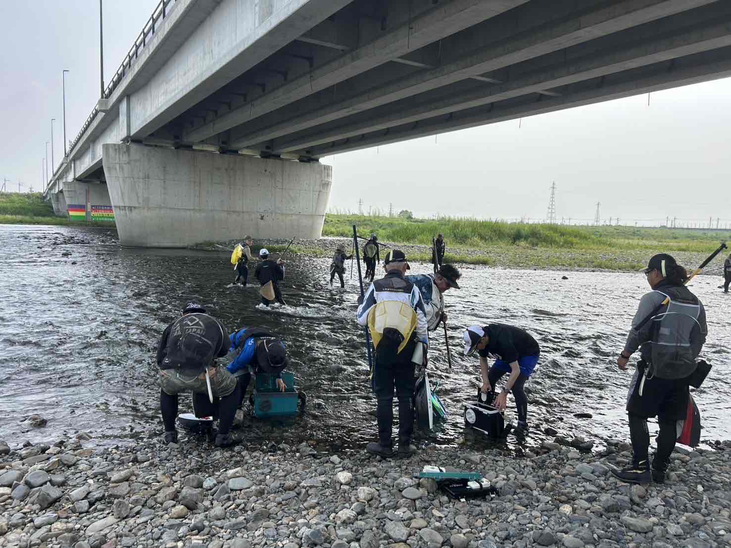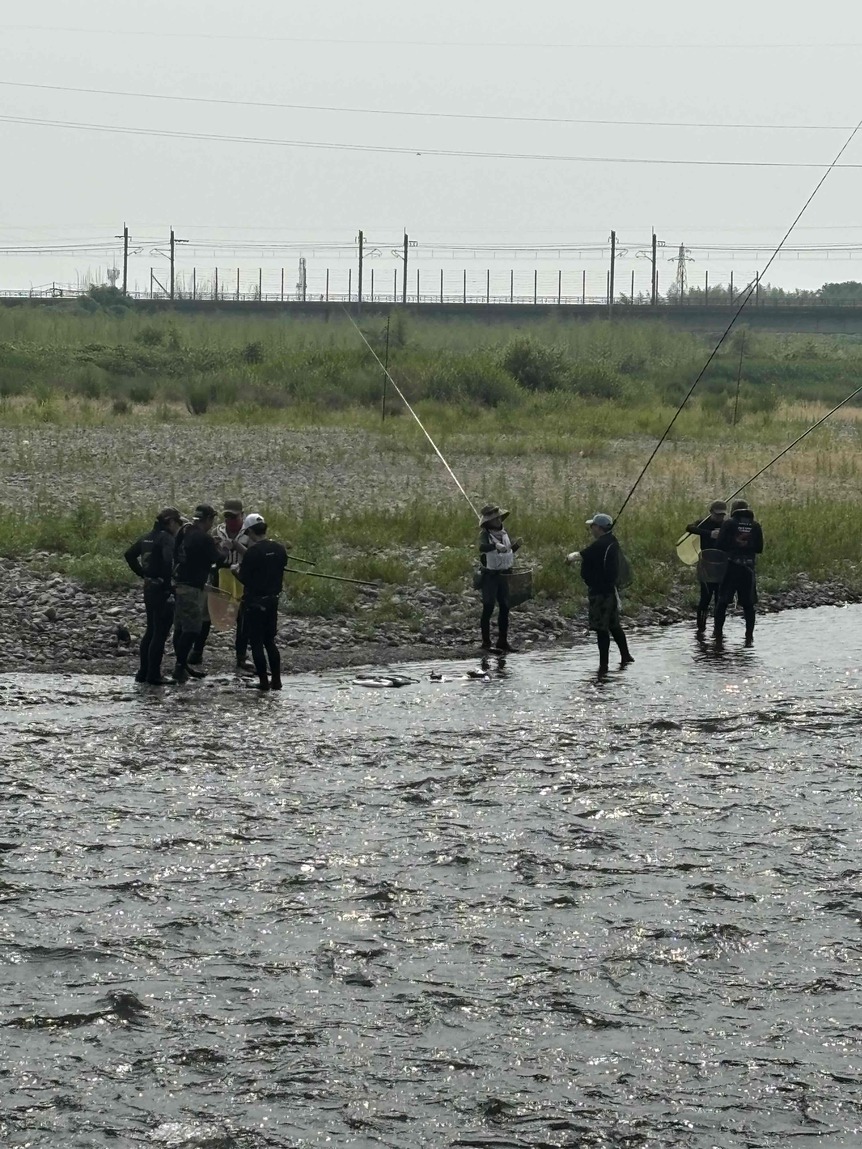 当日は名人も参加され貴重なアドバイスや名人によるレクチャーなどあり見ているだけで大興奮でした。 朝九時にスタートしては低調な釣果 友釣りは少し深いところでヒットしているが鮎イングは苦戦。みんなでお昼休憩して再度釣行開始。 お昼ごろに少し雨もありましたがちょうどよい雨 直ぐに晴れてきて蒸し暑い 友釣りは釣果を伸ばしていきます 後半は型もよくなりヒットすると勢いよく目印が飛んでいきます。 一度パターンにハマると連続ヒットもオトリの循環も良くなり釣果も伸びていきます。よく釣っている方は釣れると針もよく変えています。針を変えてリズムを崩さない釣り方でよく釣っていました。初めての方、数回の釣行の方も後半は一人で釣られ釣果を上げられていました。