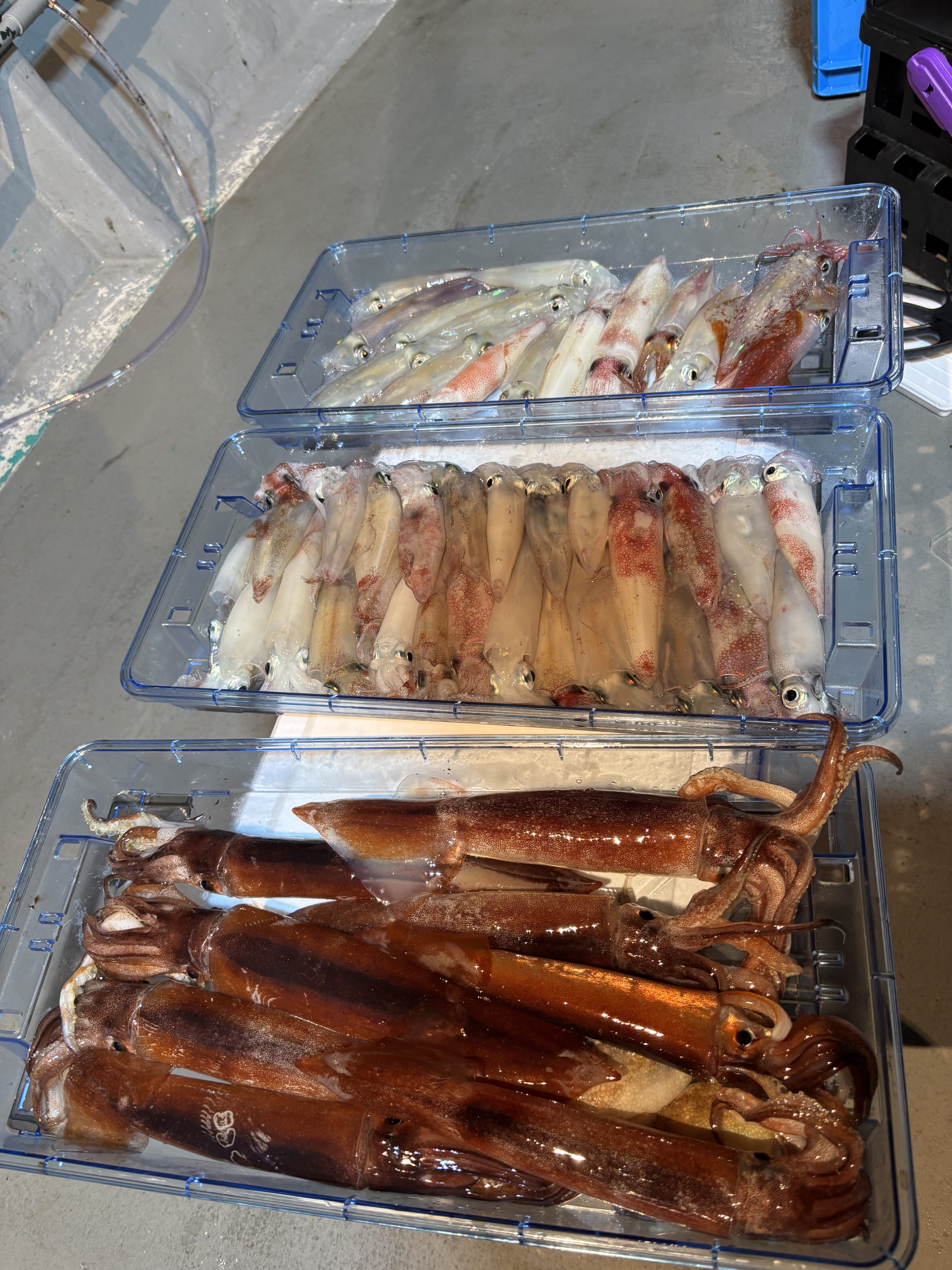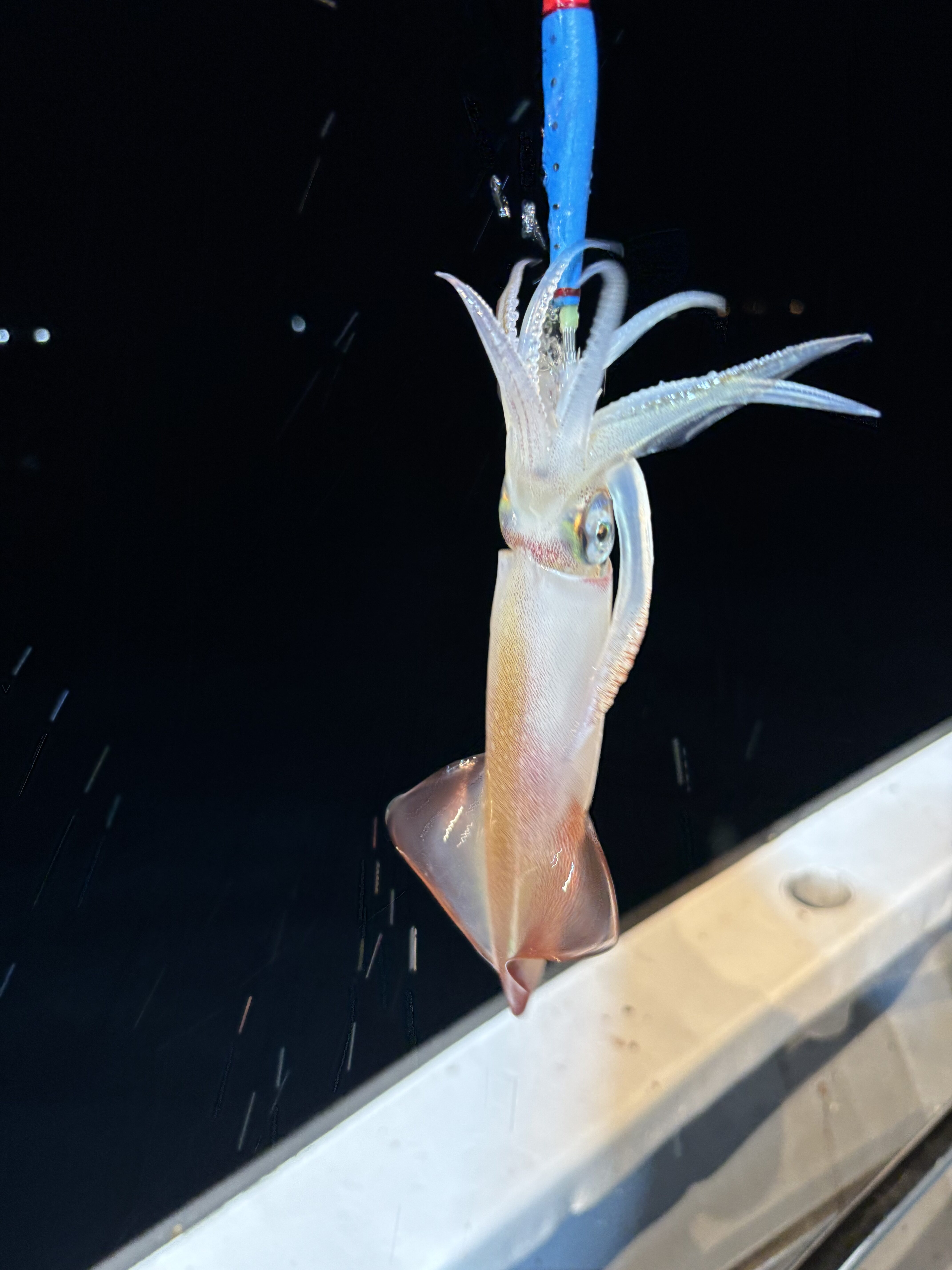 まずは仕掛けを投入して様子見。3投目でようやくヤクルトサイズのケンサキイカが1杯釣れましたが、その後は続かず…。