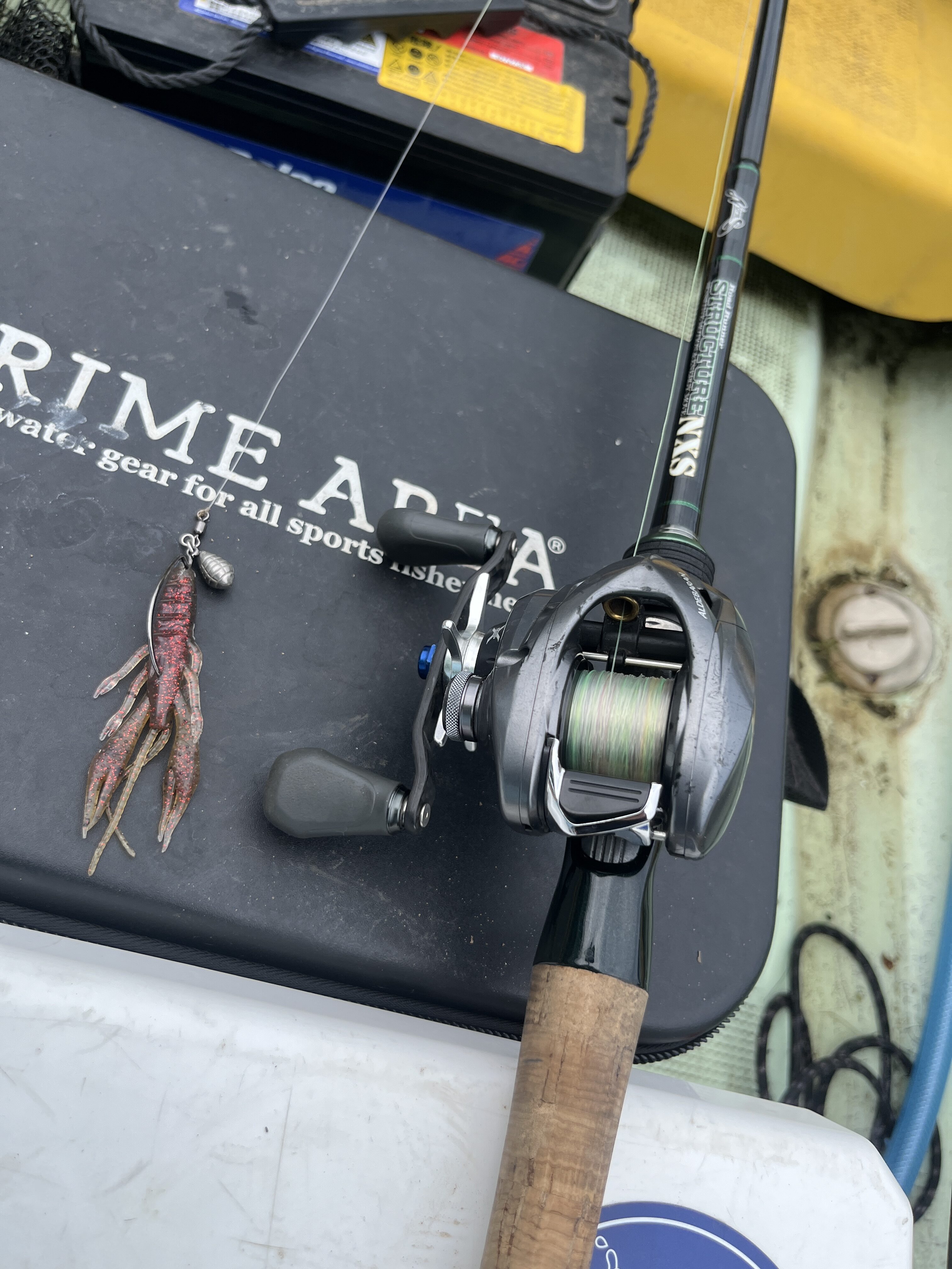 Day1→フライト順は50番。69人中50番目とまあ運はなく、とりあえずプラで好調な川筋でエビボイル誘発パターンで攻めます。ノラネズミやビッグ2wayエラストマーを1wayにしたノーシンカーで表層チョンチョン。キーは岸際がコンクリの壁。壁に当てて着水させ早めのリトリーブちょんちょん、子バスと雷魚バイトのみでいい反応はなく…川がきついので見切って洲の野原へ。プラでも行ったことない所ですがとりあえず、水が動く葦側を点々とし、ウェバーシュリンプ3.5インチの7g直リグを葦の根元ギリギリにテンションフォール。すると鈍い当たりが!なんとか1088gをキャッチ!その後は反応なく、初日8位で留まりました。