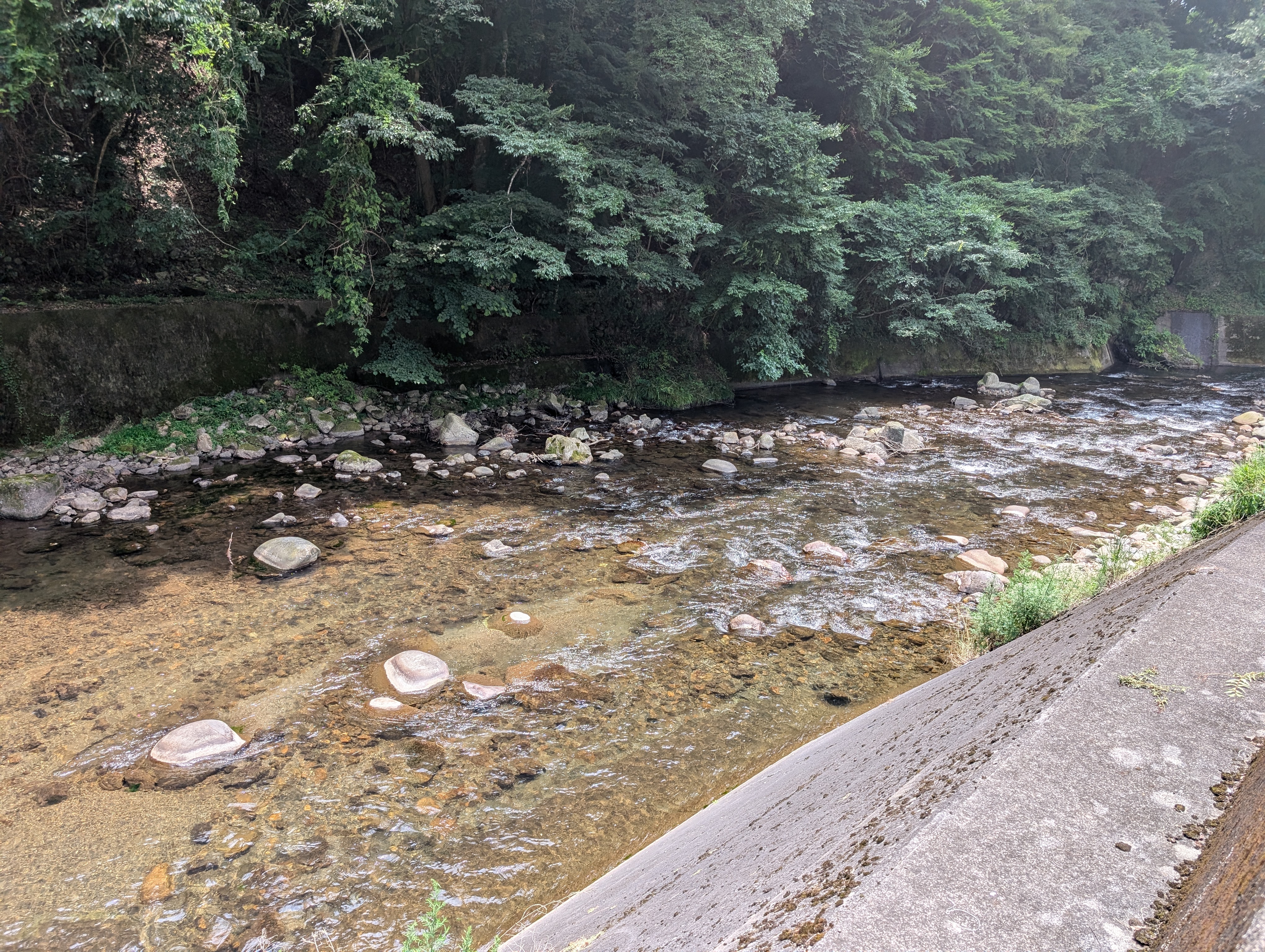 天気予報で夕方前から雨がかなり降る予報だったので、早めに出発しようと予定を立てていましたが、まさかの2度寝による寝坊で結局いつもと同じ昼前に現地到着。新しいポイント開拓をしていると釣りをする時間が無くなるので、「桂川支流の葛野川のよく行くポイント」に直行。前回より少し減水気味で、先行者が4名入っていたので、前回のような移動しながらの拾い釣りは無理そうで、人が入っていない下流側の小さな瀬に入りました。