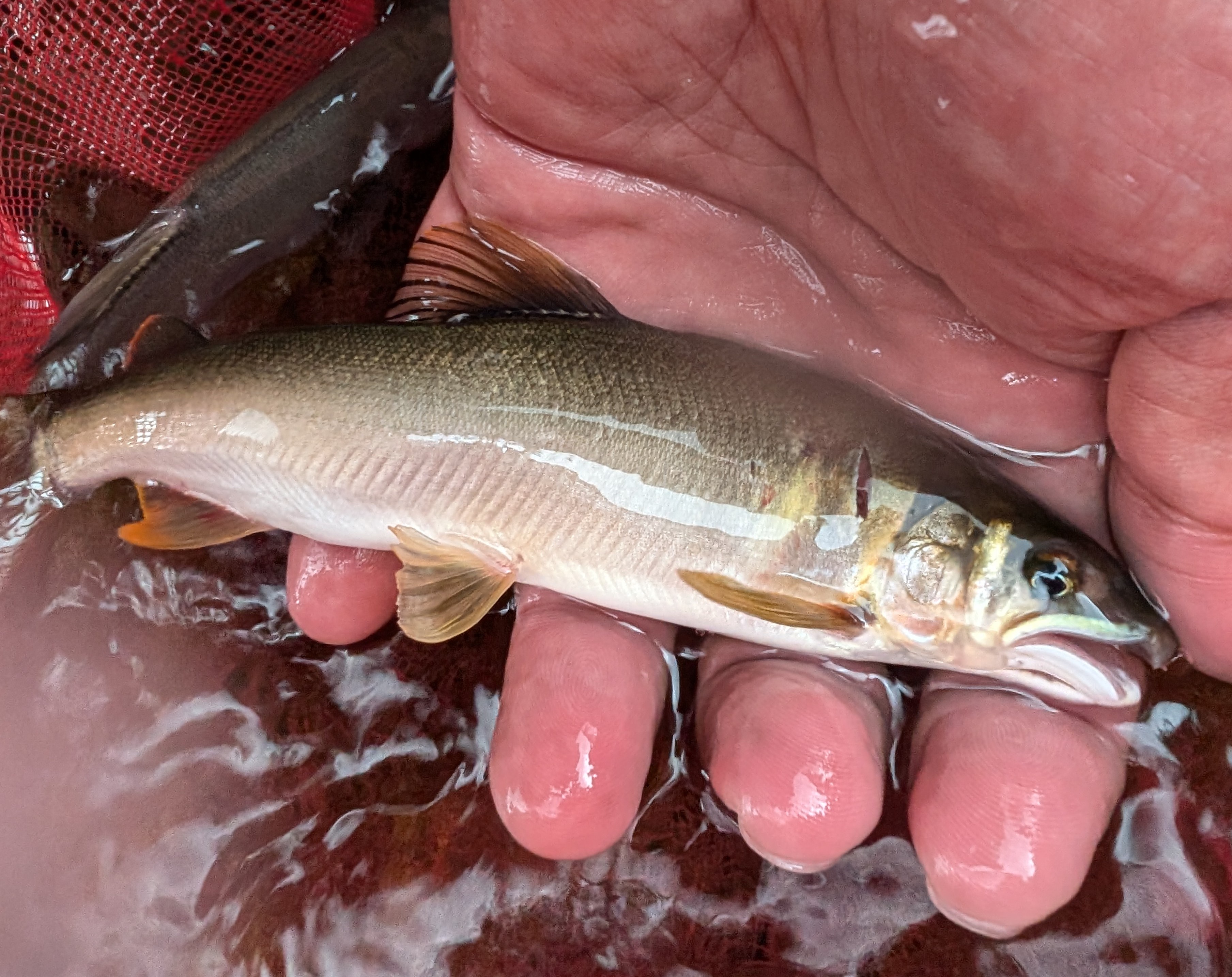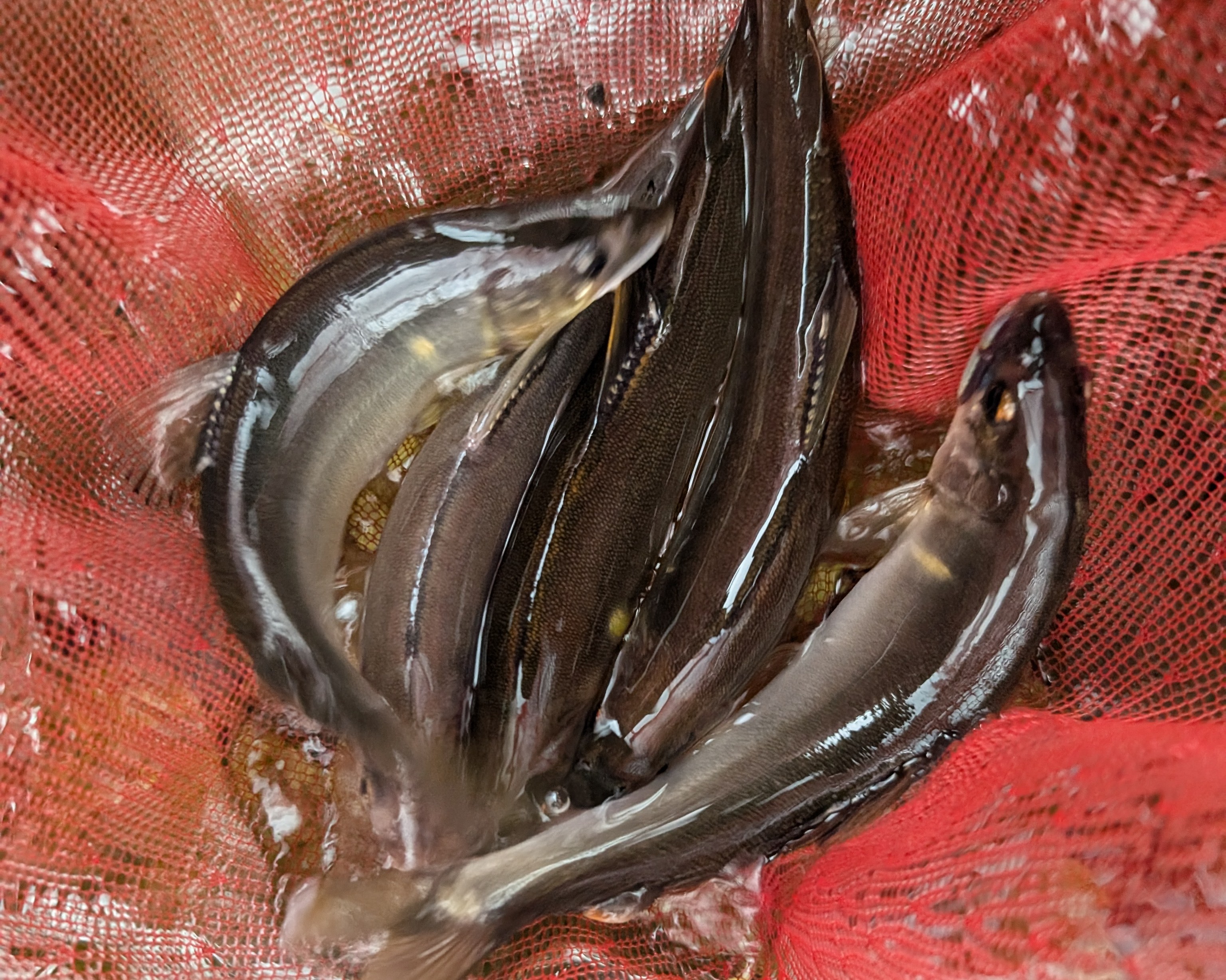 が、しばらく引いたり泳がせたりするも反応なし。前回はポツポツ見えた鮎も全然見えません。対岸ギリギリや石と石の間の狭いスペースを攻めて16~17cmサイズを何とか2匹釣るも