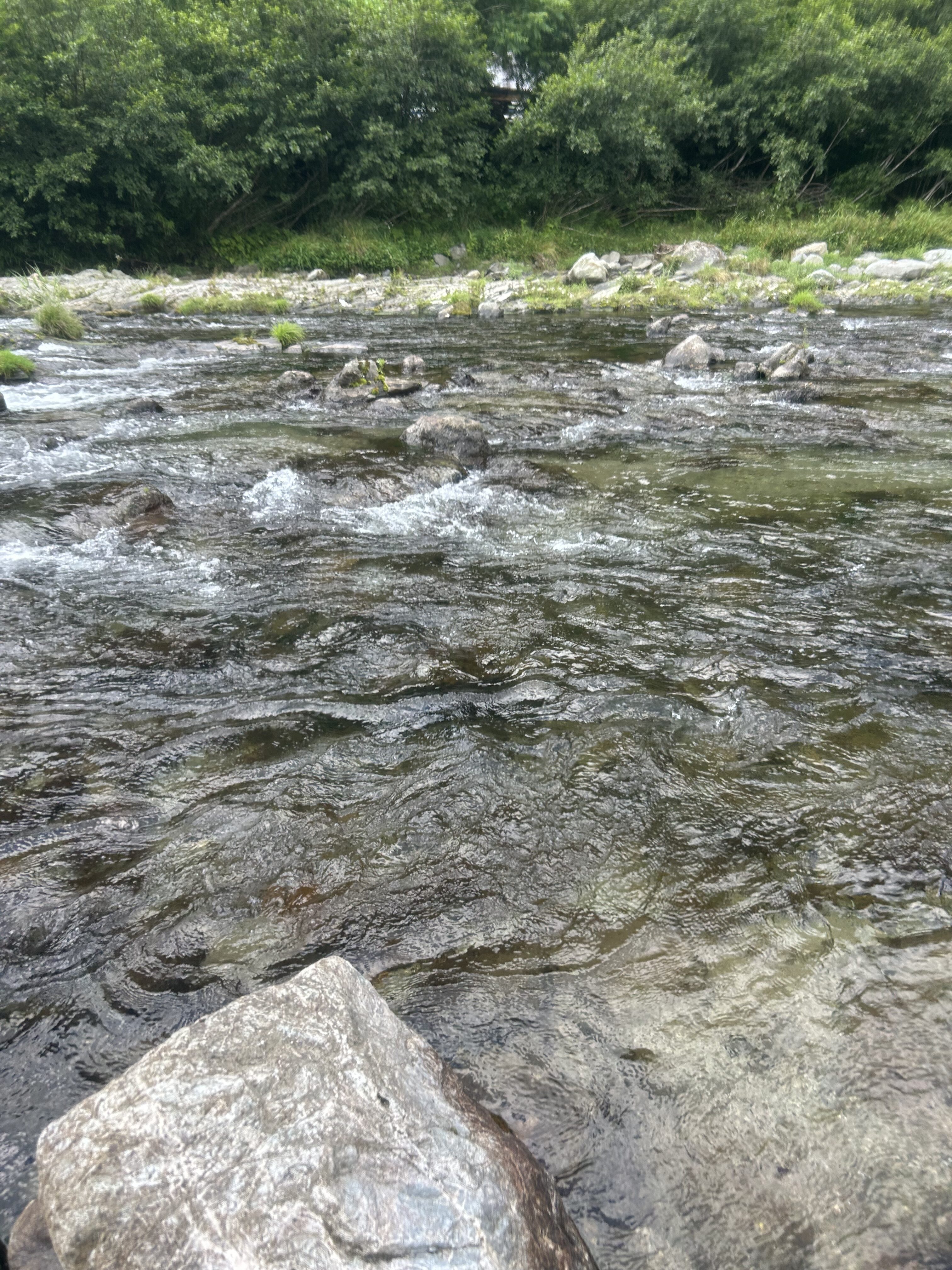 瀬尻の方で1発掛かりました。ふと川の奥のほうのドチャラを見てみるとそこだけヤケに綺麗な石に見えます。ちょっと入れにくい場所なので空中輸送でオトリを送り込むと一瞬でドンっ!また入れ替えてピューン!7匹の入れ掛かりでした。畳2枚くらいのスペースでこんな掛かるとは。竿抜けだったのか…