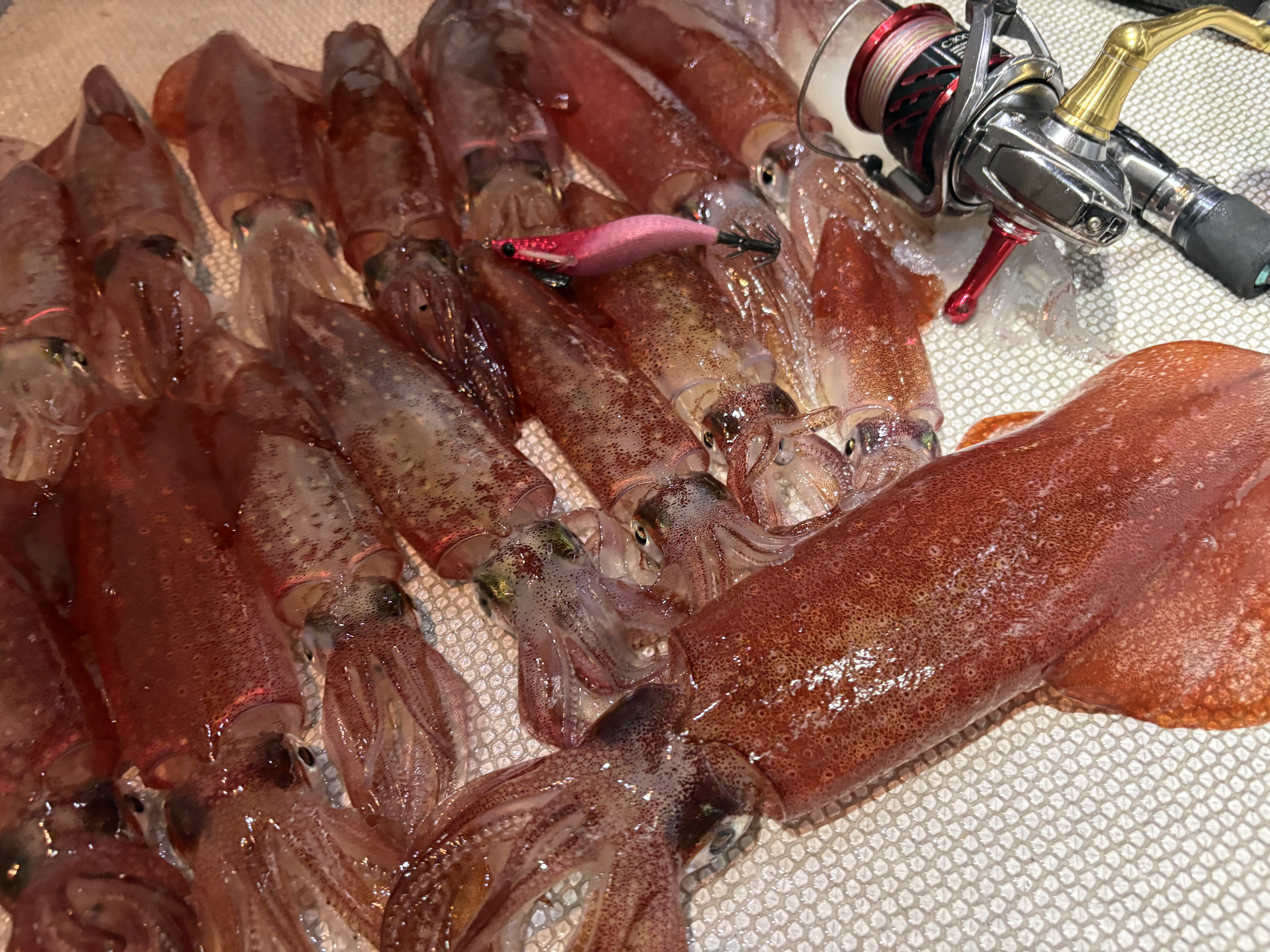2025.07.14 印刷する 舞鶴でイカメタル61杯! 魚種 マイカ/アカイカ/ケンサキイカ/マルイカ サイズ 新子〜大剣 数 剣先イカ61杯 釣り方 ☆イカメタル/オモリグ 場所 京都府 スタッフ 大矢涼太郎 店舗 高槻店 釣行日 2025.07.10 コメント 高槻店大矢です! またまた、京都舞鶴トップスジャパンさんにお邪魔し、イカメタルに行ってまいりました! 新子も増えてちょこちょこいい話を聞きますが、、、 ポイントまでは出船して1時間ほど この日は出船時からかなり風が強くて1時間出船を遅らせて、ポイントについたのは8時くらい 暗くなりはじめていたので、すぐはじめましたが、かなり波が残っていてどんぶらこっこ💦 メタルでは勝負にならんな、、と思ってオモリグで枝70cmからスタート!すると1投目からヒット!可愛い新子サイズ😍 その後も続きましたが、枝を130cmに変えるとさらにペースアップ♪棚が変わるタイミングもありましたが、テンポよく拾っていき、最終61杯で竿頭を取れることができました🔥 舞鶴でこれだけ釣れたら大満足です😊 使用した釣具 ロッド エメラルダスX70mls リール ストラディックci4c3000