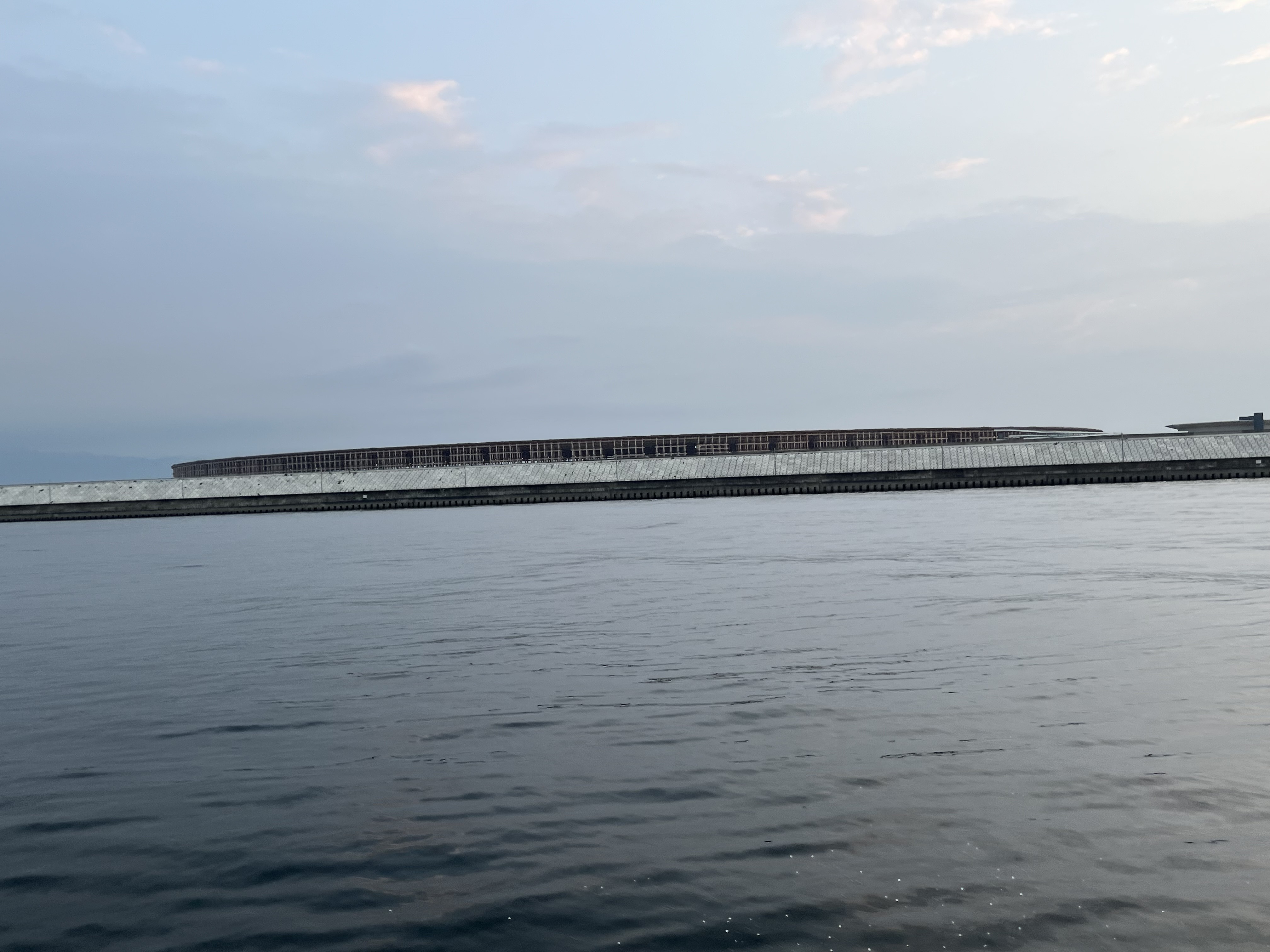 当日は風予想でしたが出航時は非常に平穏な天気で万博会場を横目に見ながら釣り場に向かいます。