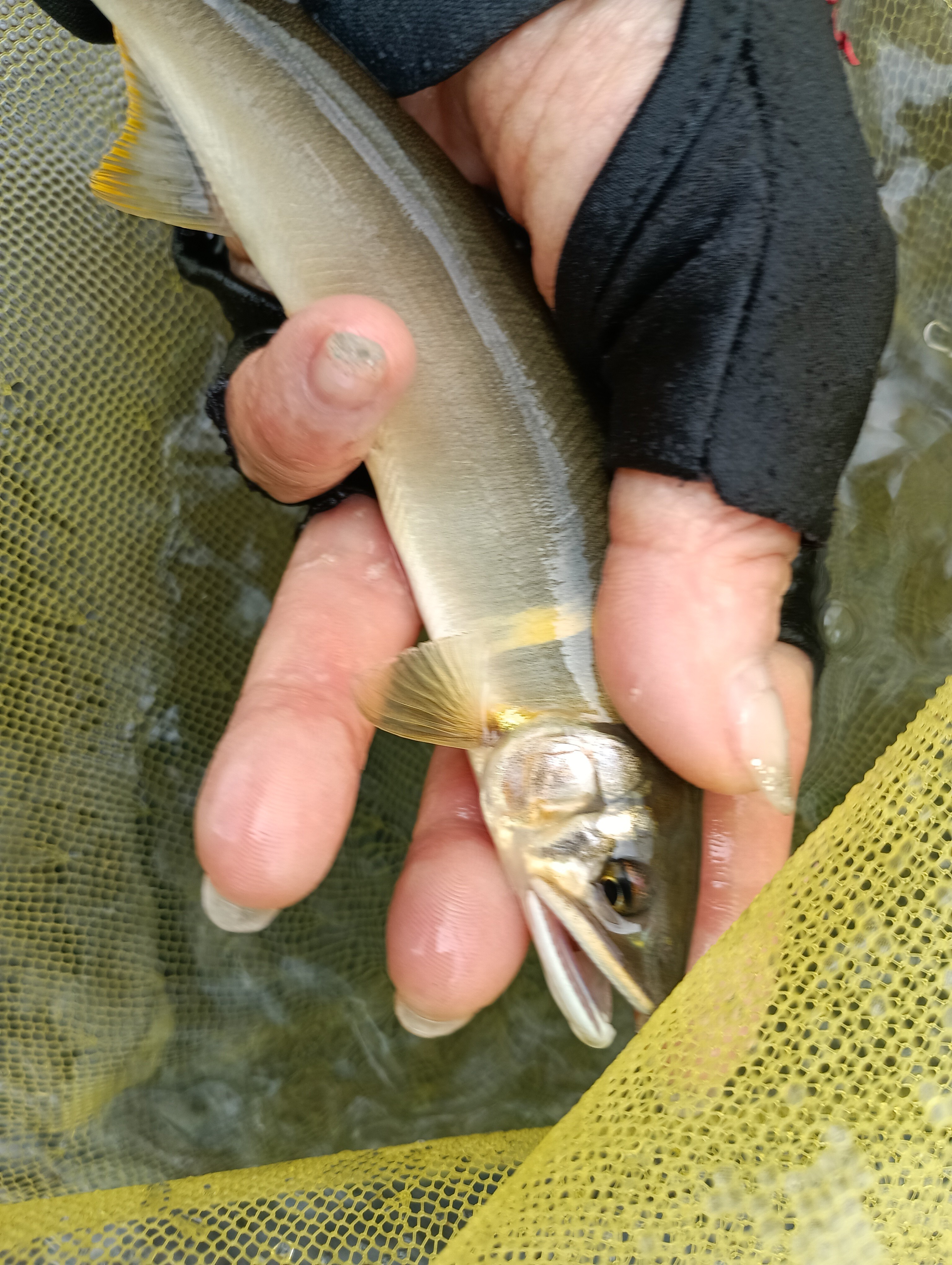 2025.07.18 印刷する 爆風の愛知川下流♪ 魚種 アユ/鮎 サイズ 13~18センチ 数 鮎/22匹 釣り方 友釣り 場所 滋賀県 天候 晴れ スタッフ 平川葉子 店舗 堺店 釣行日 2025.07.16 コメント 今日は滋賀県の東側の愛知川下流にやってきました。 愛知川の上流は結構好きな川で何度か行ったことはありますが、下流は初めて。 愛知川漁協に10時前に到着。 ここは自販機で券や囮代を支払い、記載されてる電話番号に電話をして、ロック番号を聞き、ロックを外して自分で囮鮎をすくうという無人システムですが たまたま漁協の方が居られたので囮を入れて頂きました 下流は初めてなので、ポイントのパンフを頂き、 下流部の堰堤下から入ります 車を降りるとかなりの風。 竿はシマノ友鮎7mにしました。 降りると一人先行者の方が居り、声を掛けて下へ向かいます 川幅は5~6mとそれほど広くなく、意志はやや大きめの砂混じり。 瀬が100m以上続いてます。 かなり下にも一人先行者の方が居られました。 上の方から20m下から始めます。仕掛けは複合の005から。 流芯部から外した筋から狙います。 筋を変えると…キツいアタリで18センチの良型の鮎。 流芯、弛み、トロどんどん打つとどんどん釣れます。しかも湖産鮎なのでアタリもキツくめちゃくちゃ走ります 下に居られた方が釣り上がりながらすれ違うときに挨拶しました。 見た感じでもかなり掛けておられました 下の方は左岸側から釣りされてたので、右岸側を釣り下ります。 時折、鵜よけの線が貼ってあり注意が必要です。 よく掛かって楽しいのですが風が強すぎる(笑) 7mの短竿が折れるかと思うほどの爆風でした 予報では5mほどの風となってましたがそれ以上だと思います… 10時半くらいから始めて、13時に小休止して休憩し、気付くとお客さんは誰も居なくなってました(笑) それからぽつぽつ掛けて、なかなか風の中の釣りがしんどくなってきたので14時にあがることに。 調子に乗って釣り下りましたが 右岸側はずっと藪で(笑) 上がれるところが見当たらず(笑) 仕方なく川を上がりました。これは結構キツかった💧 石がそこそこ大きく、ヌルヌルでかなり歩きにくい感じでした 九頭竜の勝山の歩きにくさに似てます 垢腐れてかなりヌルヌルでした。 鮎を検量すると込まず22匹でした。 大きさも瀬の流芯では20センチ近いよく太った子が掛かります 初めて行きましたがなかなか楽しめました 愛知川下流はルアーもできるので、上の方でルアーマンが2人居られました 愛知川のパンフレットを店頭に置いておきますのでぜひ、ご参考にそれてください お待ちしております 使用した釣具 竿 シマノ 友鮎7m