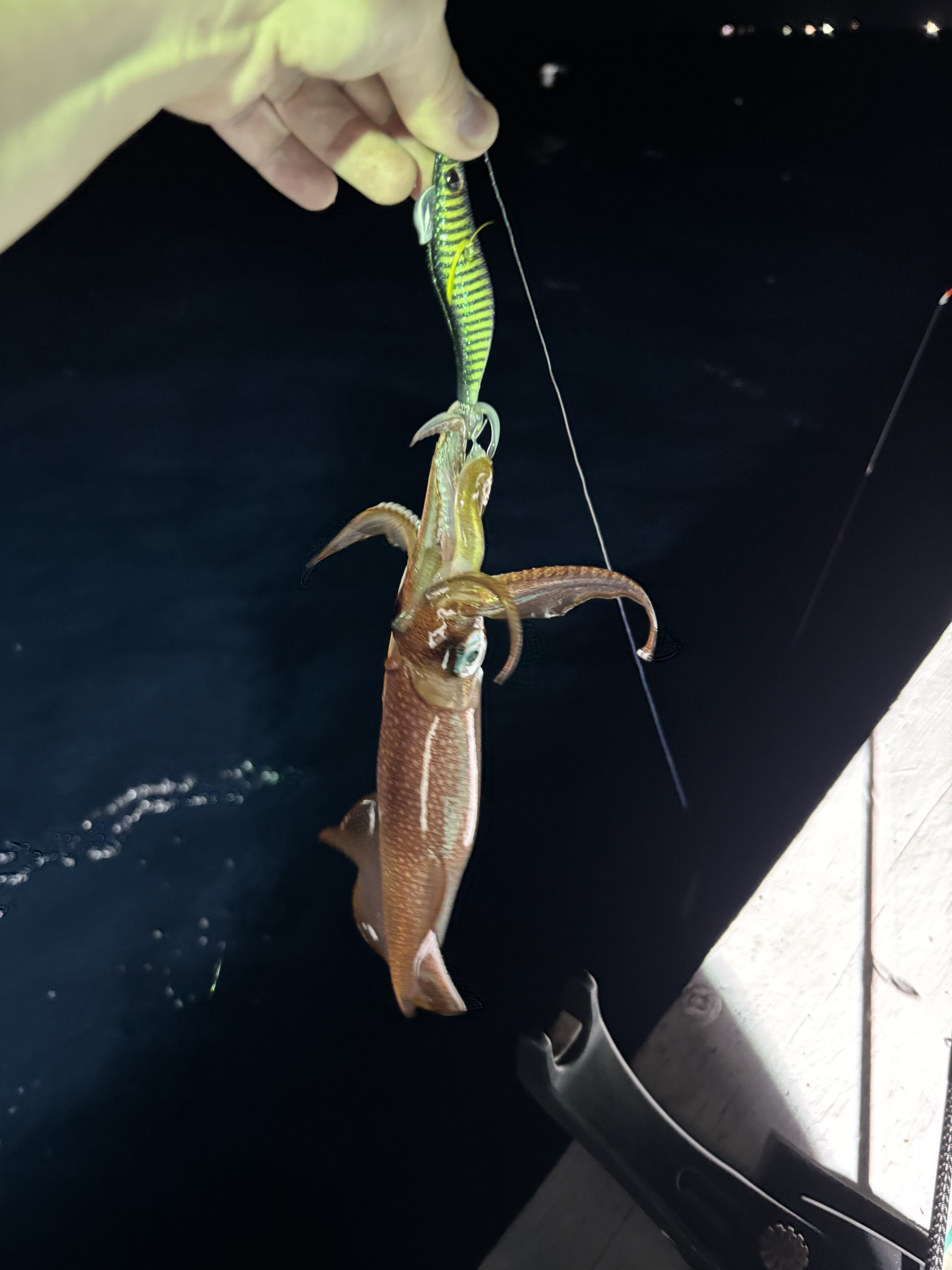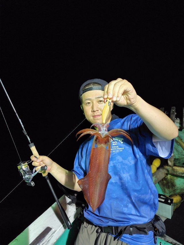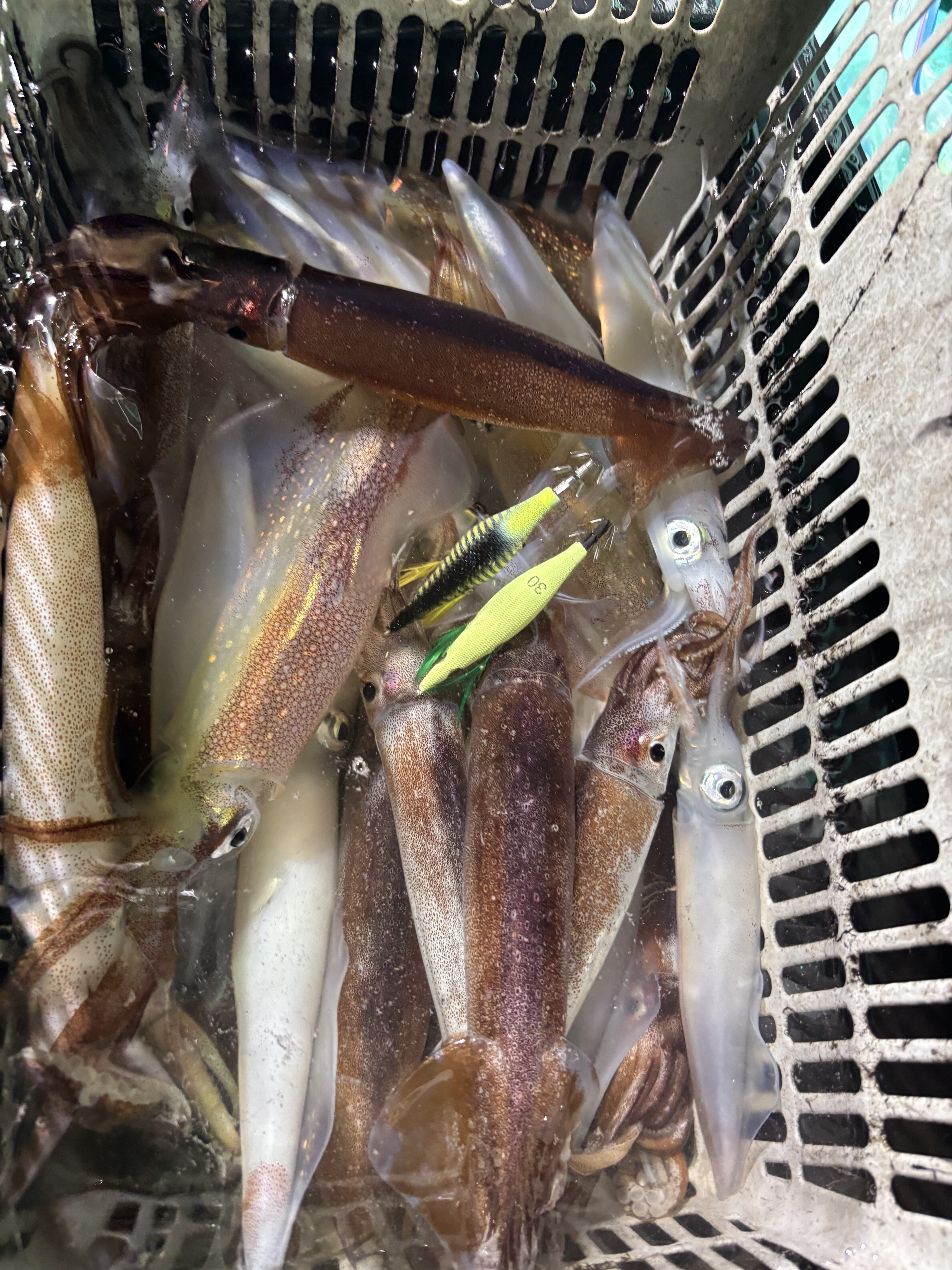 この日は船首の左舷側でやったのですが、右から左の強い潮で少し釣りにくいのもあり、苦戦しましたが、なんとかケンサキ21杯とスルメ11杯の計32杯釣ることができました。